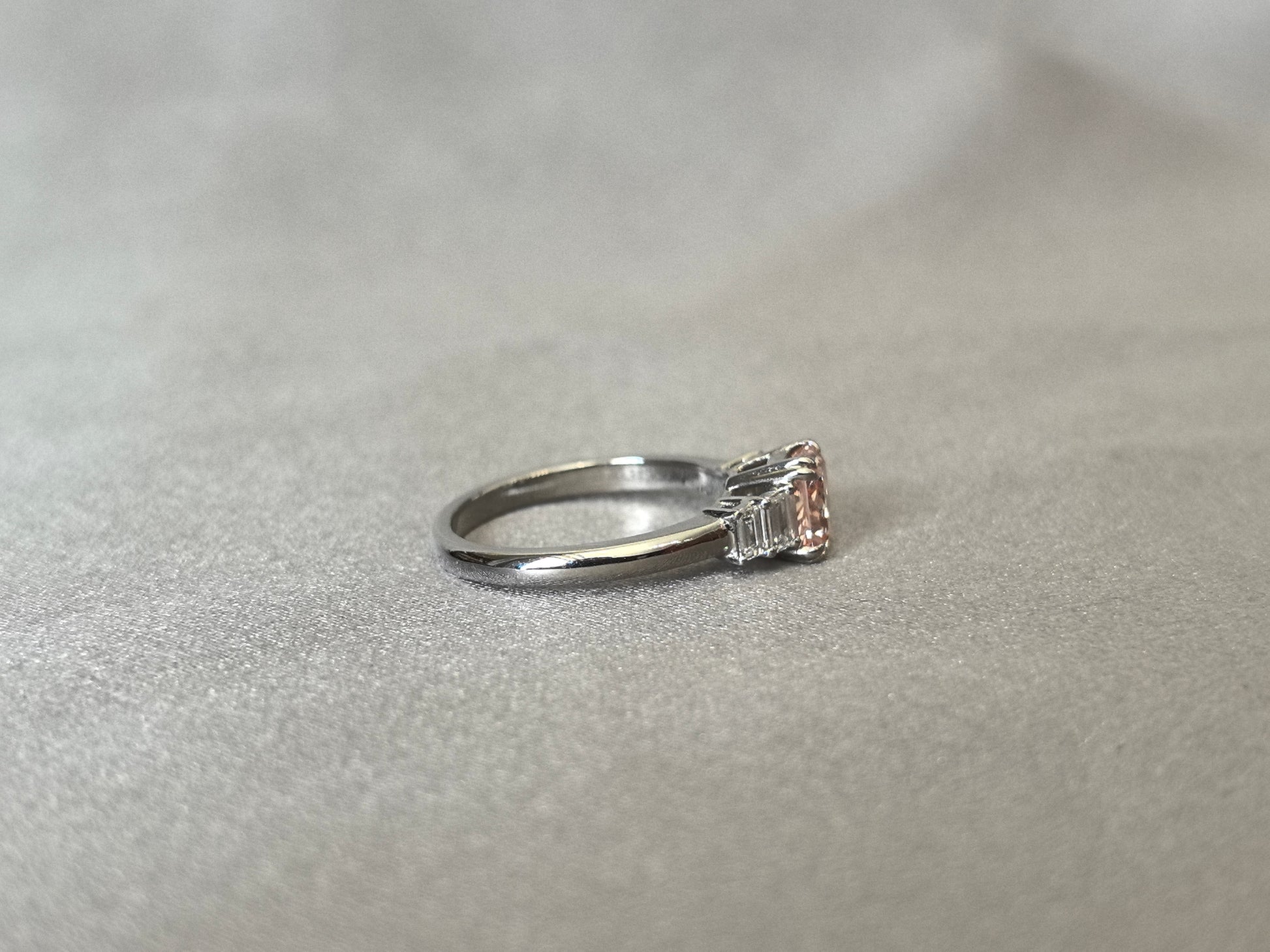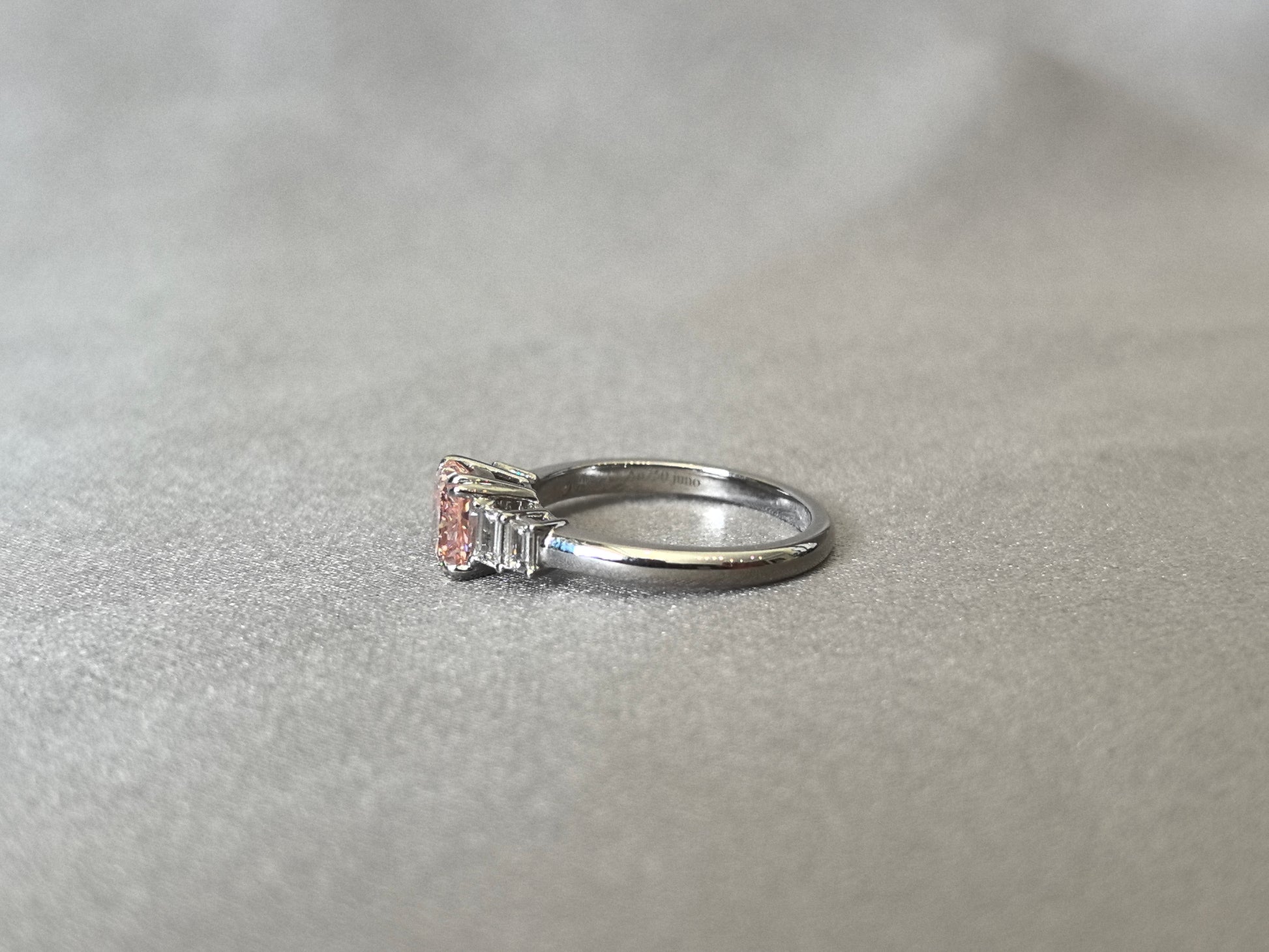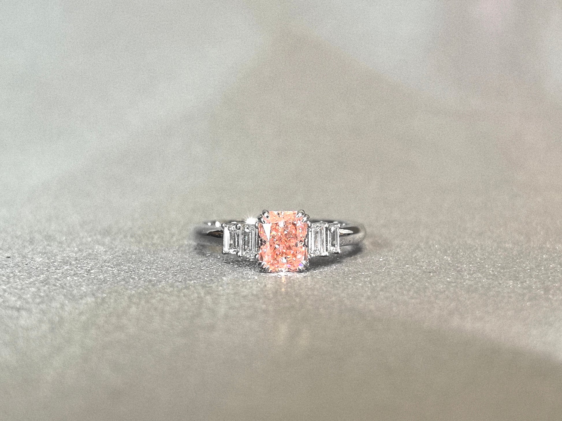1ct 3.4g Radiant Cut Pink Lab Diamond Ring | Side Emerald Cut White Diamonds | Plain Band
