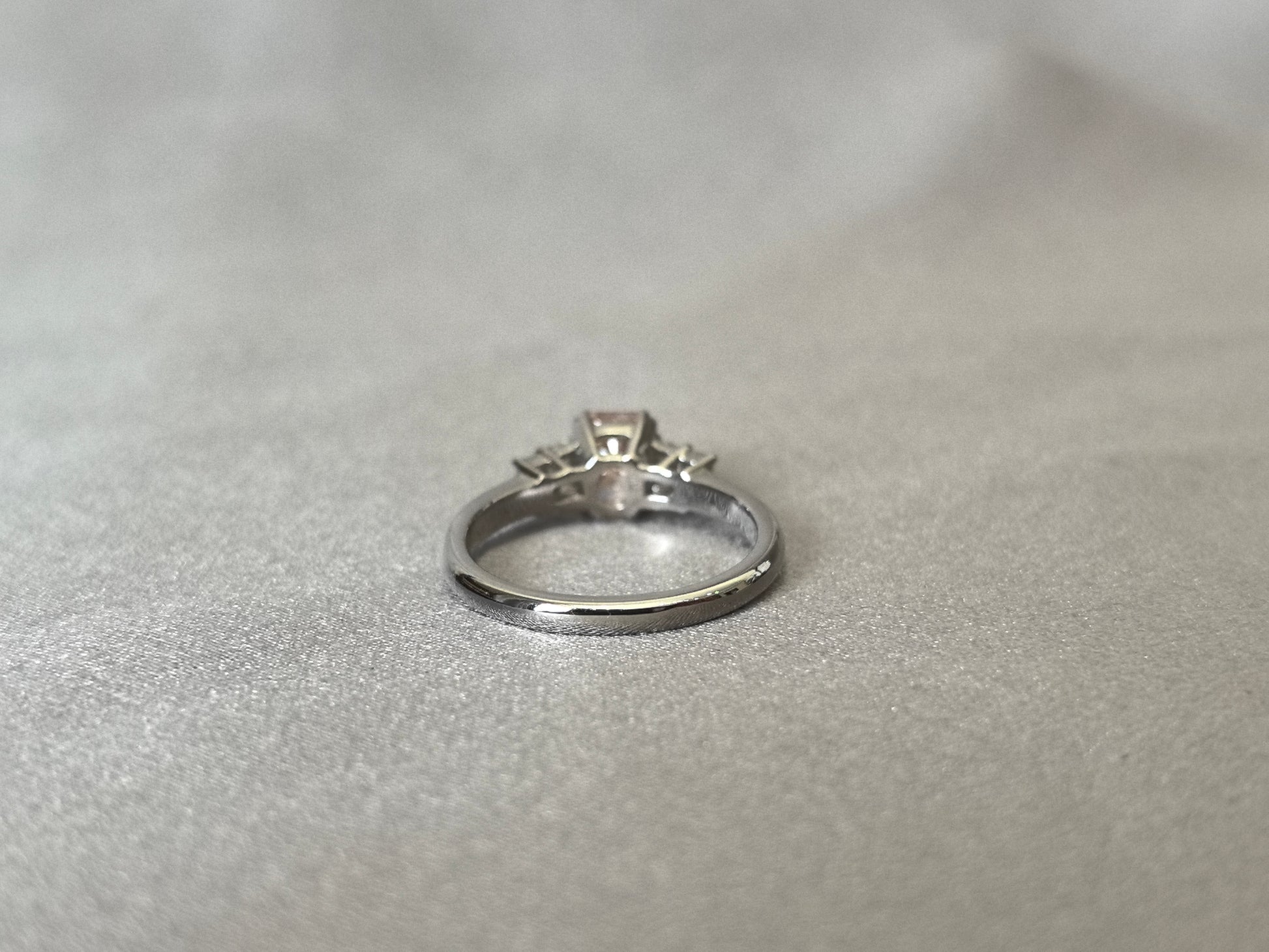 This enchanting ring features a rectangular cushion-cut pink lab-grown diamond, cradled in a delicate bow-tie setting viewed from the side. The playful yet elegant design mimics two intertwined ribbons, symbolizing eternal commitment, while the half pavé band adds a cascade of sparkle—a perfect harmony of whimsy and sophistication.