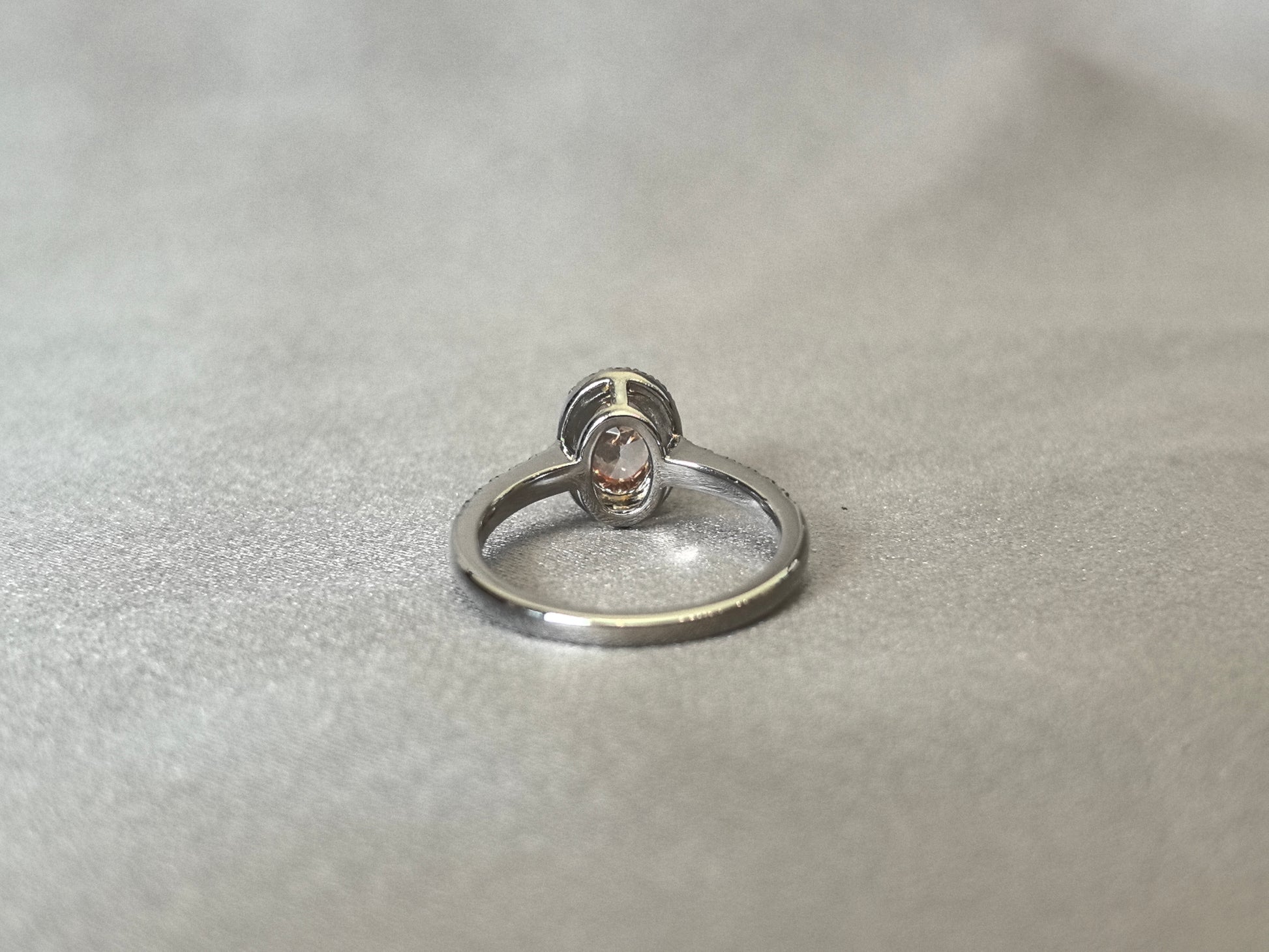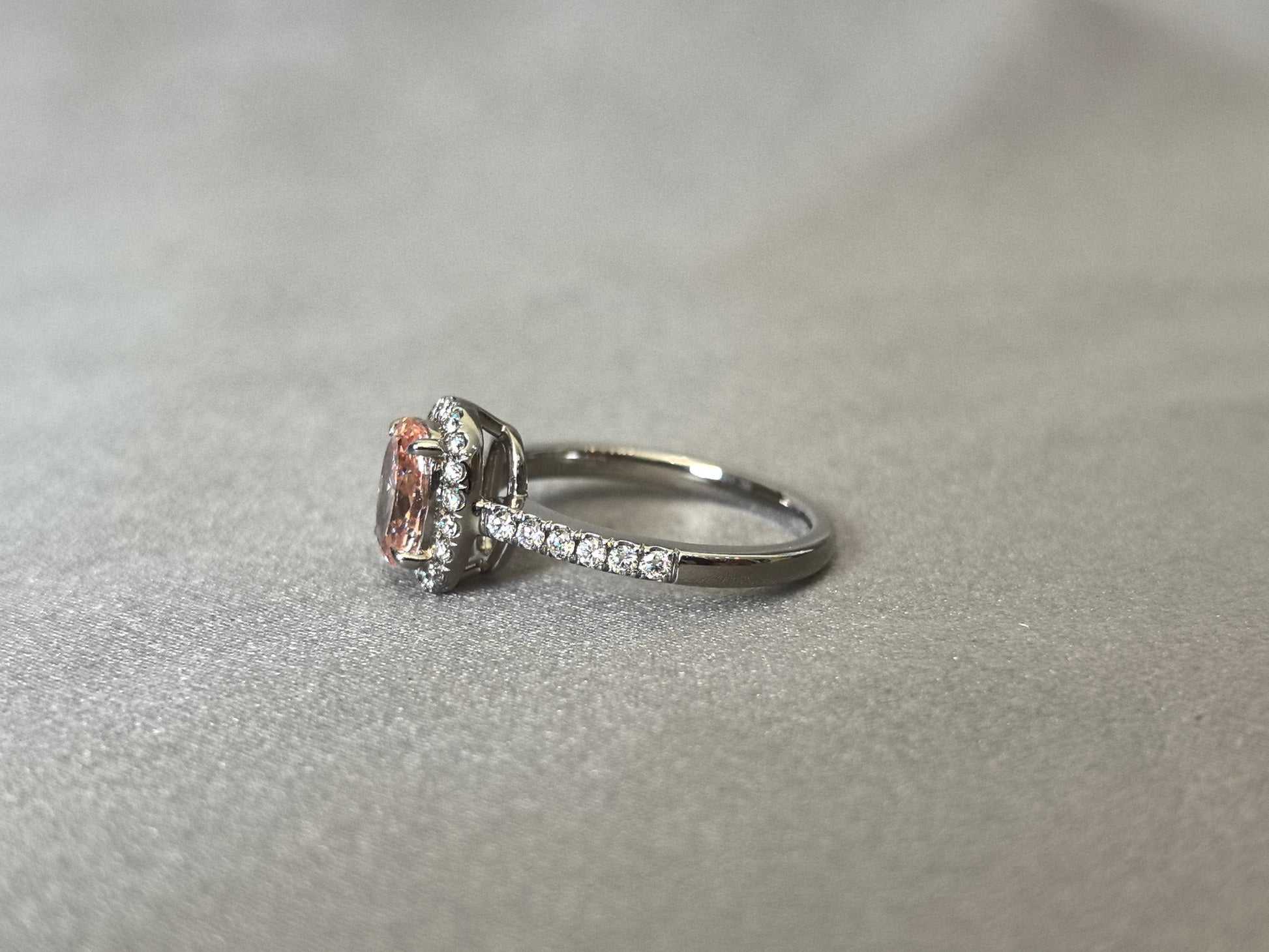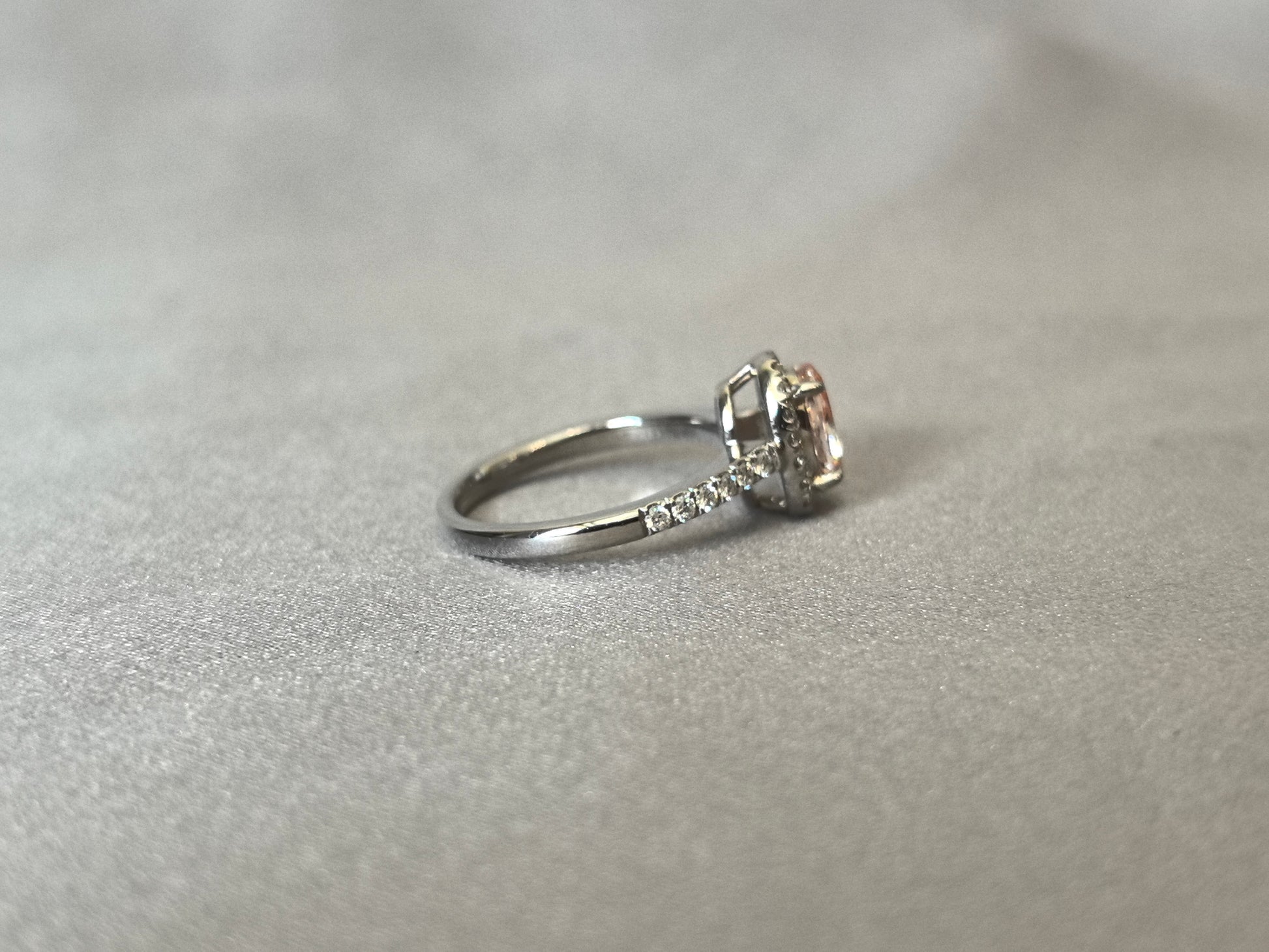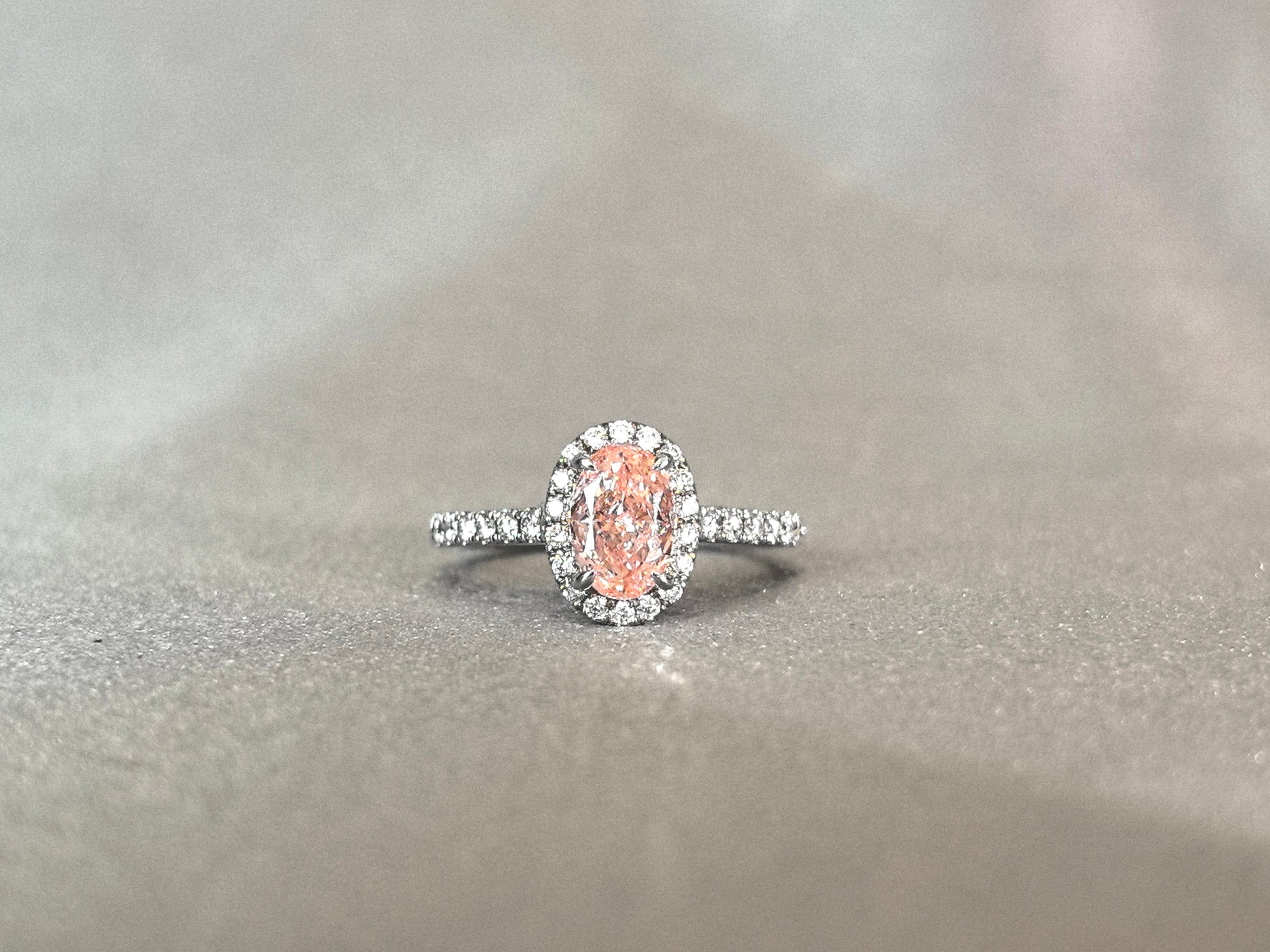 This dreamy ring features a soft-hued oval pink lab-grown diamond, encircled by a halo of white lab-grown diamonds and set upon a half pavé band. The delicate blush center stone evokes the warmth of a sunset, while the diamond halo and band amplify its glow with a cascade of ethical brilliance—a symbol of love as tender as it is timeless.