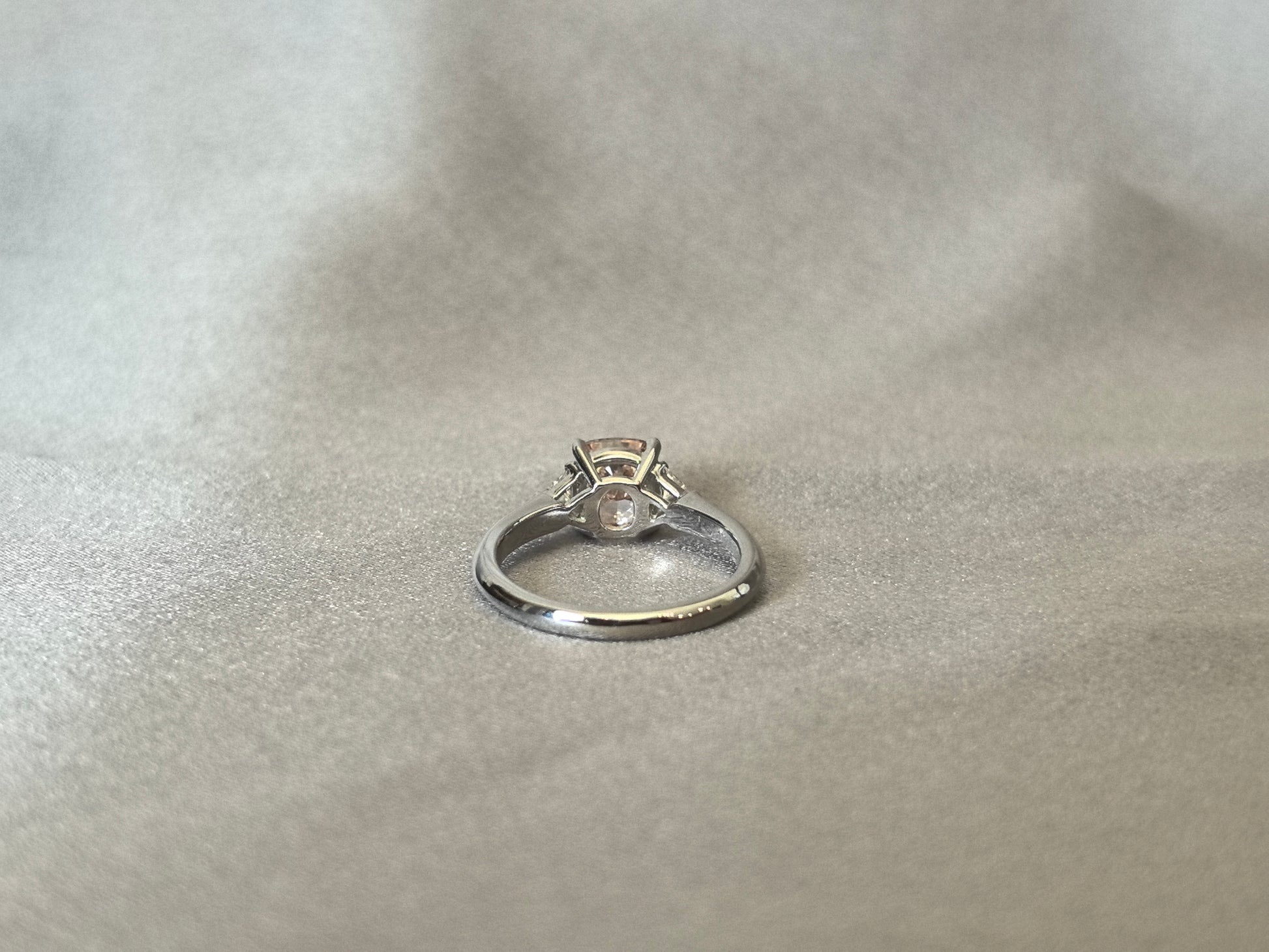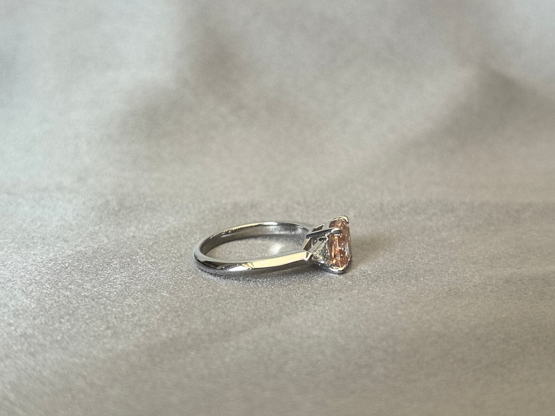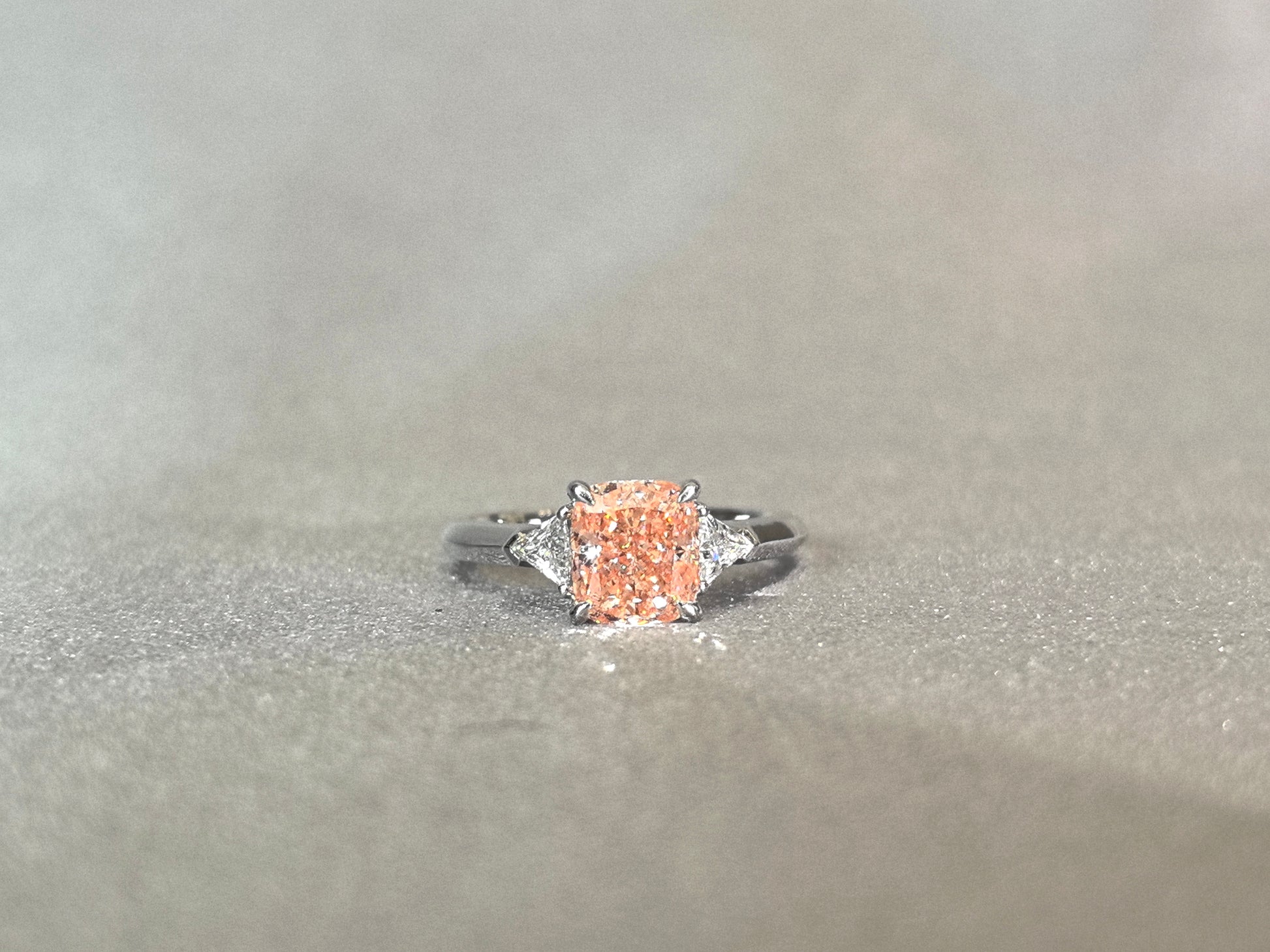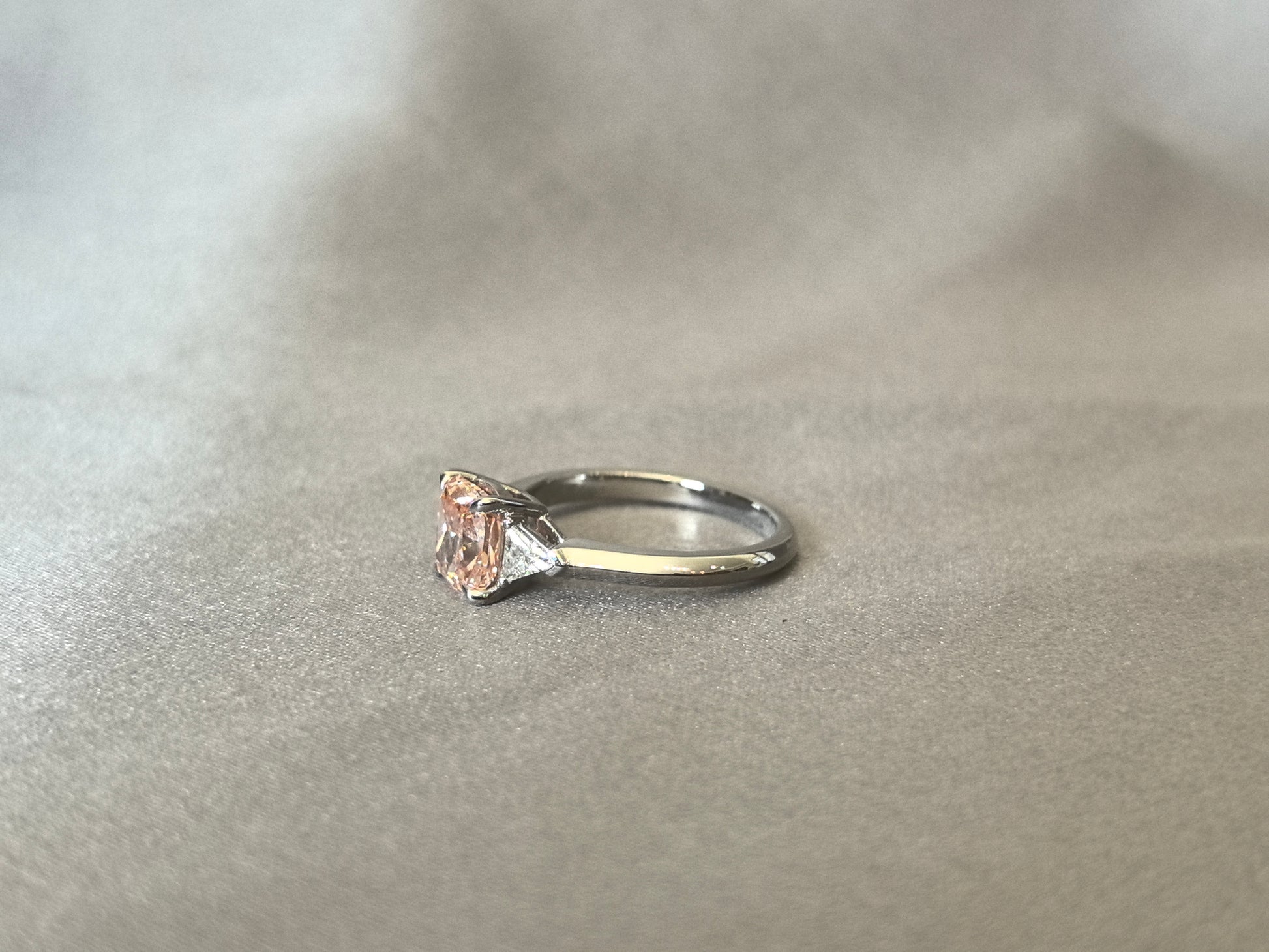This modern three-stone ring features a soft cushion-cut pink lab-grown diamond at its center, flanked by two crisp white triangle-cut lab-grown diamonds. The playful yet sophisticated design contrasts the pink diamond’s gentle curves with the sharp angles of the triangular side stones, all set on a minimalist plain band—a symbol of love’s balance between strength and tenderness.