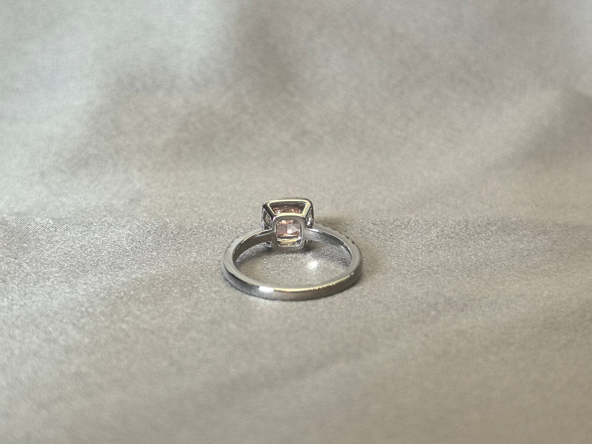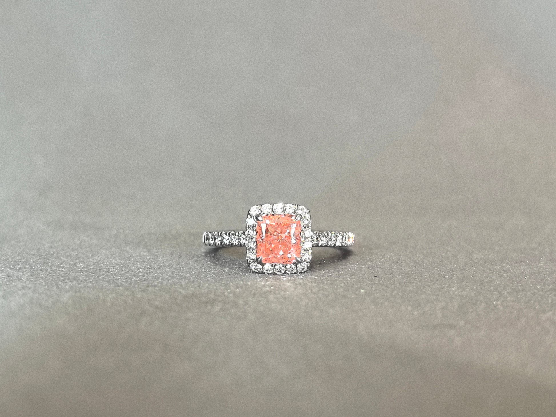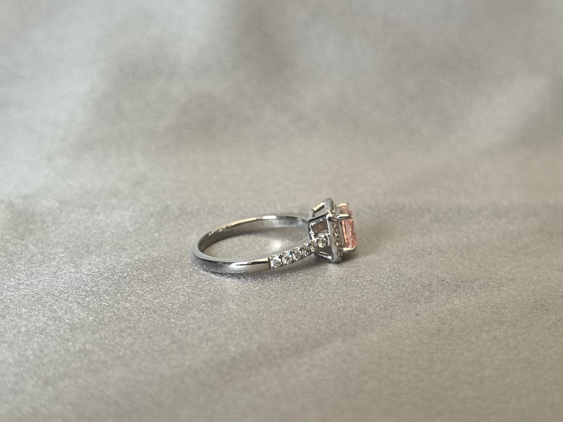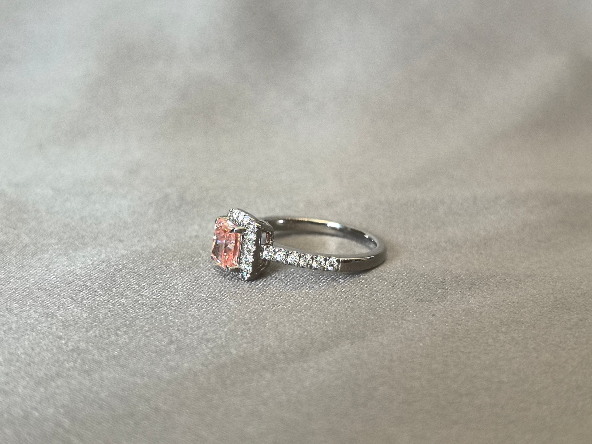This romantic ring features a soft-hued cushion-cut pink lab-grown diamond, encircled by a halo of white lab-grown diamonds and set upon a half pavé band. The delicate pink center stone evokes blossoms at dawn, while the diamond halo and band amplify its glow with a cascade of ethical brilliance—a symbol of love as rare as it is radiant.