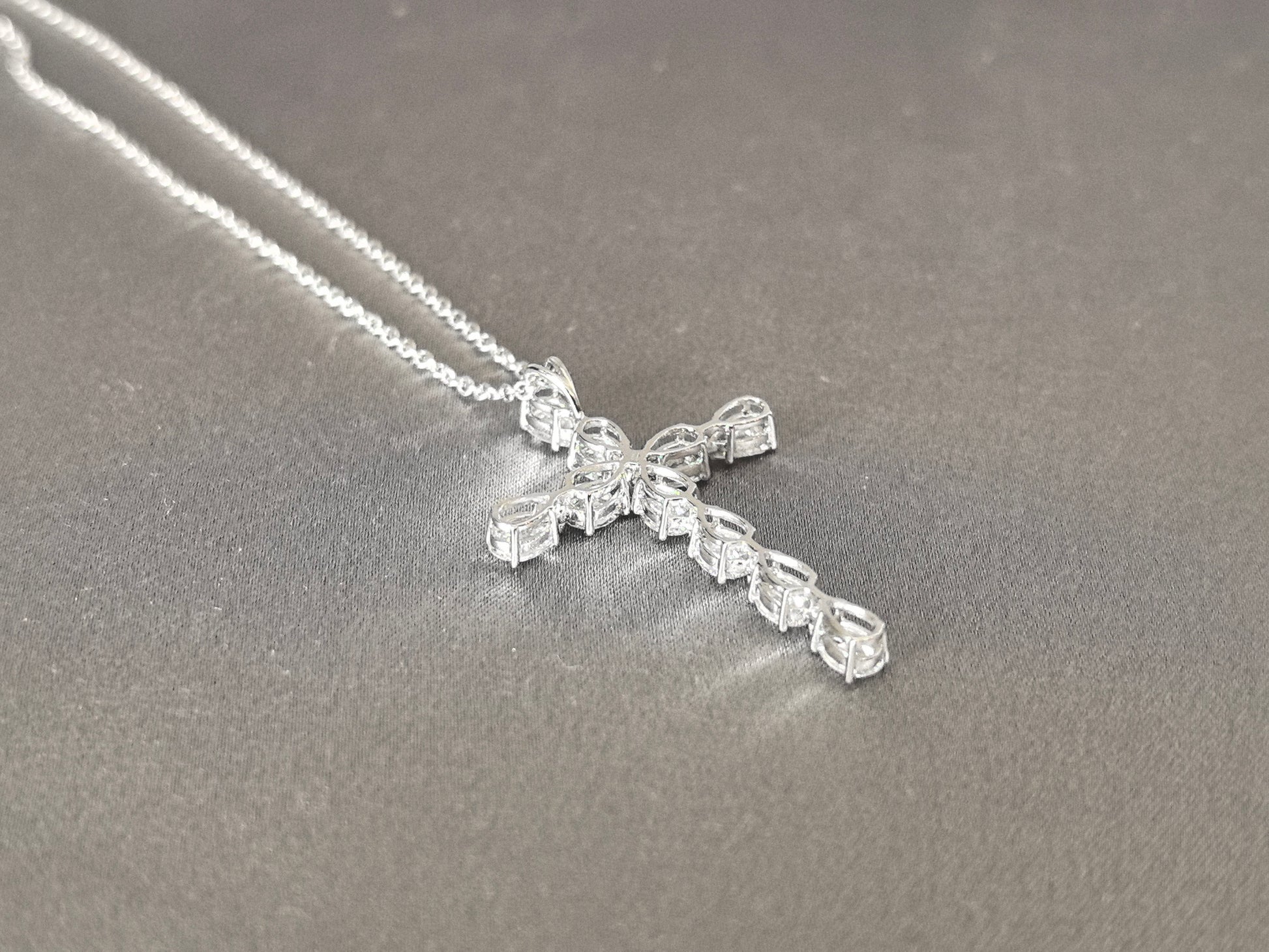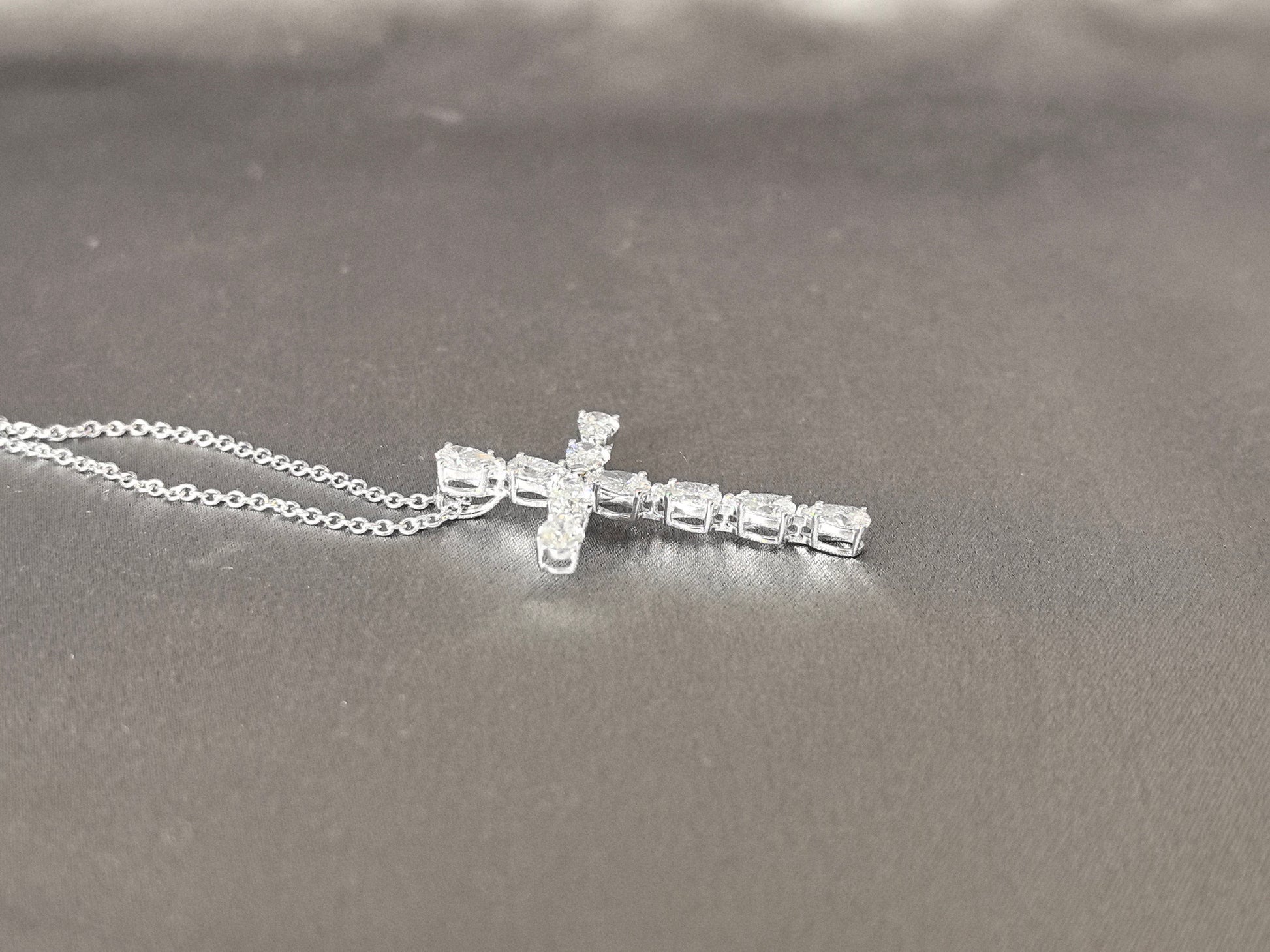 This exquisite Deca-Pear Cross 18K Lab Diamond Necklace features a unique cross design crafted from 18K gold, showcasing a stunning arrangement of decagonal and pear-cut lab-grown diamonds.