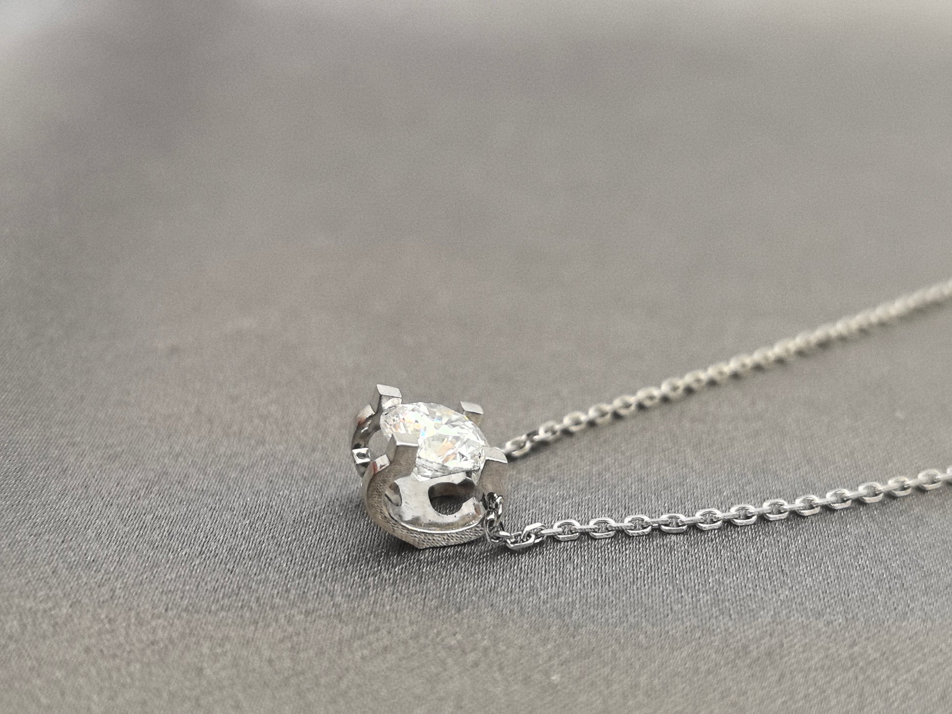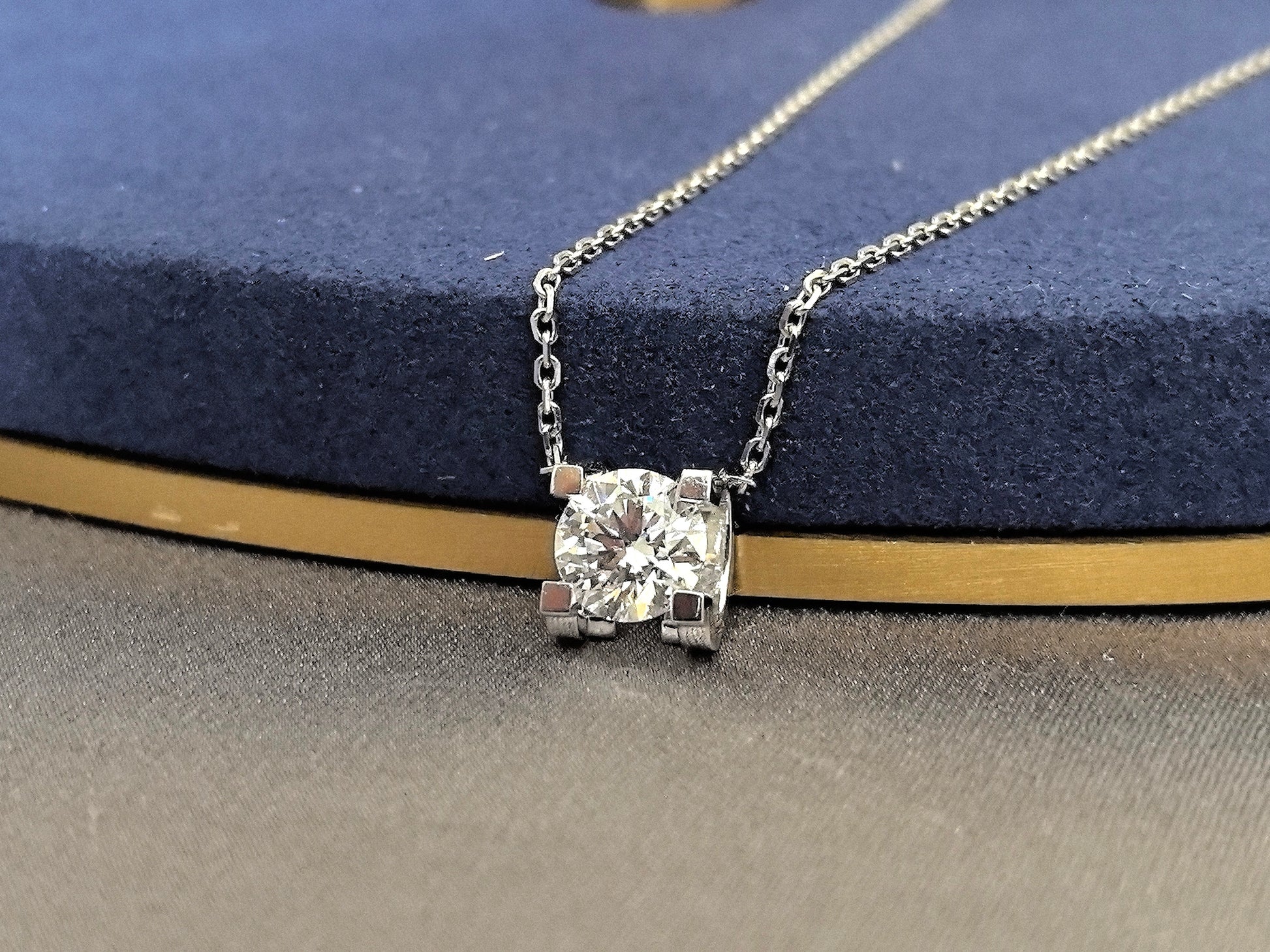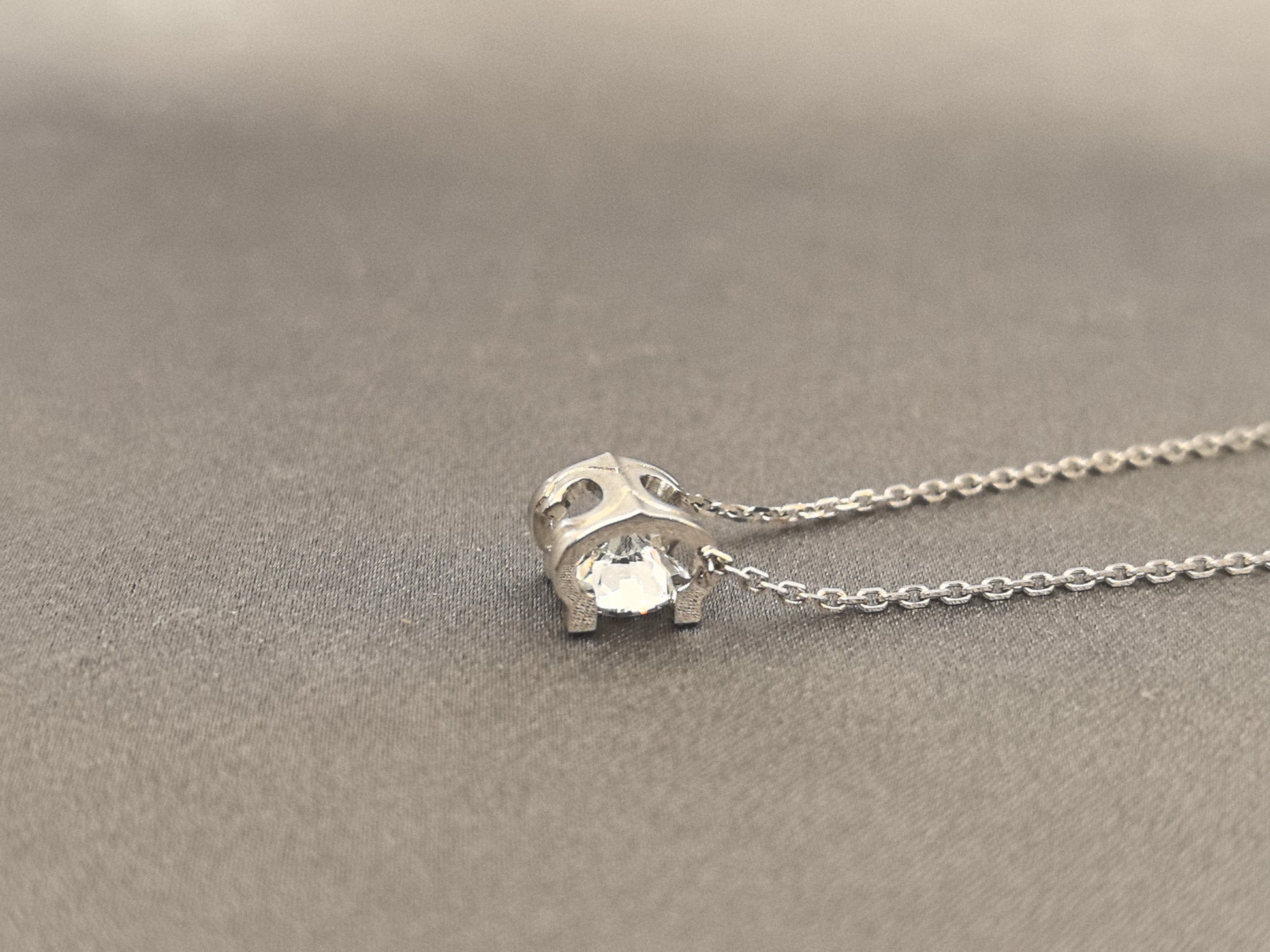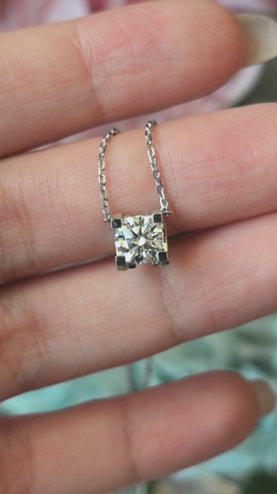 A modern twist on a timeless classic. This captivating pendant features a brilliant round-cut stone set within an architectural open-back design, revealing a mesmerizing play of light from every angle. The innovative open-work structure adds depth and contemporary flair, transforming a simple solitaire into a wearable work of art.