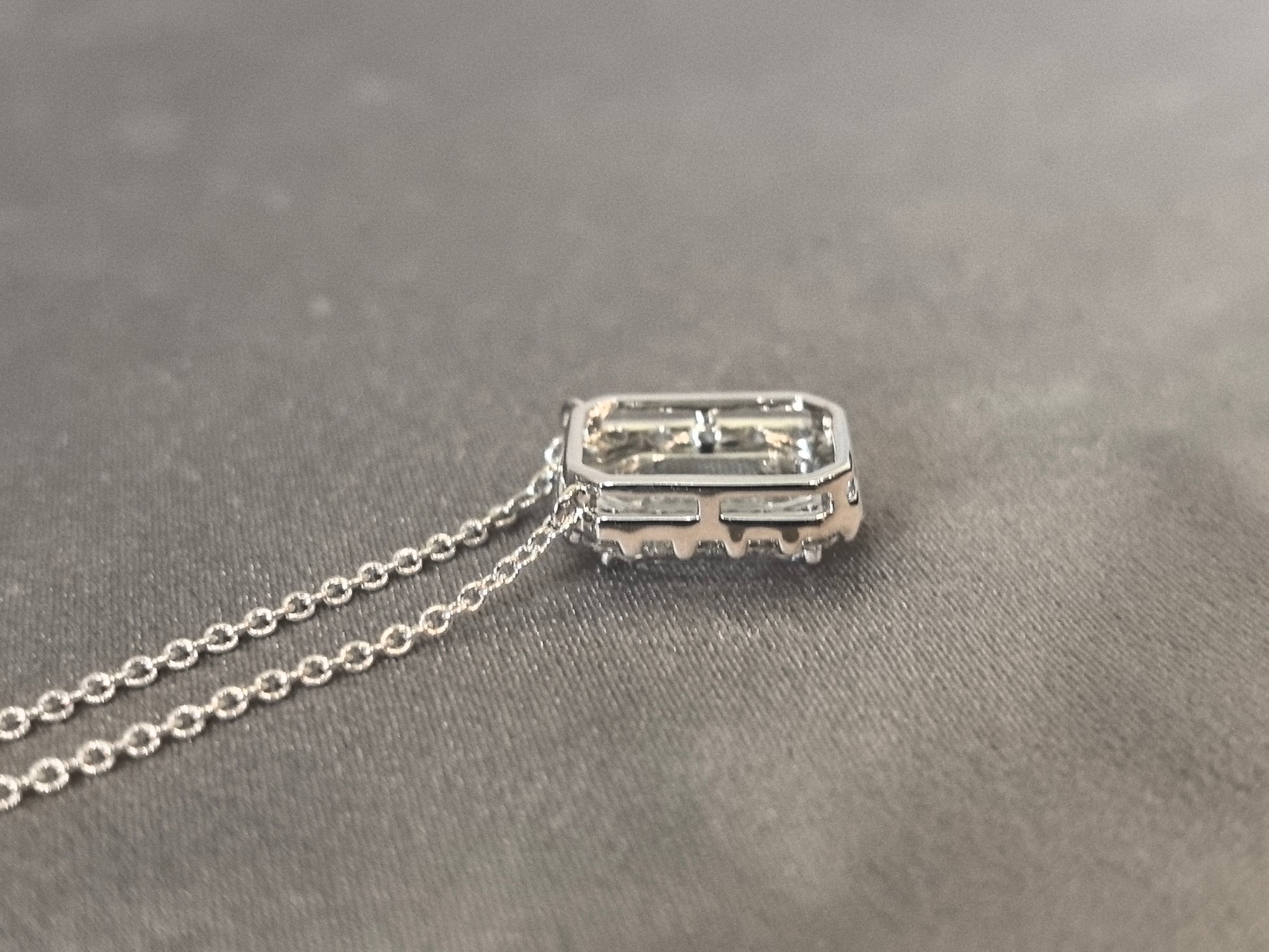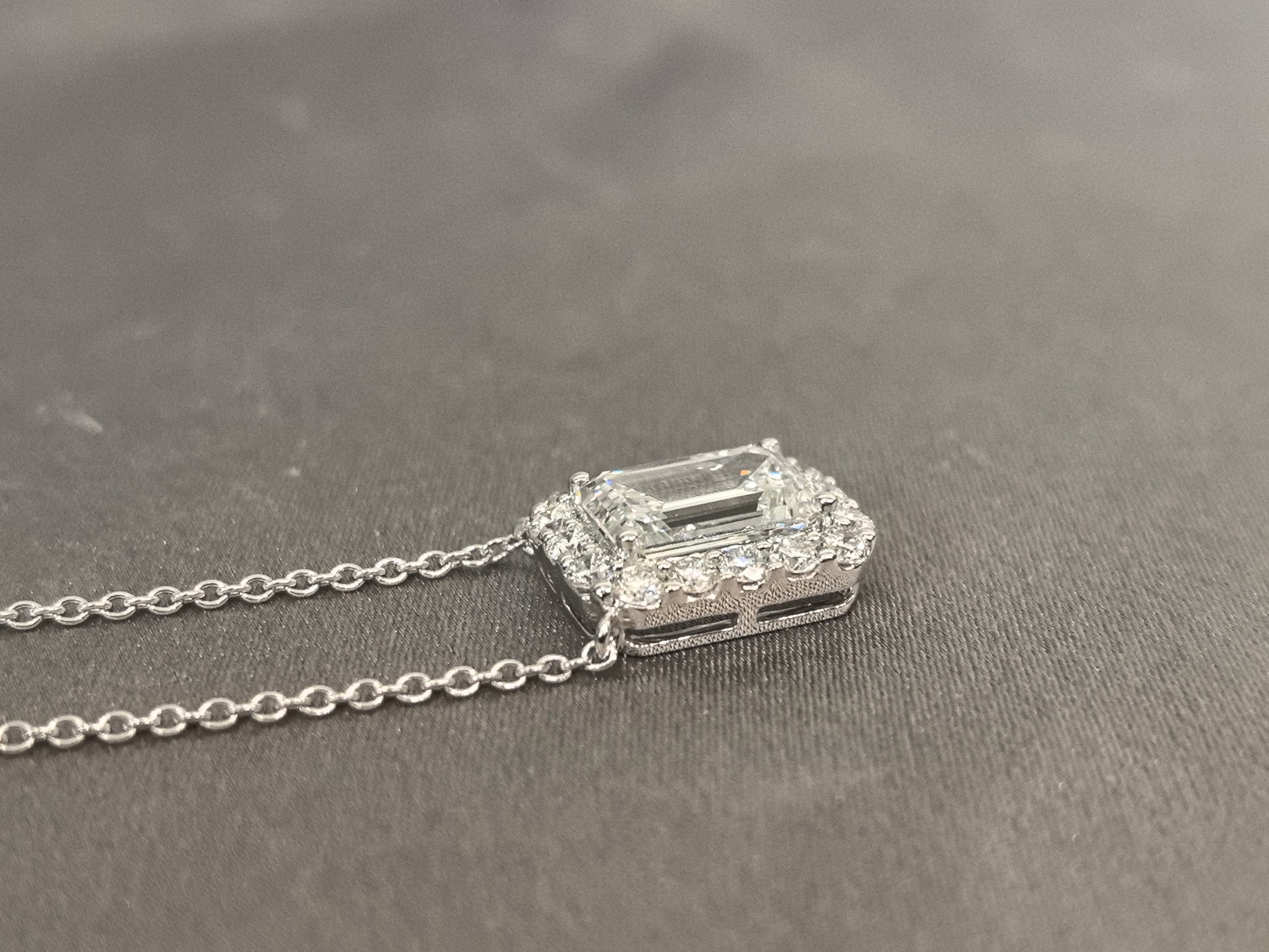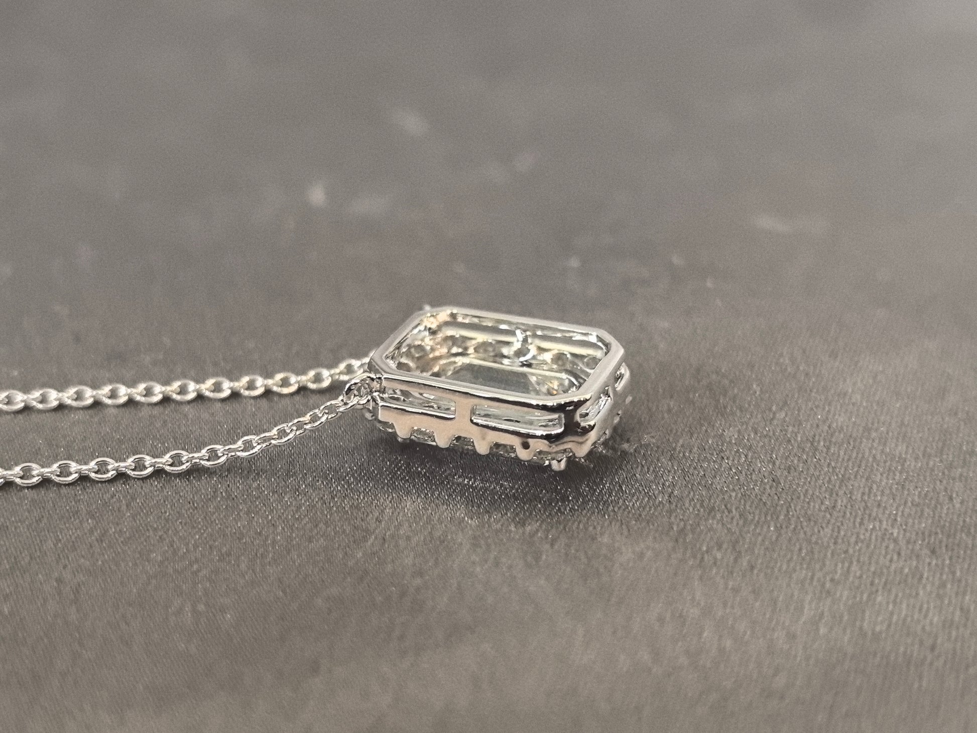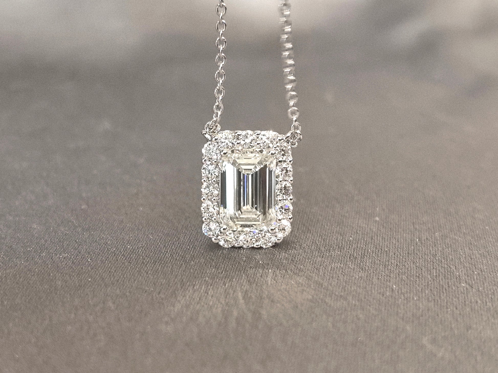 Elevate your elegance with this stunning emerald cut lab diamond pendant, featuring a sophisticated halo setting that amplifies its brilliance and allure. The geometric precision of the emerald cut center stone—symbolizing clarity and wisdom—is enhanced by a full circle of smaller lab-grown diamonds, creating a dazzling frame of light. Designed for the modern connoisseur, this piece blends architectural beauty with ethical luxury, making it a versatile accessory for both everyday wear and special occasions.