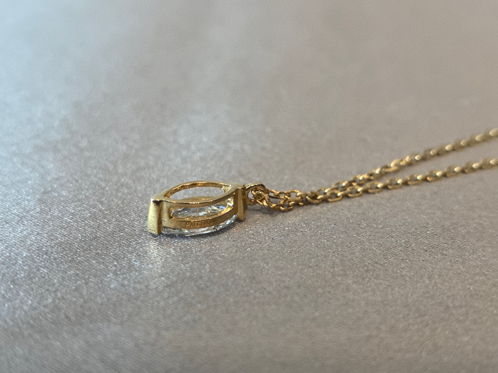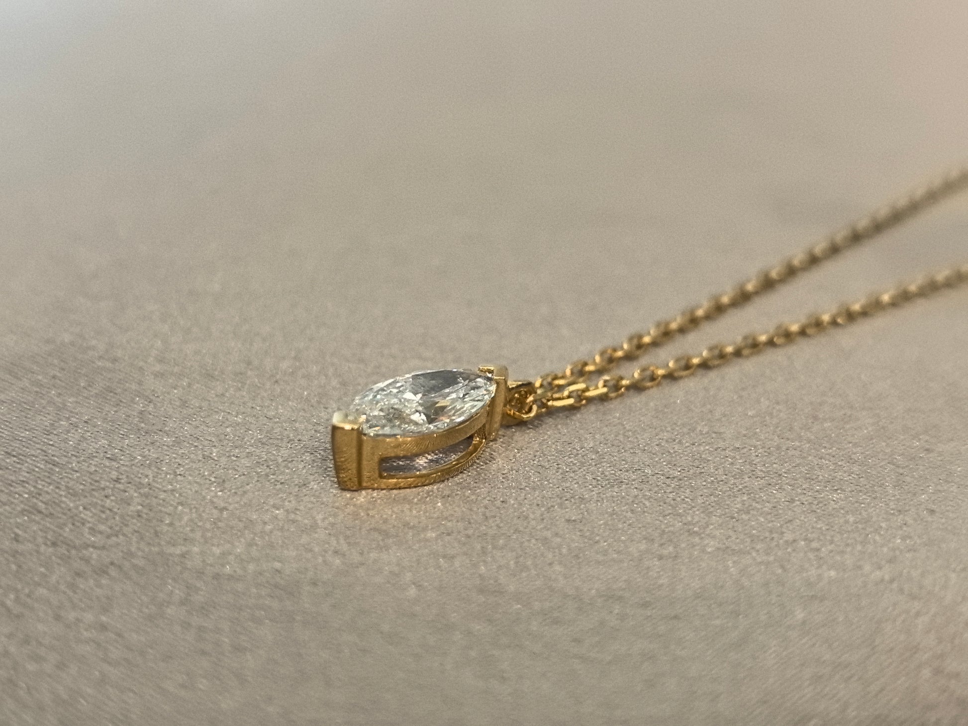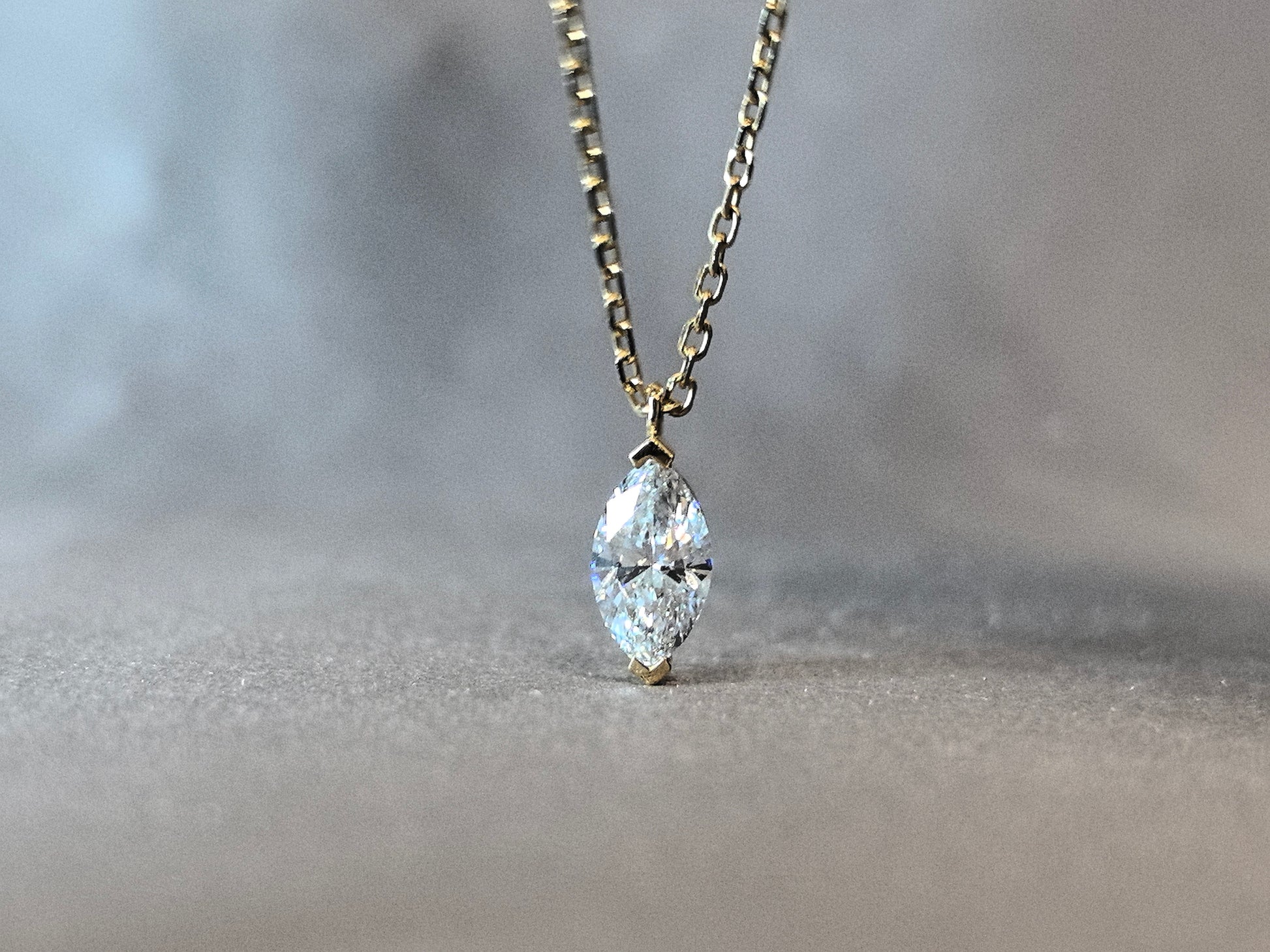 A pendant that dances between classic and contemporary. This solitaire necklace features an elongated marquise-cut lab-grown diamond, suspended from a delicate chain. Its slender shape creates a flattering, sophisticated silhouette that elongates the neckline—perfect for those who appreciate understated luxury.