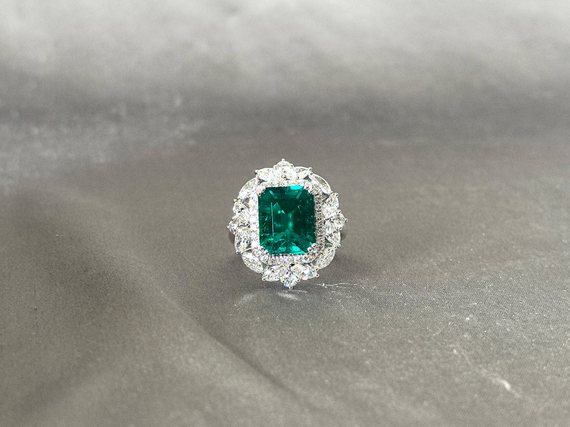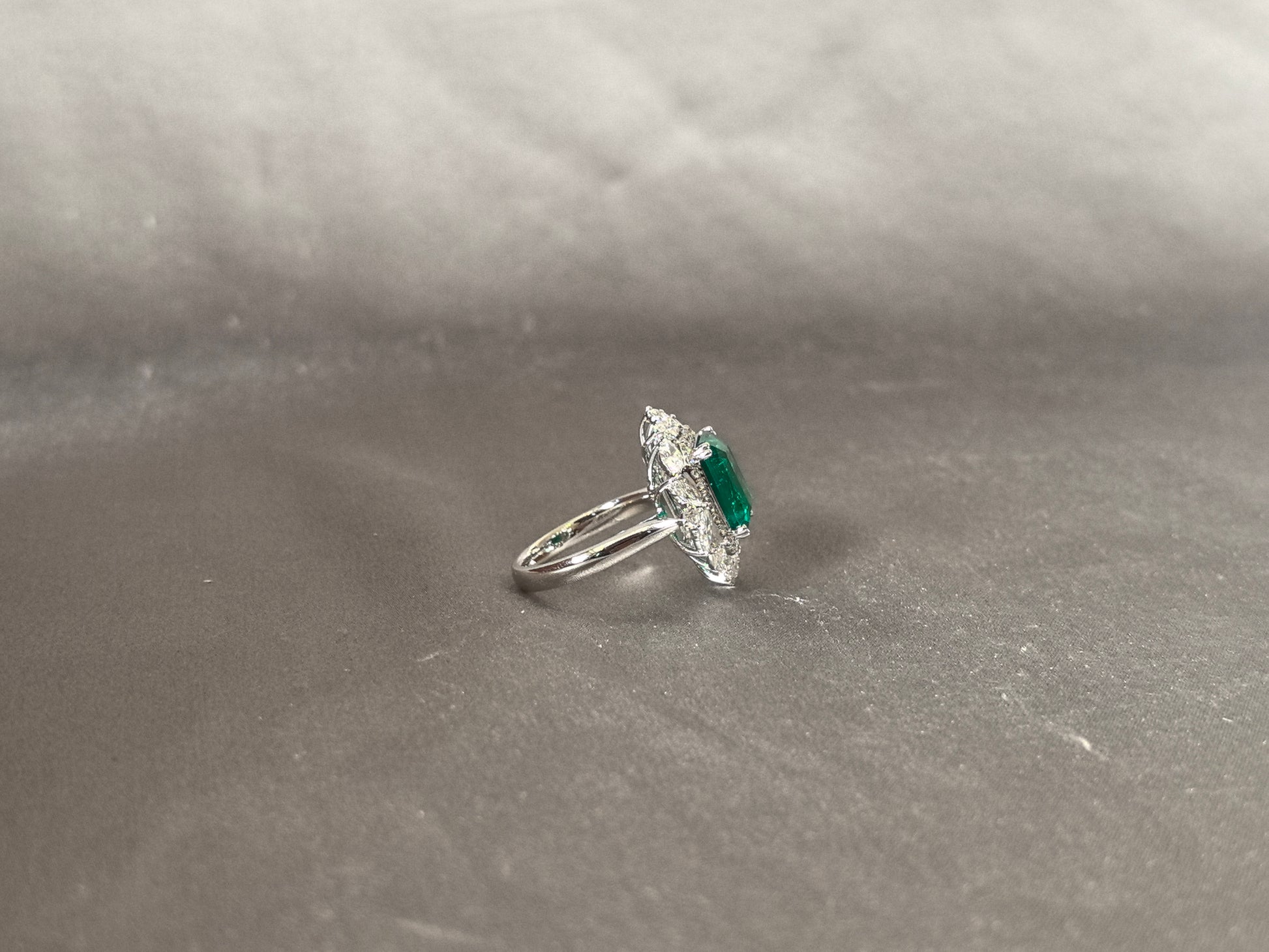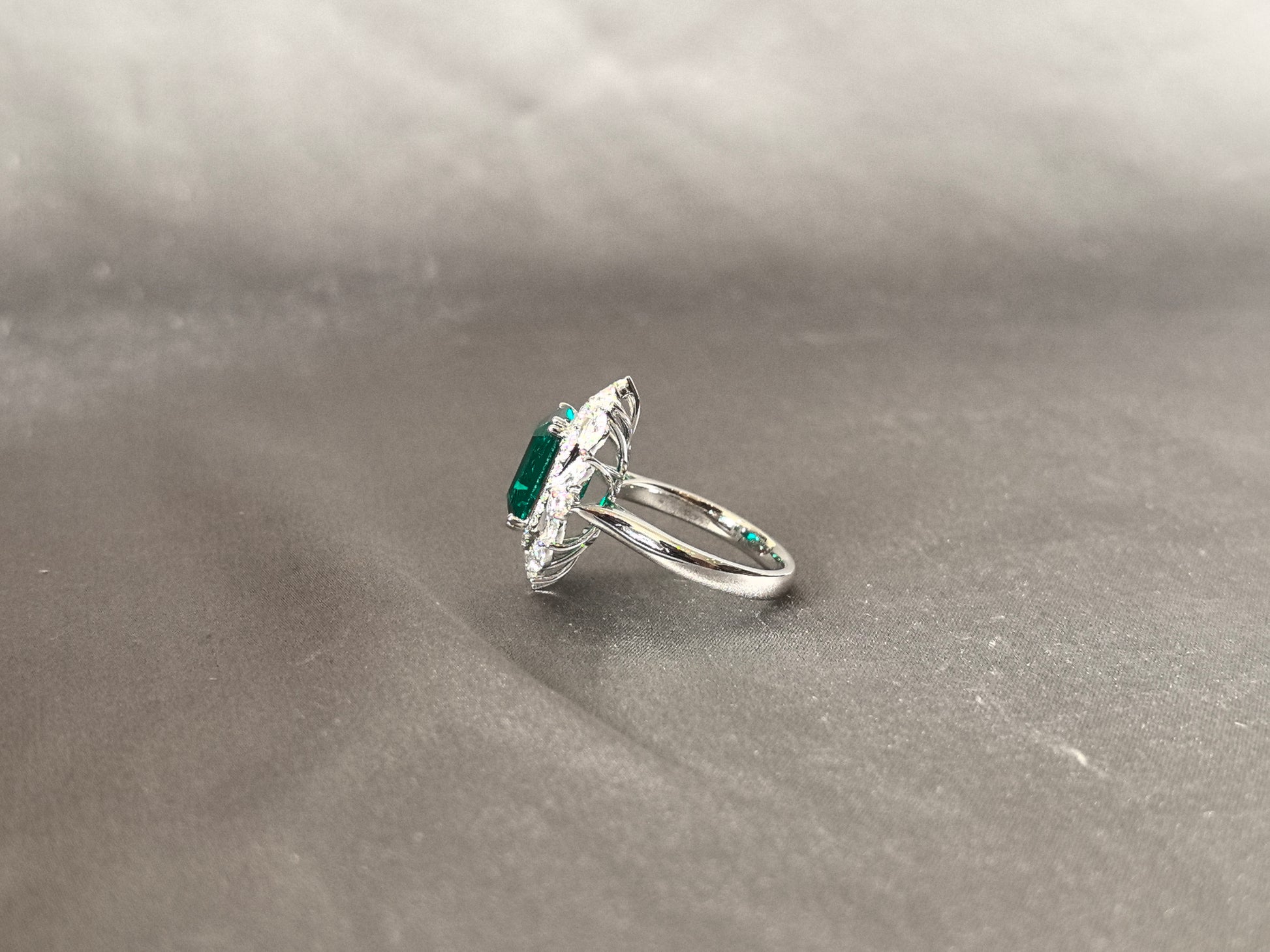 This extraordinary ring is a symphony of color, light, and geometric precision. At its heart rests a magnificent 5 carat emerald cut lab grown emerald, a stone of exceptional depth and vibrancy. The emerald cut's long, step-cut facets create a mesmerizing "hall of mirrors" effect, allowing the eye to travel deep into the stone's rich, verdant heart.