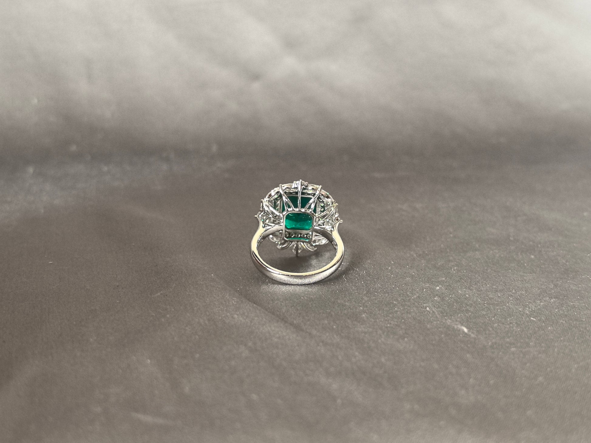 The center emerald is first embraced by a full halo of round brilliant diamonds, creating a luminous inner frame that enhances the stone's natural brilliance. This inner halo acts as a bridge between the emerald's deep green and the outer layer's intricate sparkle.