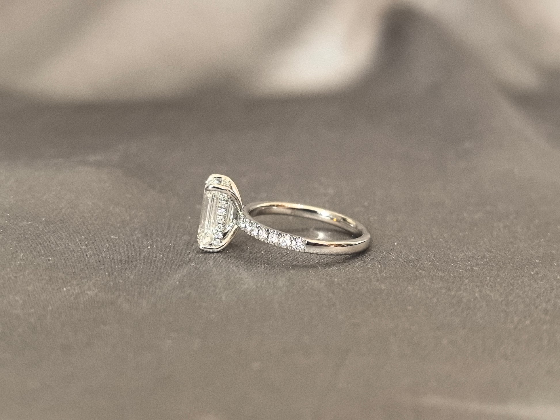 This ring features a 3 carat emerald diamond that is beautifully faceted to maximize light reflection, resulting in a stunning hall-of-mirrors effect and a breathtaking sparkle that catches every eye. The emerald cut offers a sophisticated, timeless appeal with its clean lines and step-cut faceting.