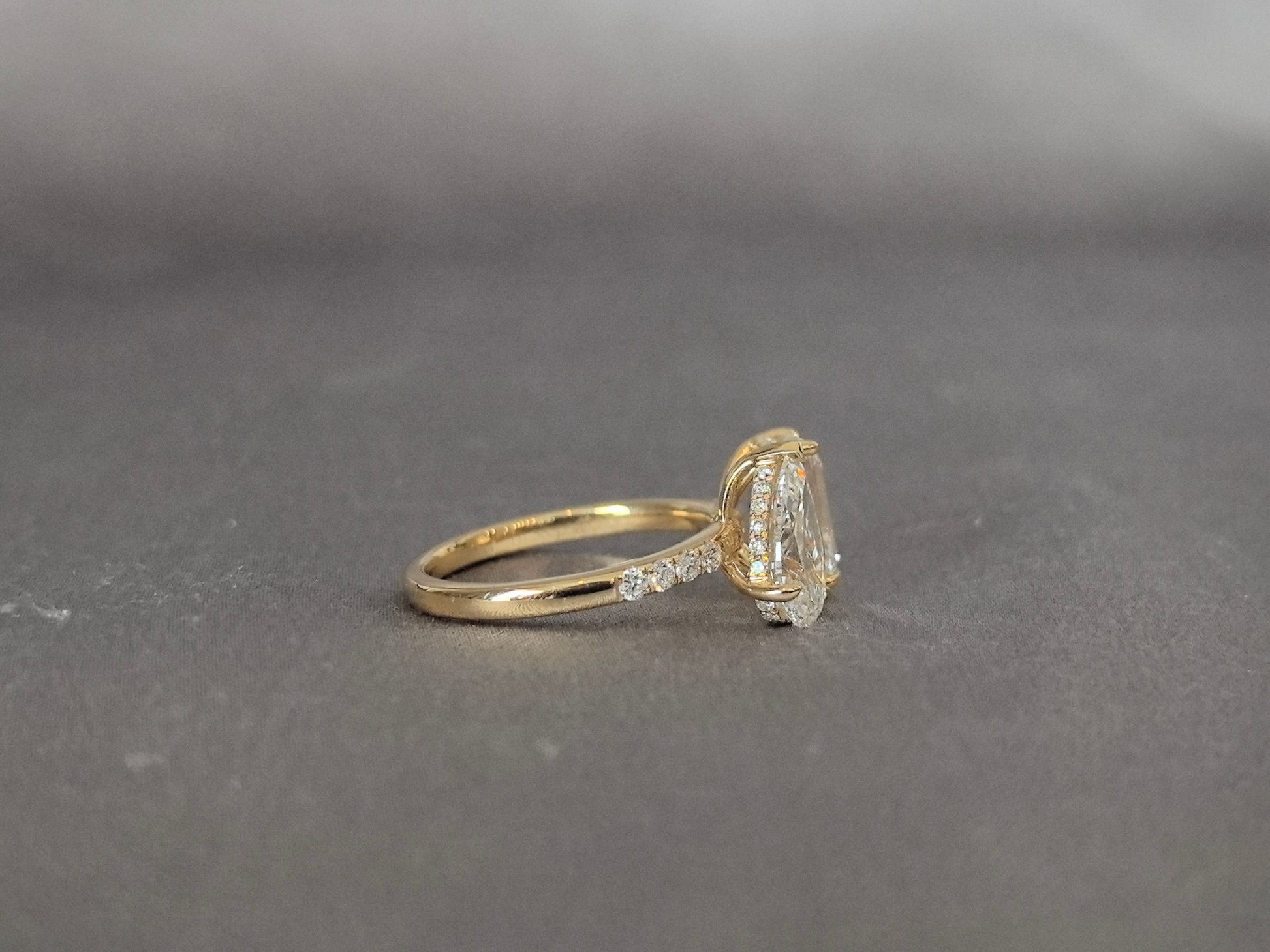 A striking dialogue between geometry and grace. This distinctive two-stone ring pairs the clean, architectural lines of an emerald-cut lab-grown diamond with the soft, flowing curves of a pear-cut lab-grown diamond. Set upon a band featuring a half eternity of pavé diamonds, this design creates a captivating contrast, symbolizing the beautiful harmony of strength and tenderness in a lasting partnership.