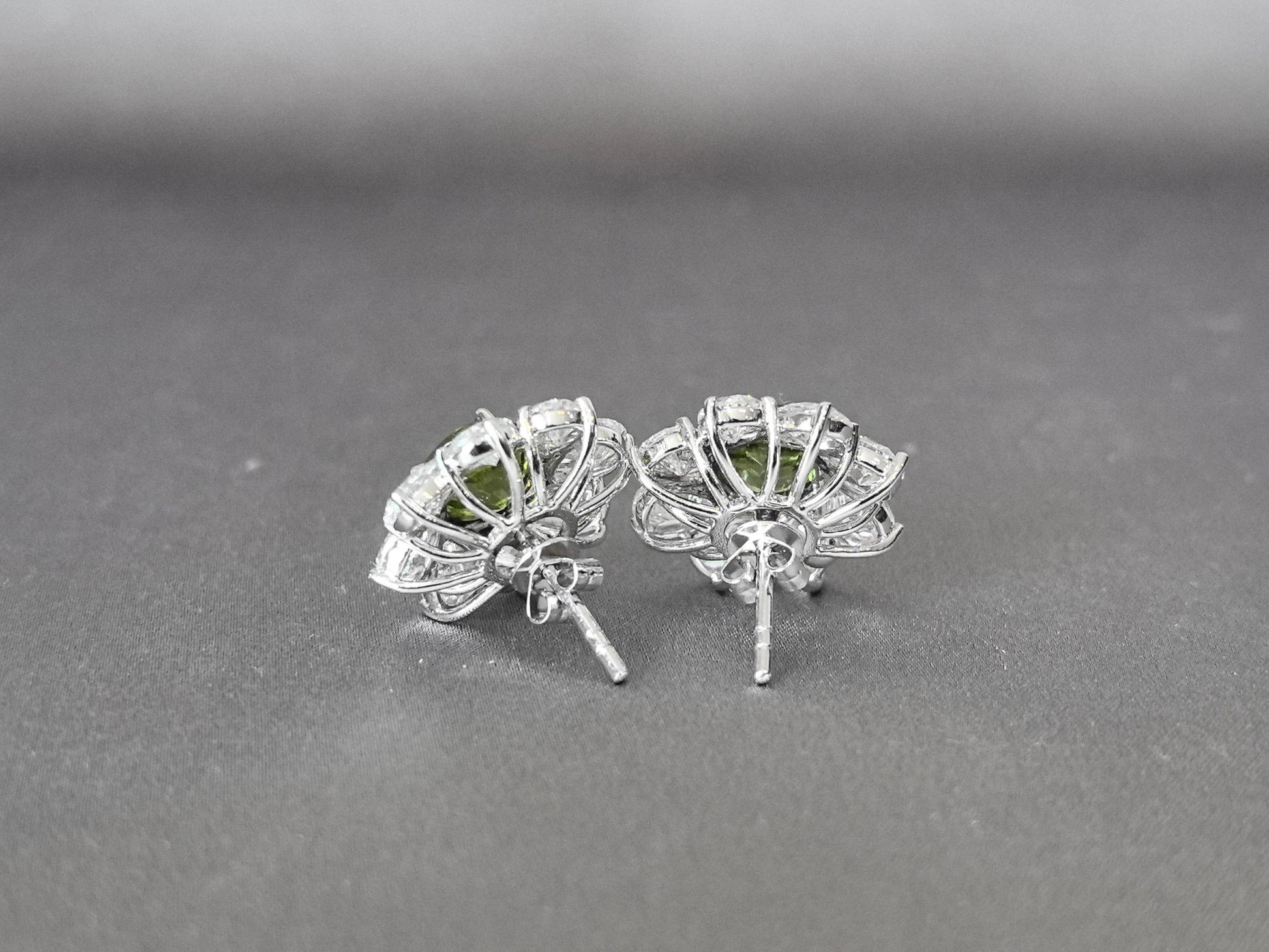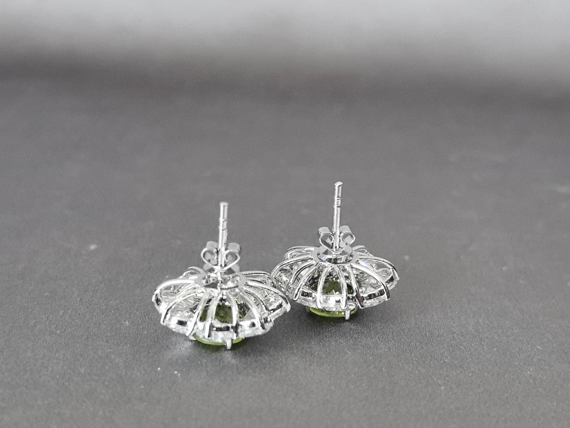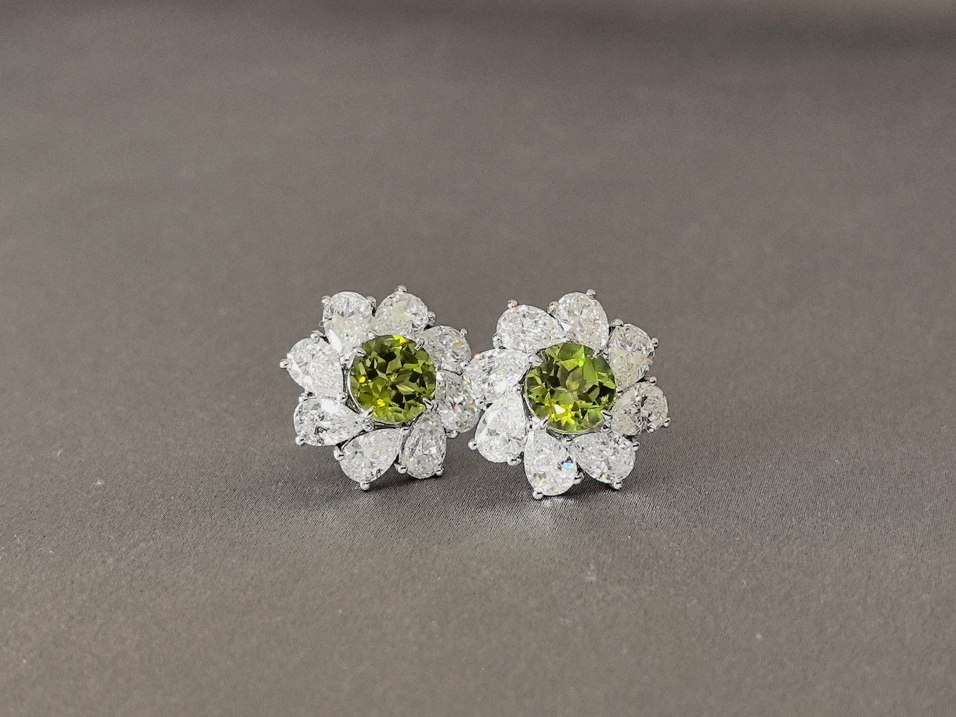 A breath of fresh air in fine jewelry. These exquisite stud earrings showcase a vibrant 2-carat peridot as the centerpiece, masterfully set within a delicate and luxurious floral motif. The design harmoniously blends a sense of freshness with timeless opulence, offering a touch of garden-inspired elegance for any occasion.