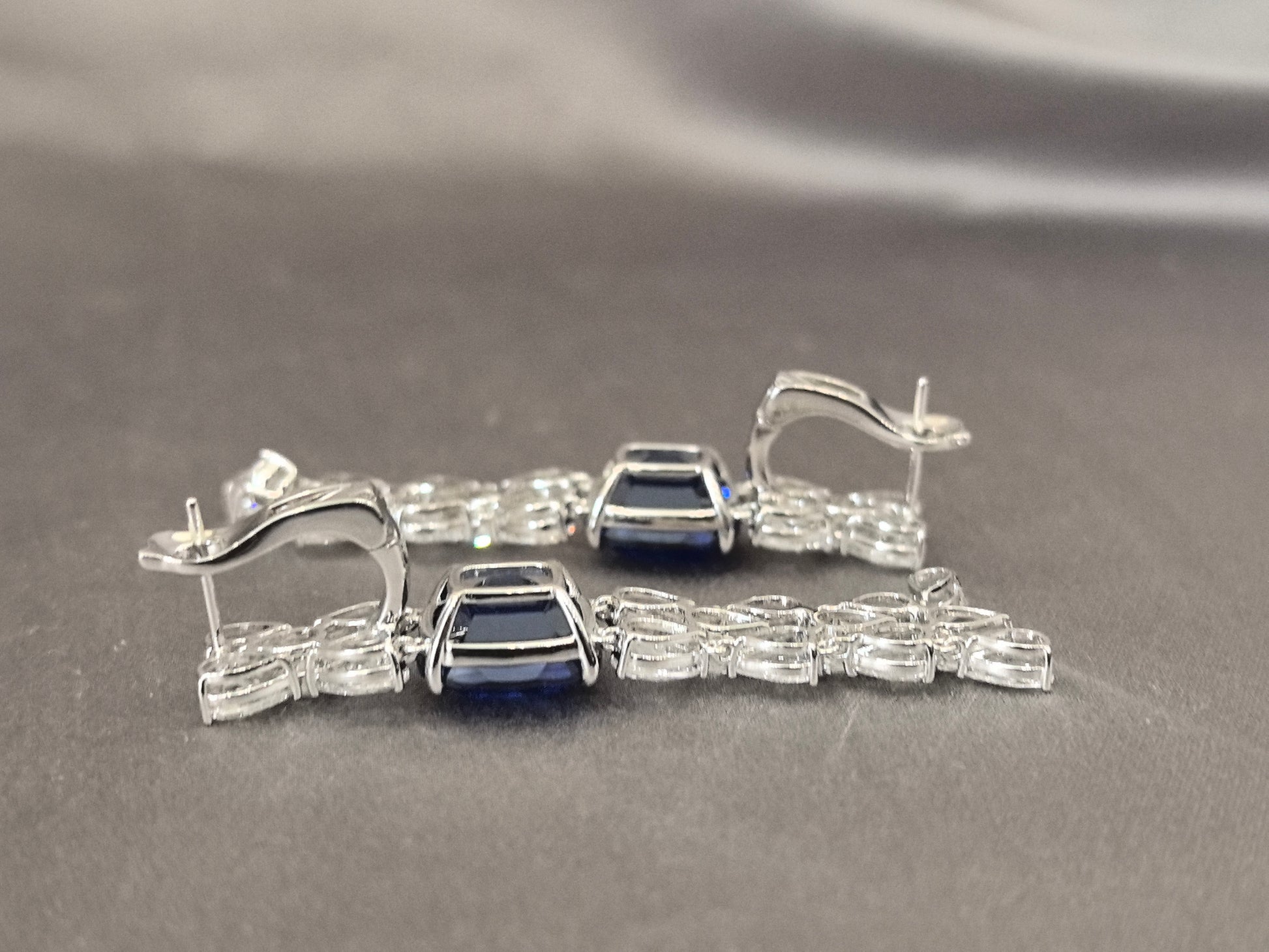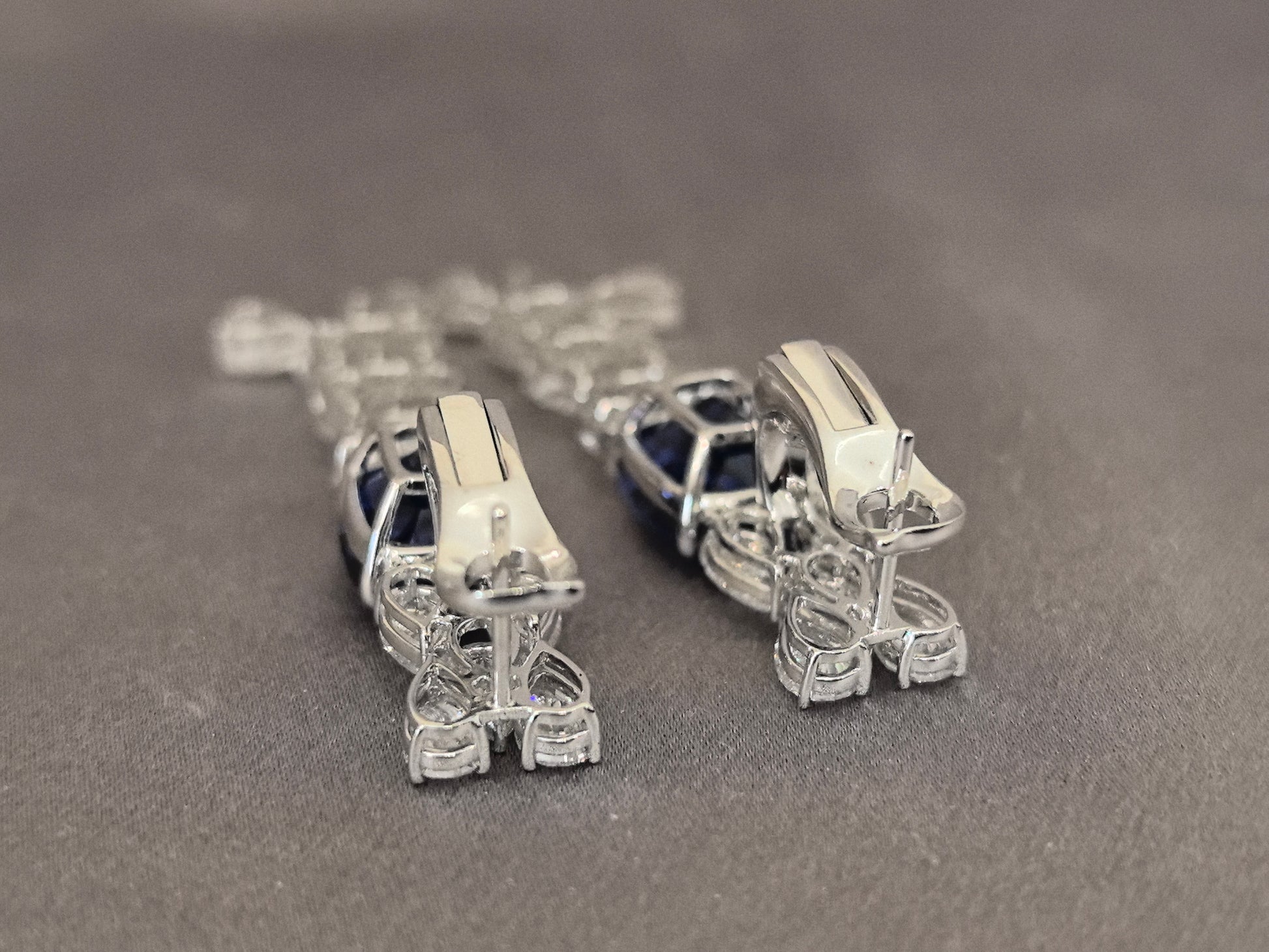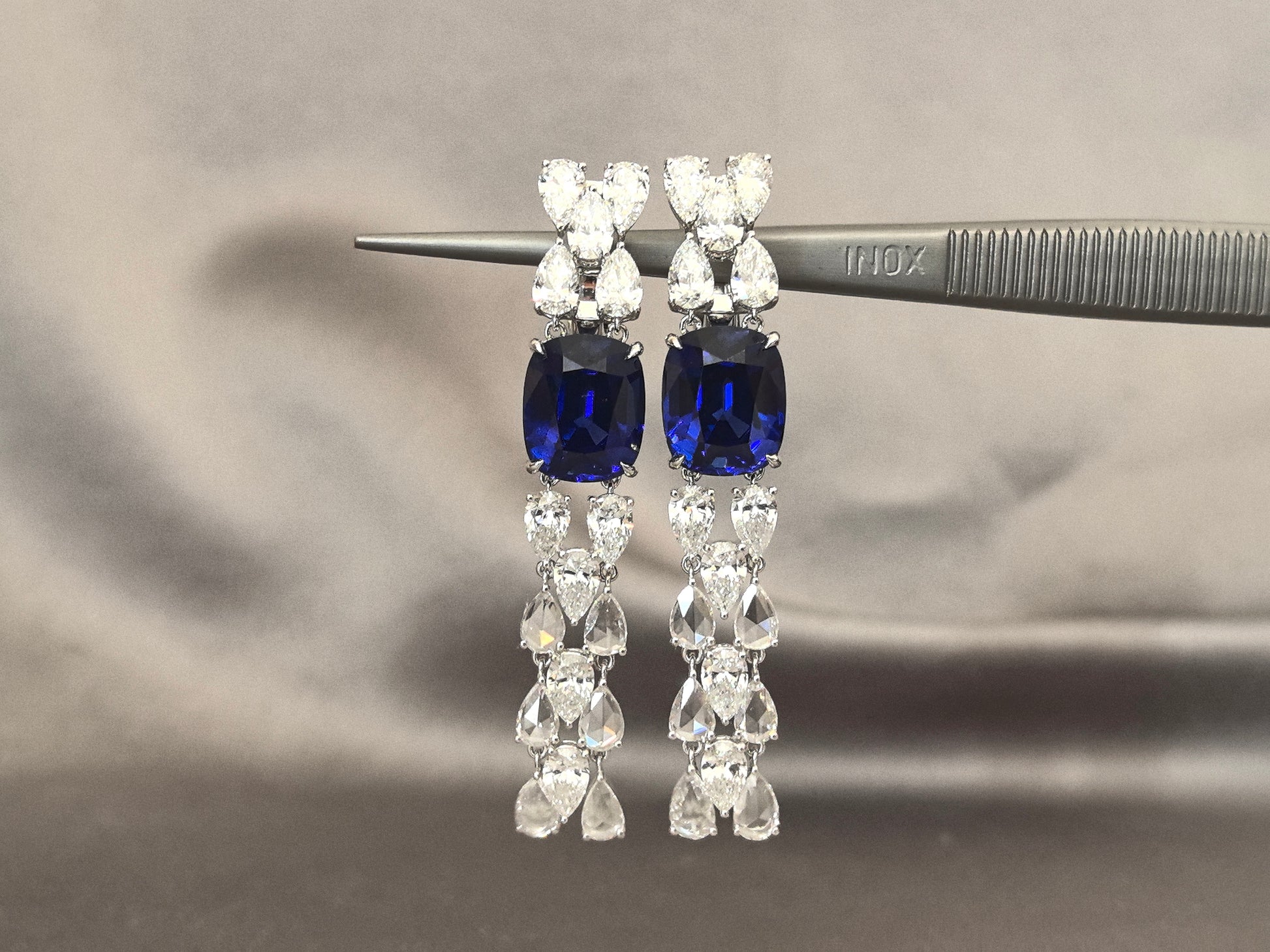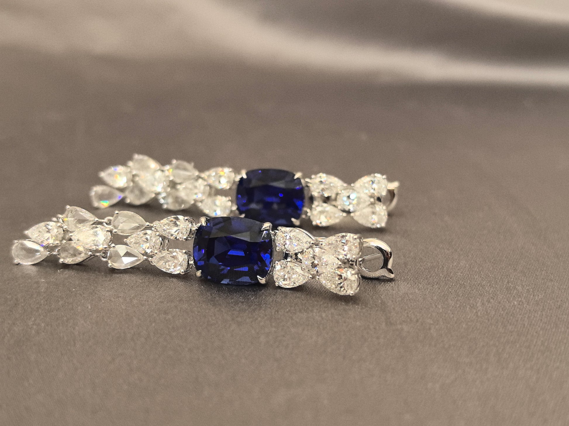 6.4ct 12.8g Cushion Sapphire & Pear Diamond Earrings | Lab-Grown | Serene Luxury