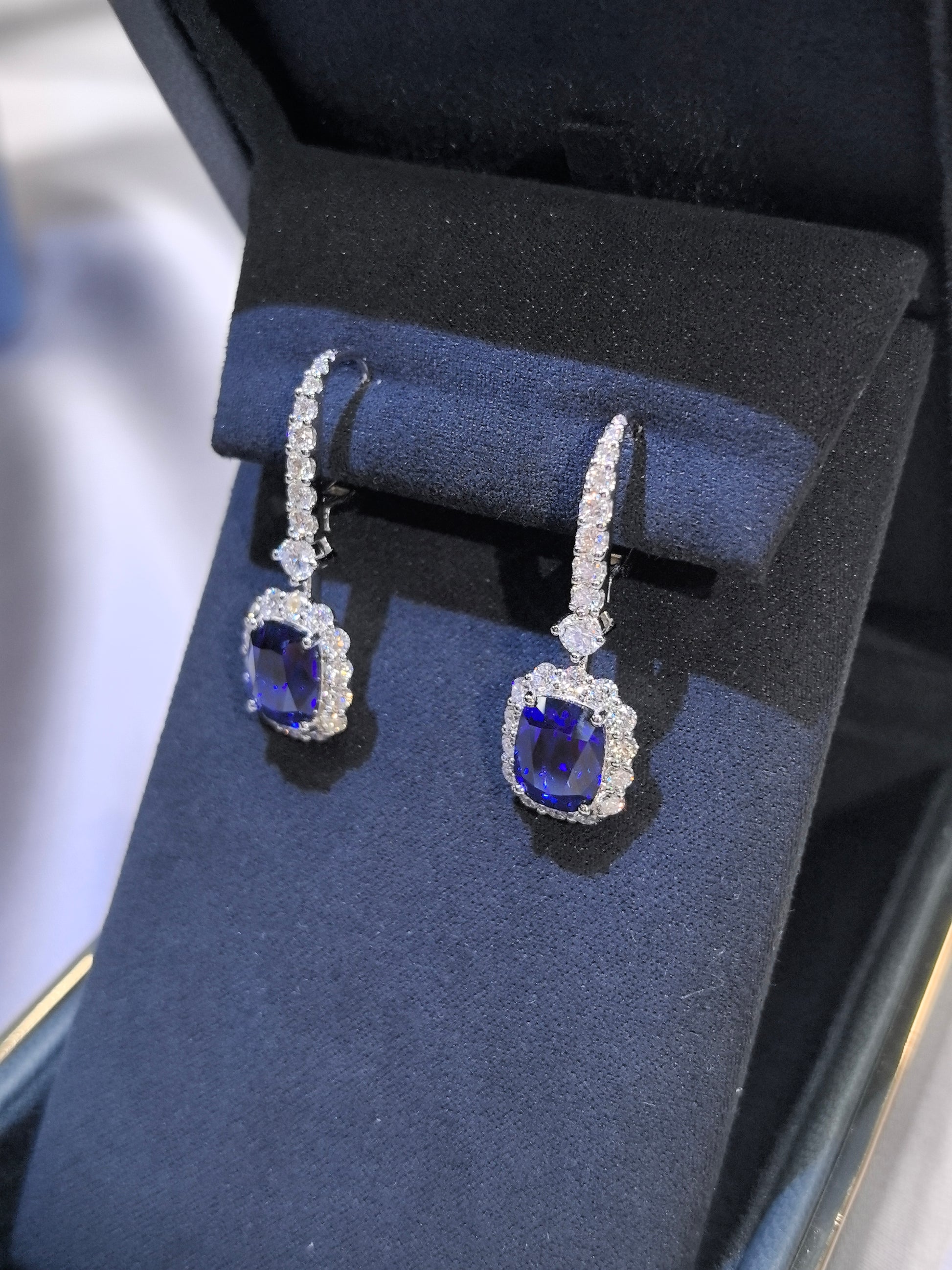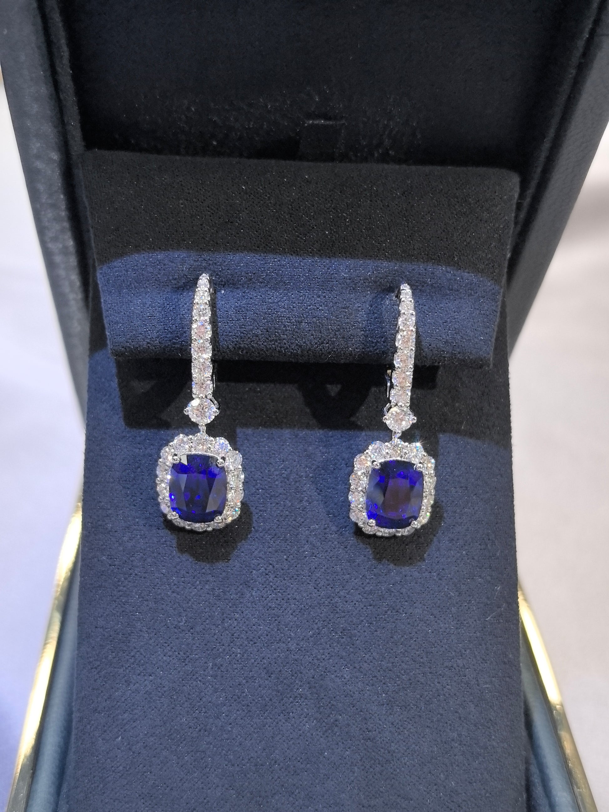 3ct 7g Cushion Sapphire Halo Drop Earrings