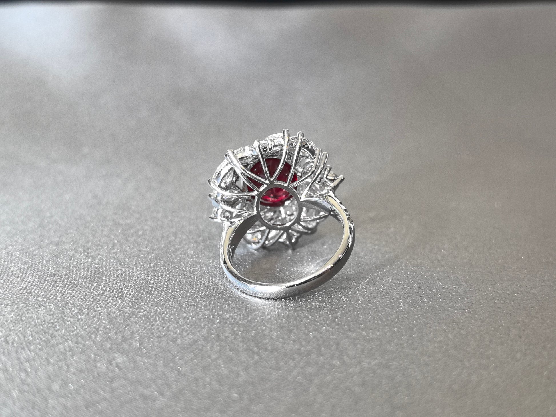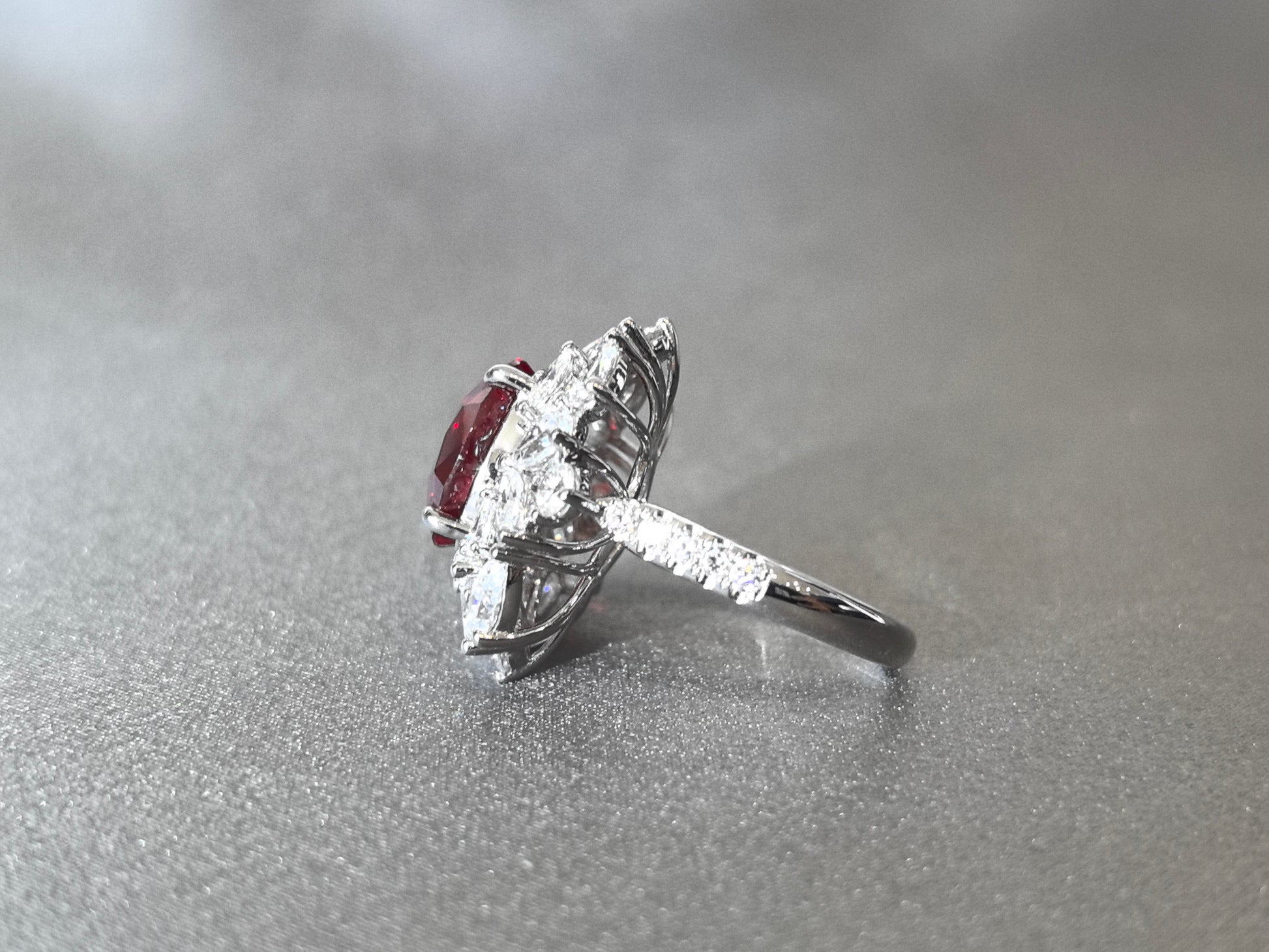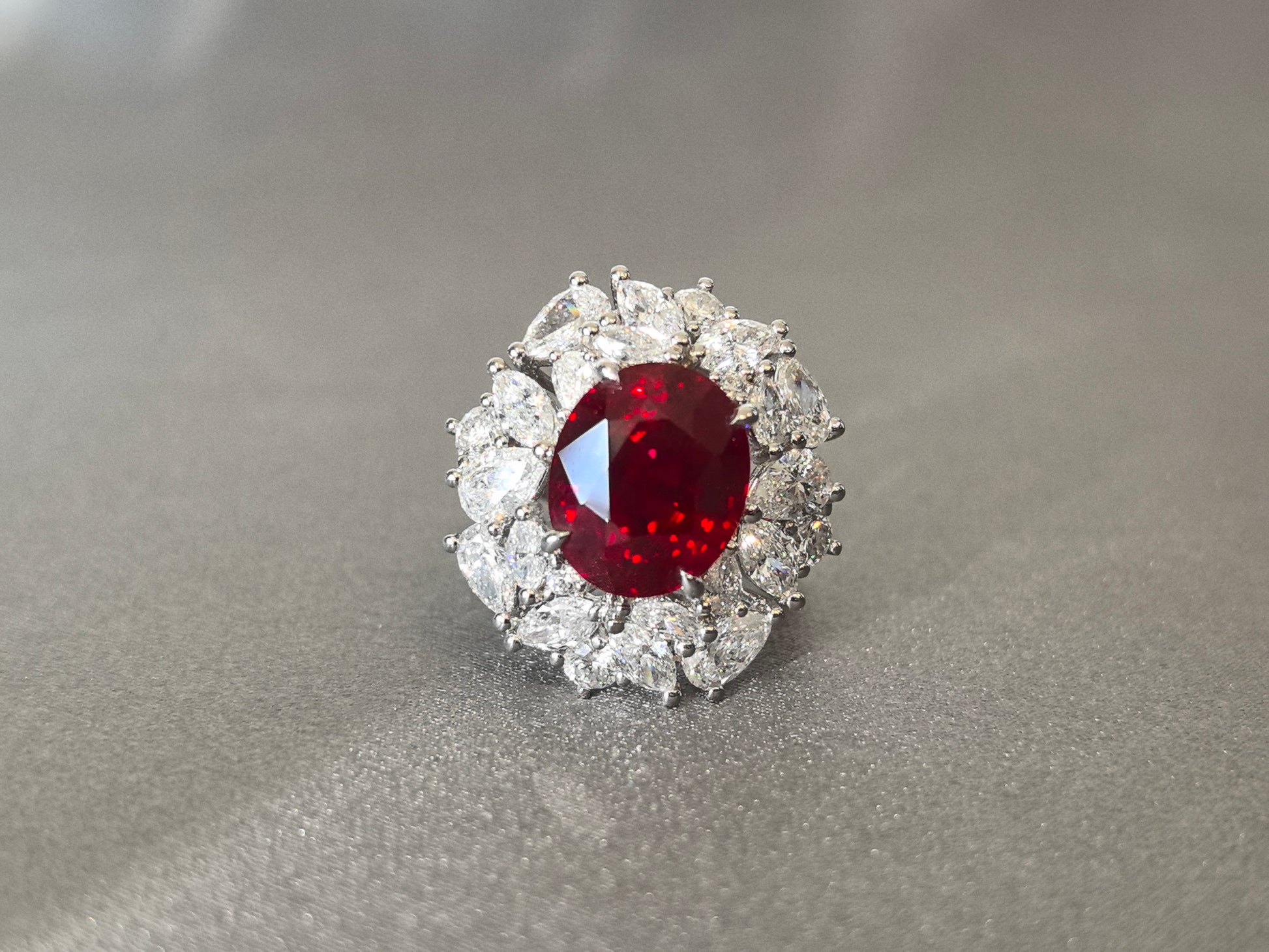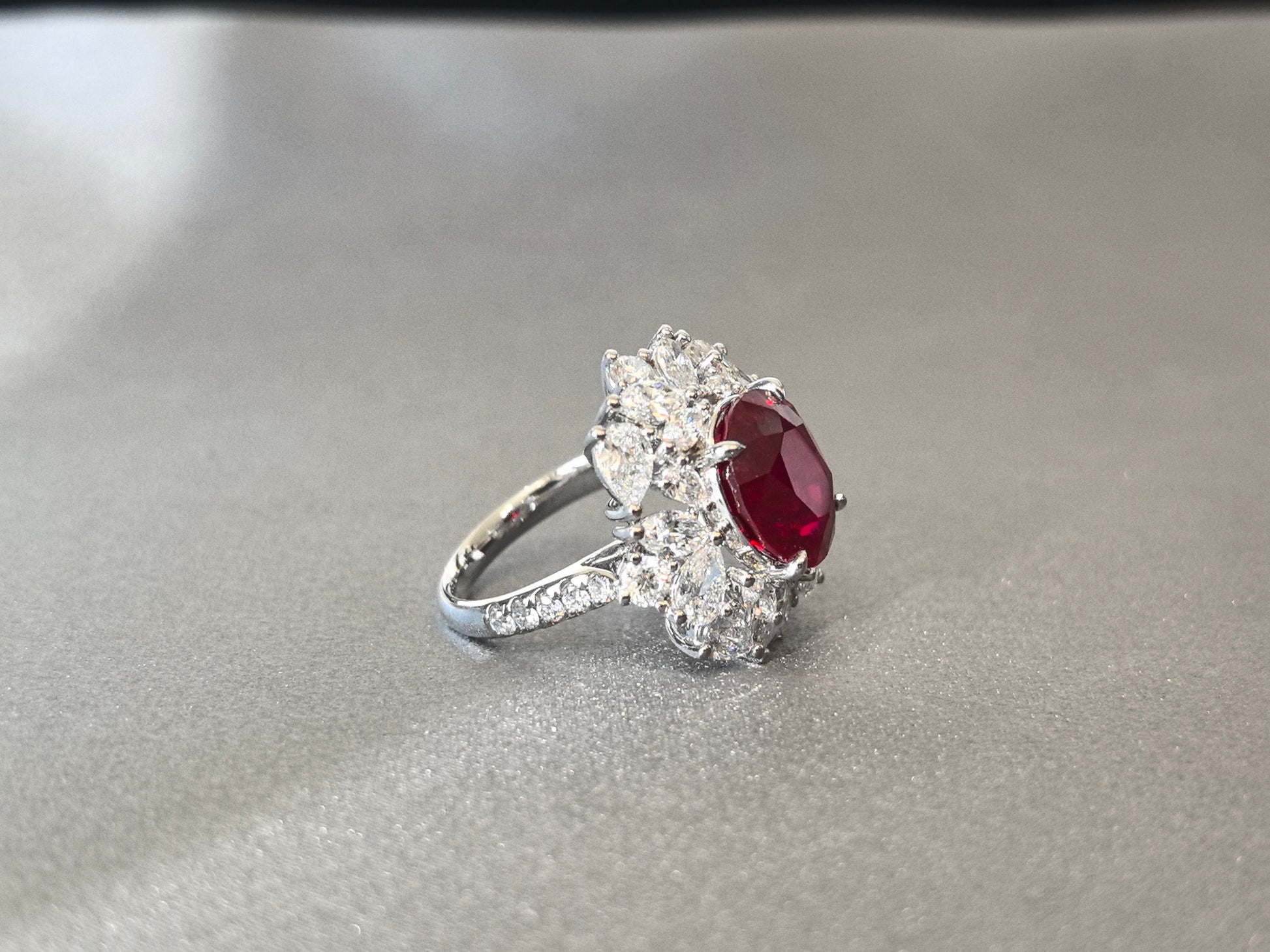 7.5ct 9.8g Oval Pigeon Blood Red Lab Diamond Ring | Pear & Marquise Diamond Floral Halo