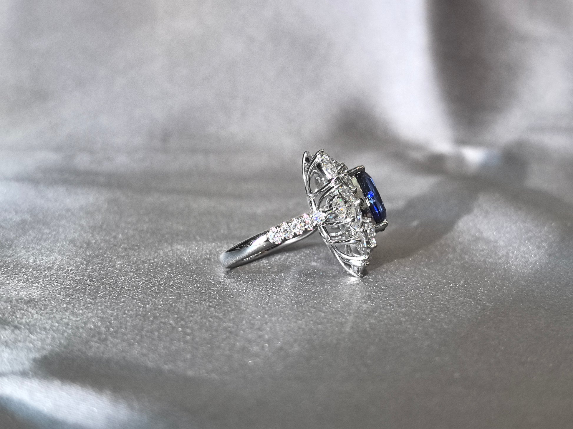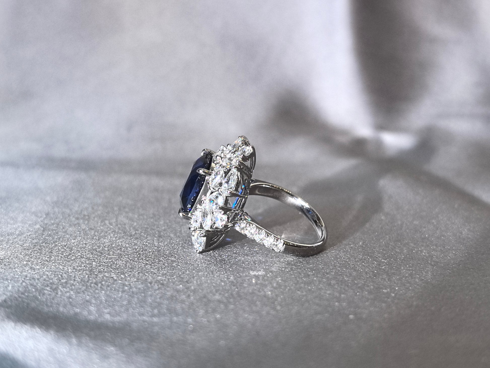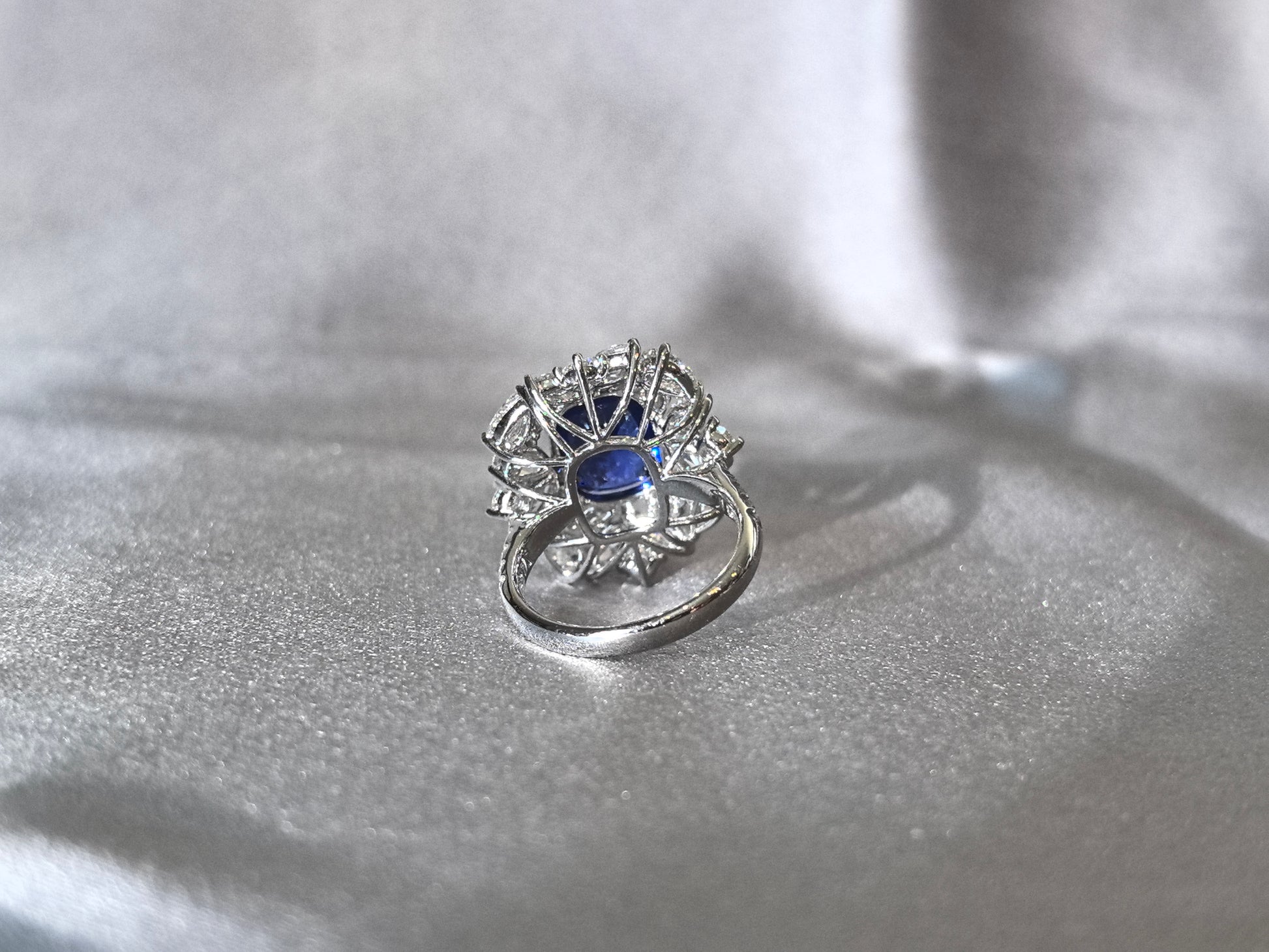 Dive into the depths of celestial beauty with this breathtaking ring featuring a magnificent cushion-cut vivid blue lab-grown sapphire as its centerpiece. The gemstone's intense cobalt-blue hue is embraced by two concentric halos of brilliant-cut lab-grown diamonds, creating a mesmerizing ripple effect that enhances both the sapphire's saturation and the overall sparkle.