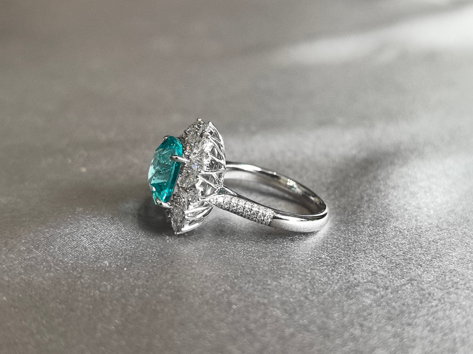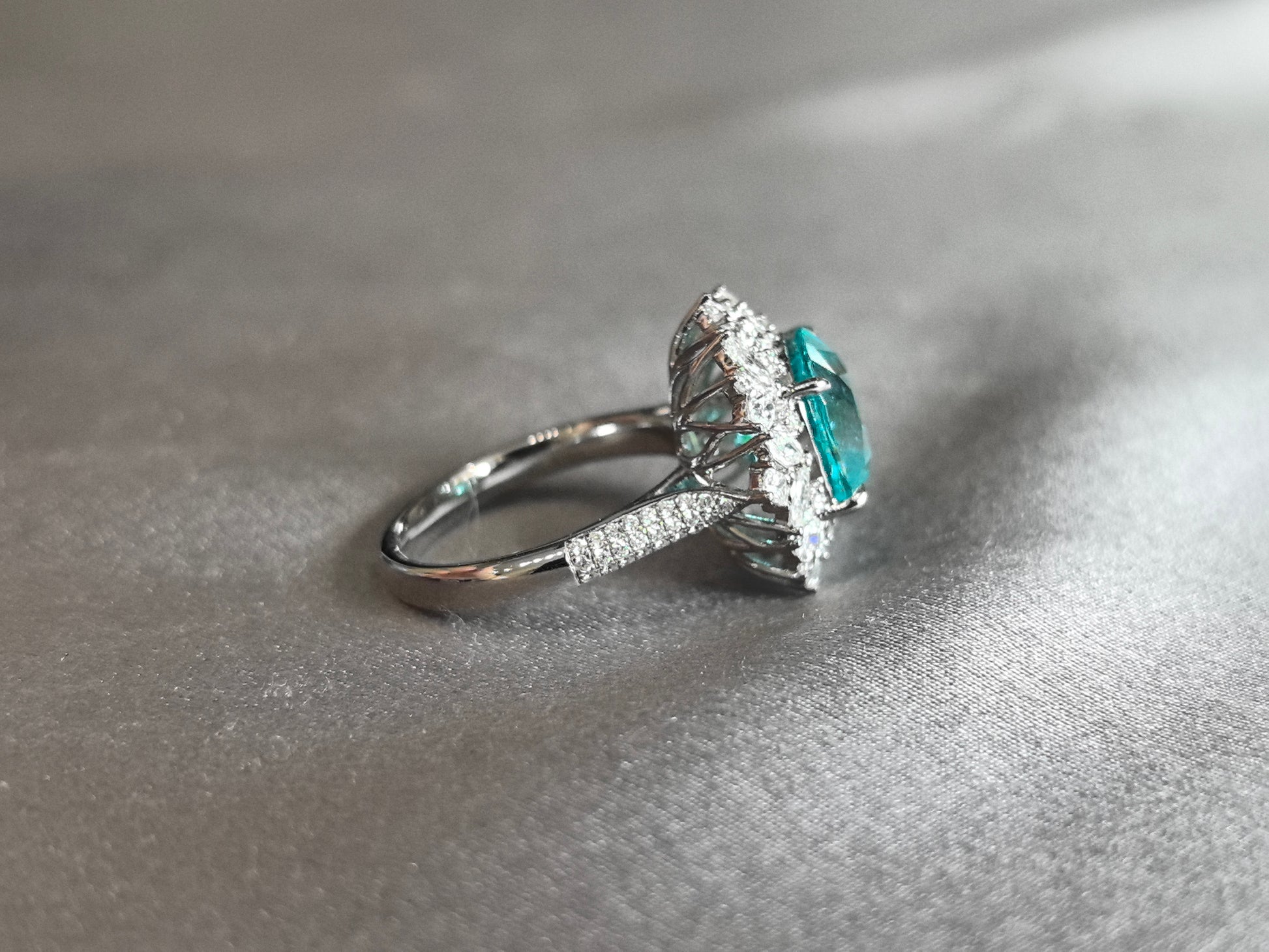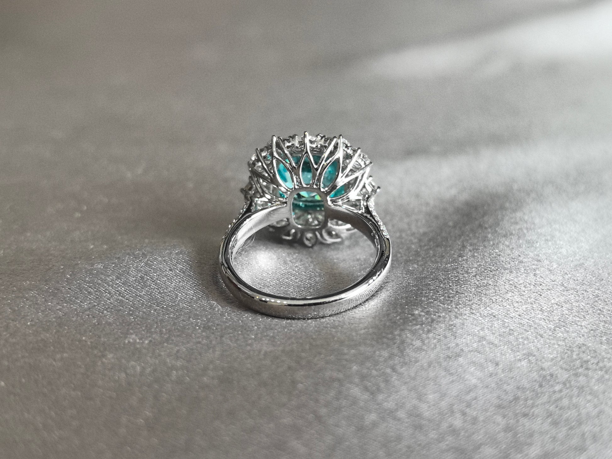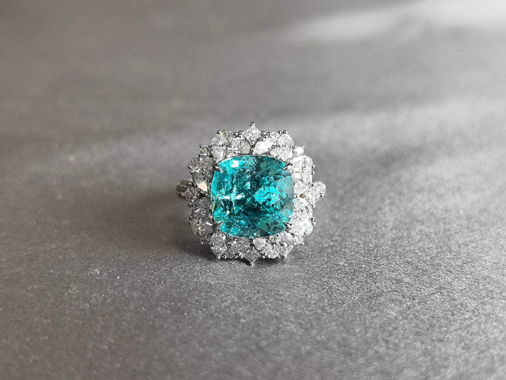 This extraordinary ring features a radiant cushion-cut Paraiba tourmaline center stone, embraced by a luxurious mosaic of white lab-grown diamonds in round, marquise, and pear shapes. The result is a breathtaking symphony of electric blue-green hues and brilliant white sparkle, set upon a band that celebrates the art of fine jewelry.