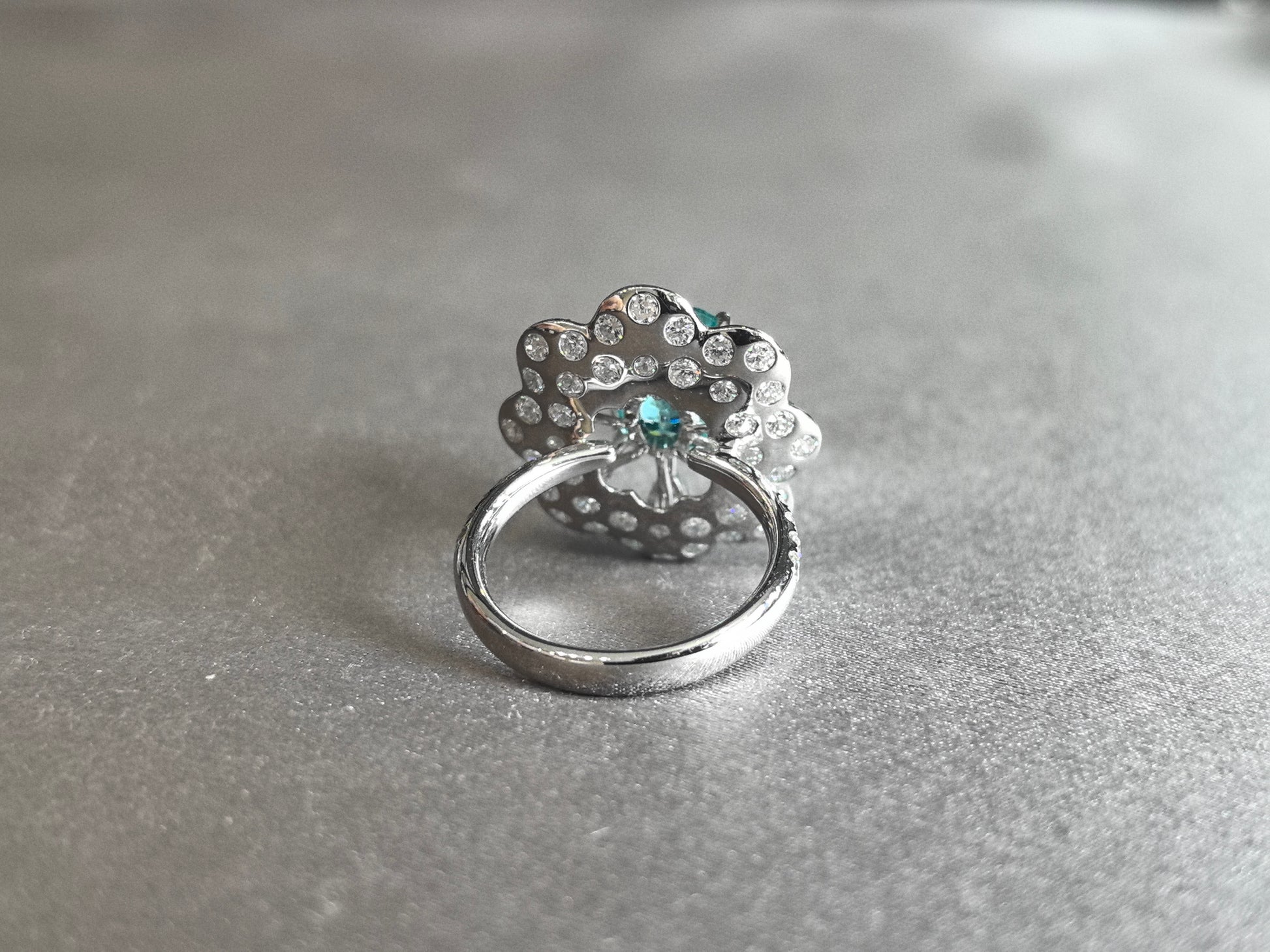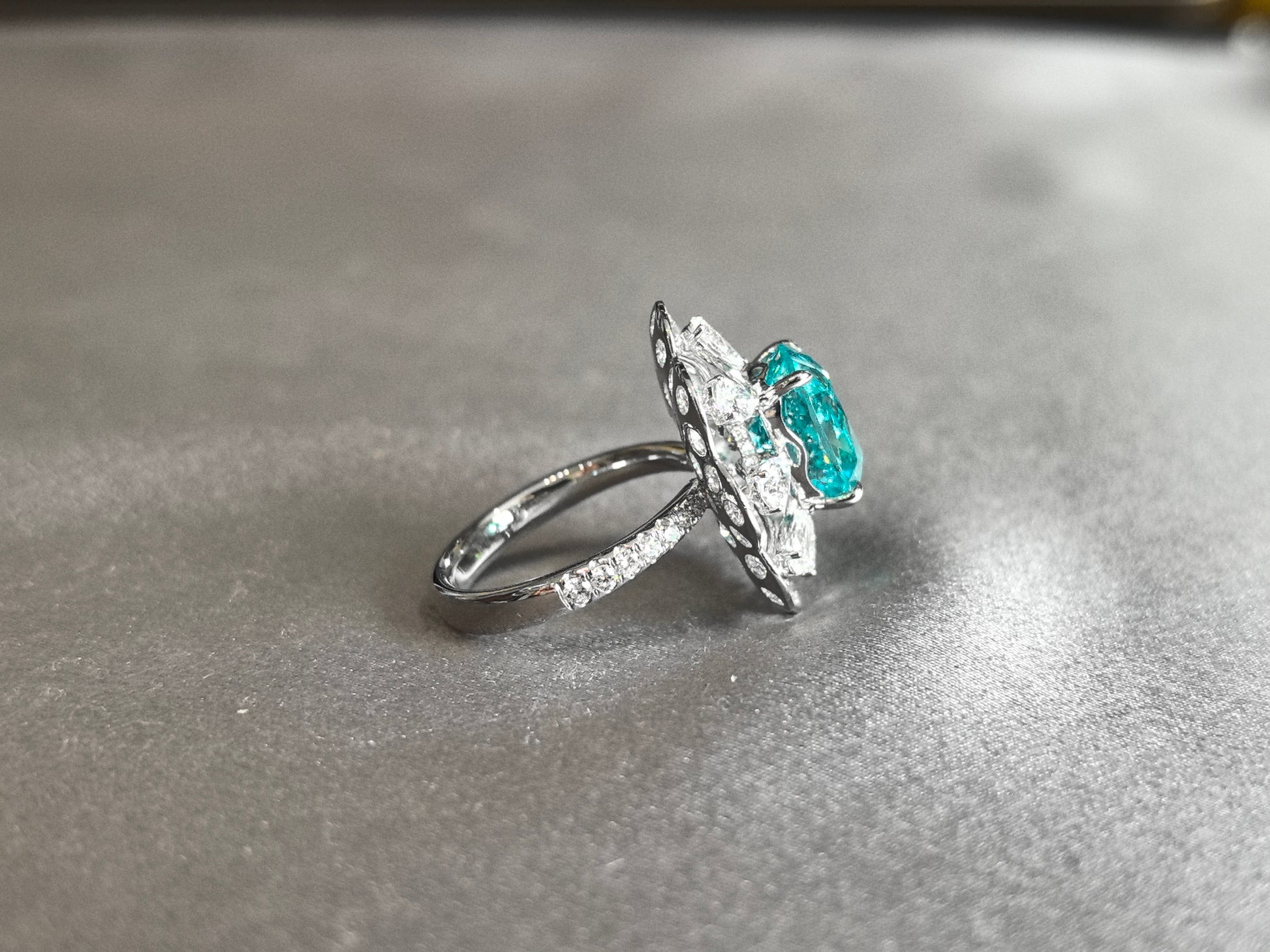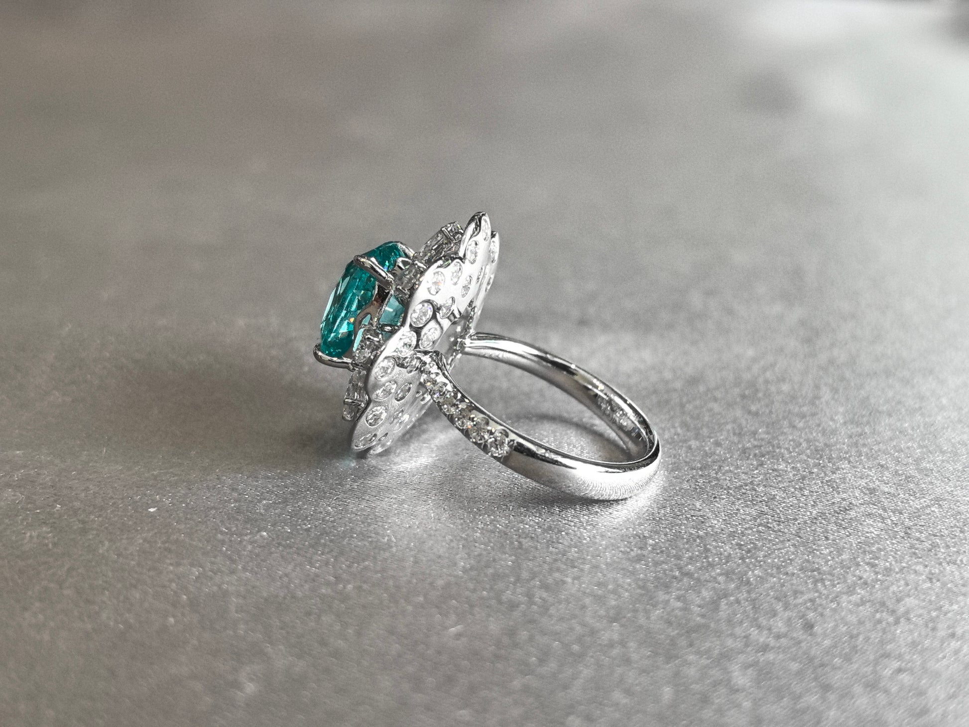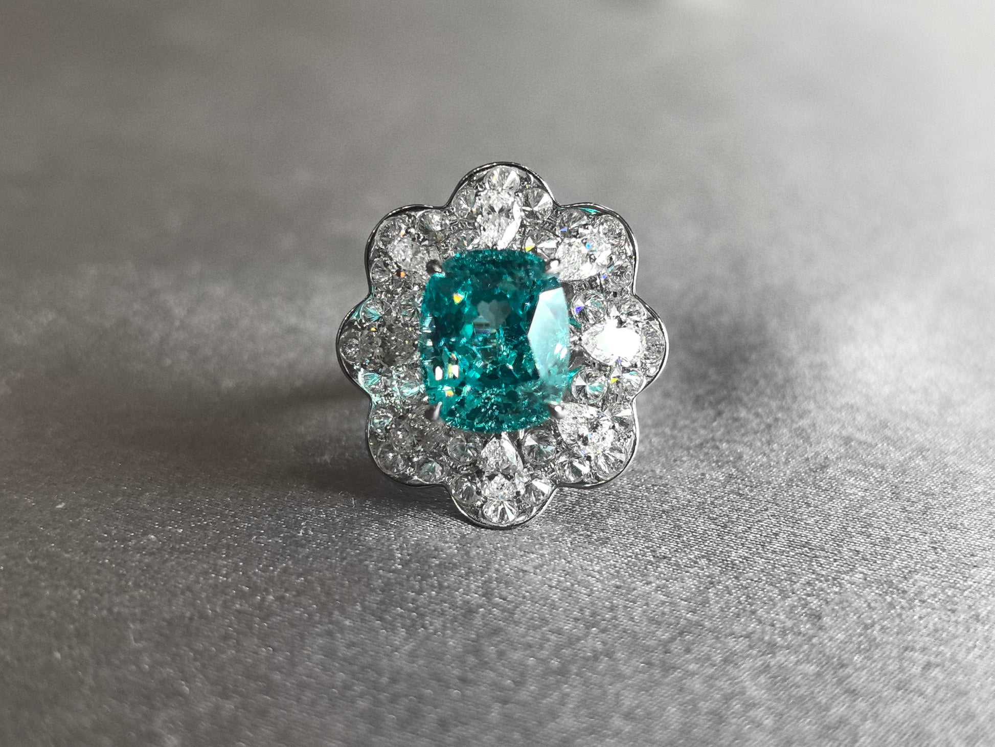 This avant-garde ring features an elongated cushion-cut Paraiba tourmaline, cradled within a dimensional double halo of lab-grown diamonds. The first halo of pear-shaped diamonds radiates outward, followed by a second tier of round brilliant diamonds, creating a layered spectacle that magnifies the Paraiba’s electric blue-green glow with architectural brilliance.