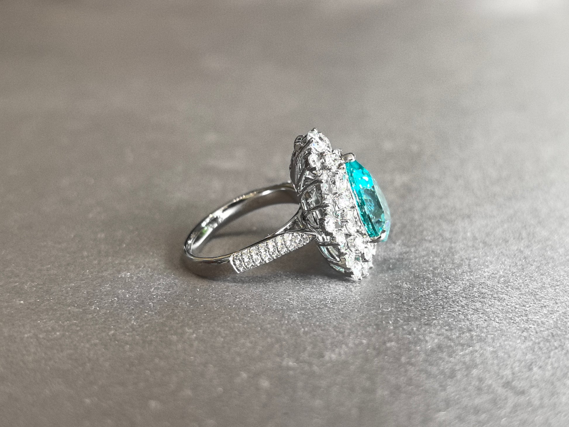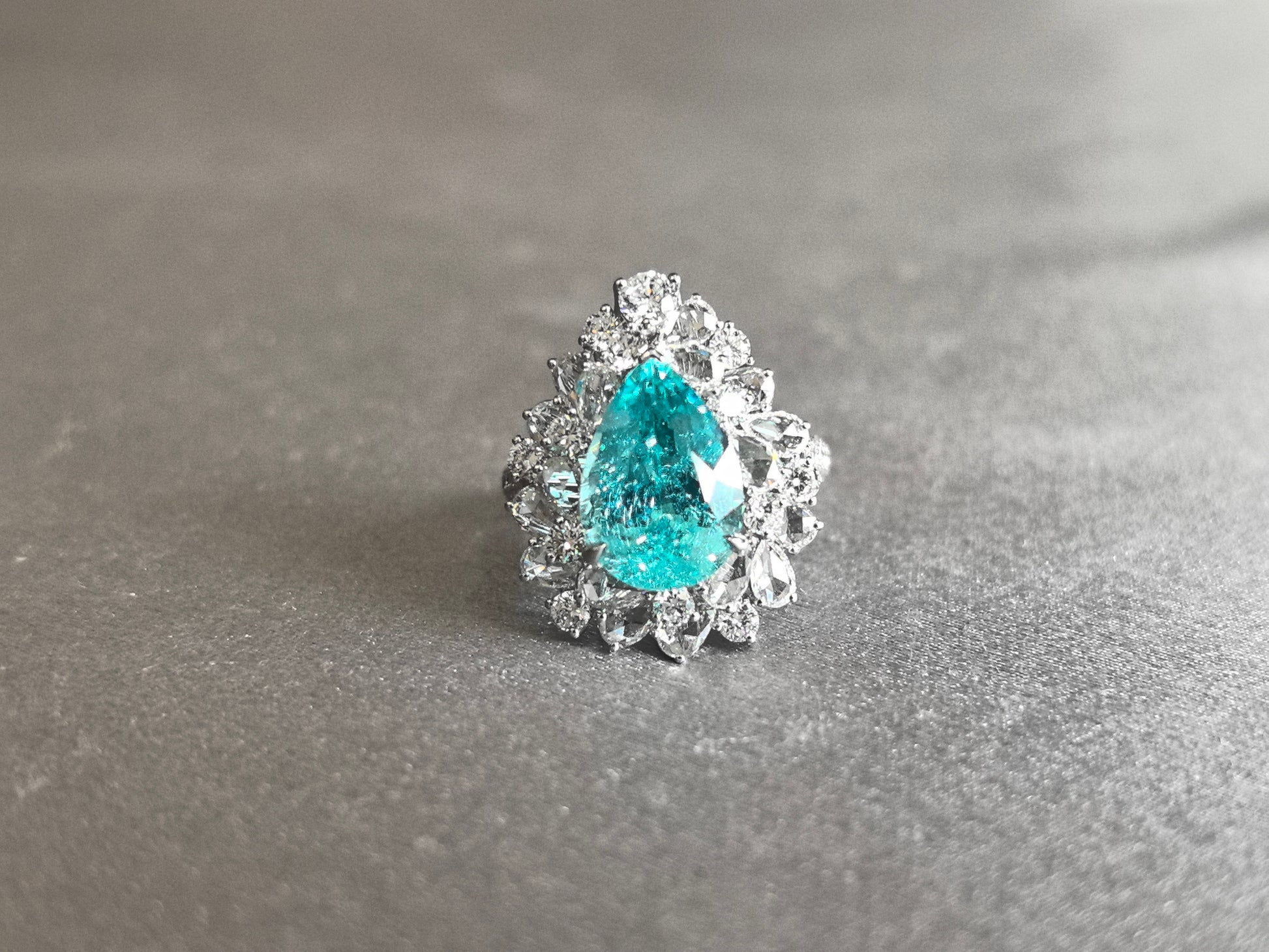 This breathtaking ring features a teardrop-shaped pear-cut Paraiba tourmaline, enveloped by a double halo of pear and round brilliant lab-grown diamonds. Set upon a half pavé band, the design creates a mesmerizing play of electric blue-green hues and scintillating white sparkle—a true celebration of nature’s rarity and human artistry.