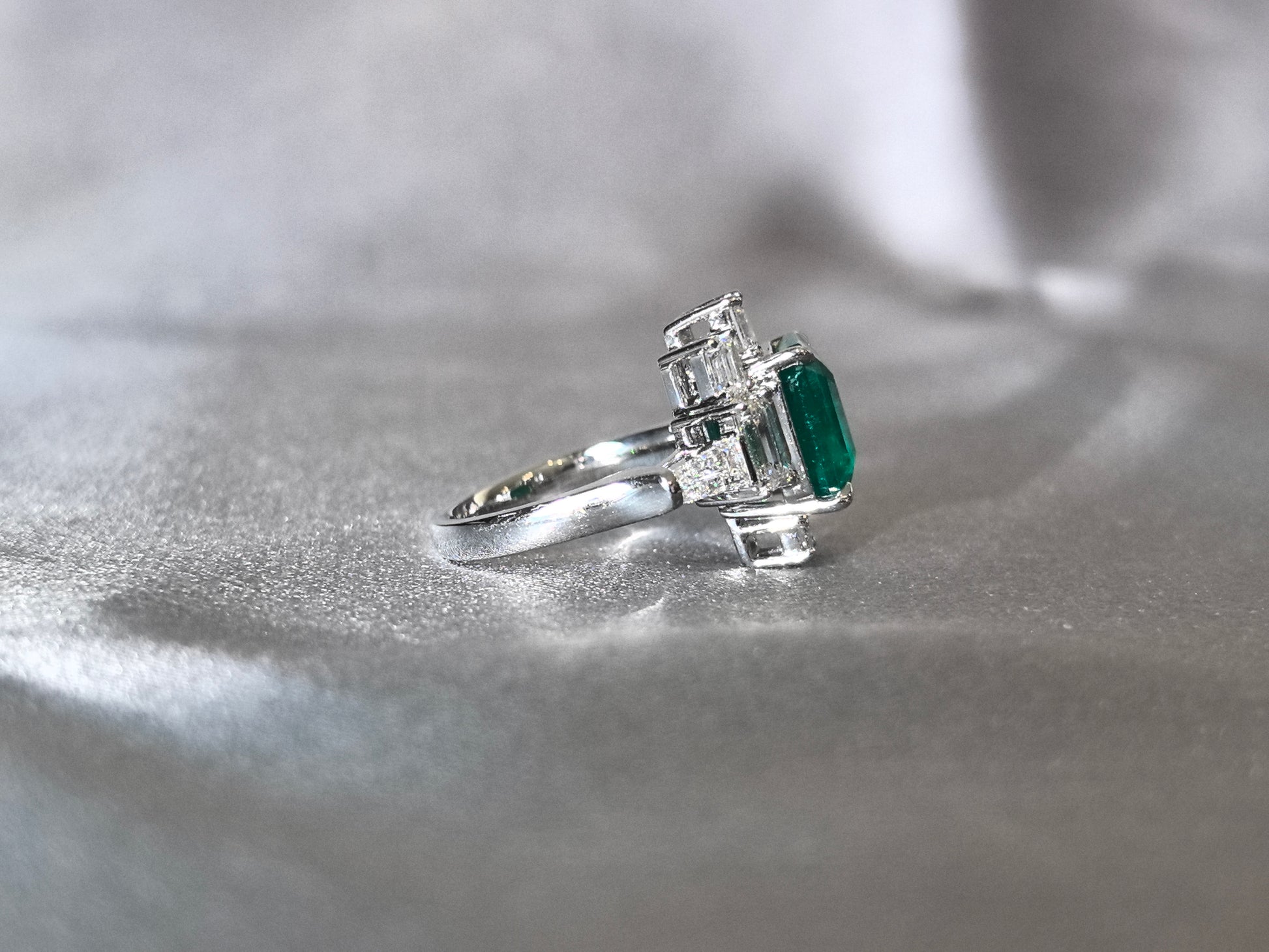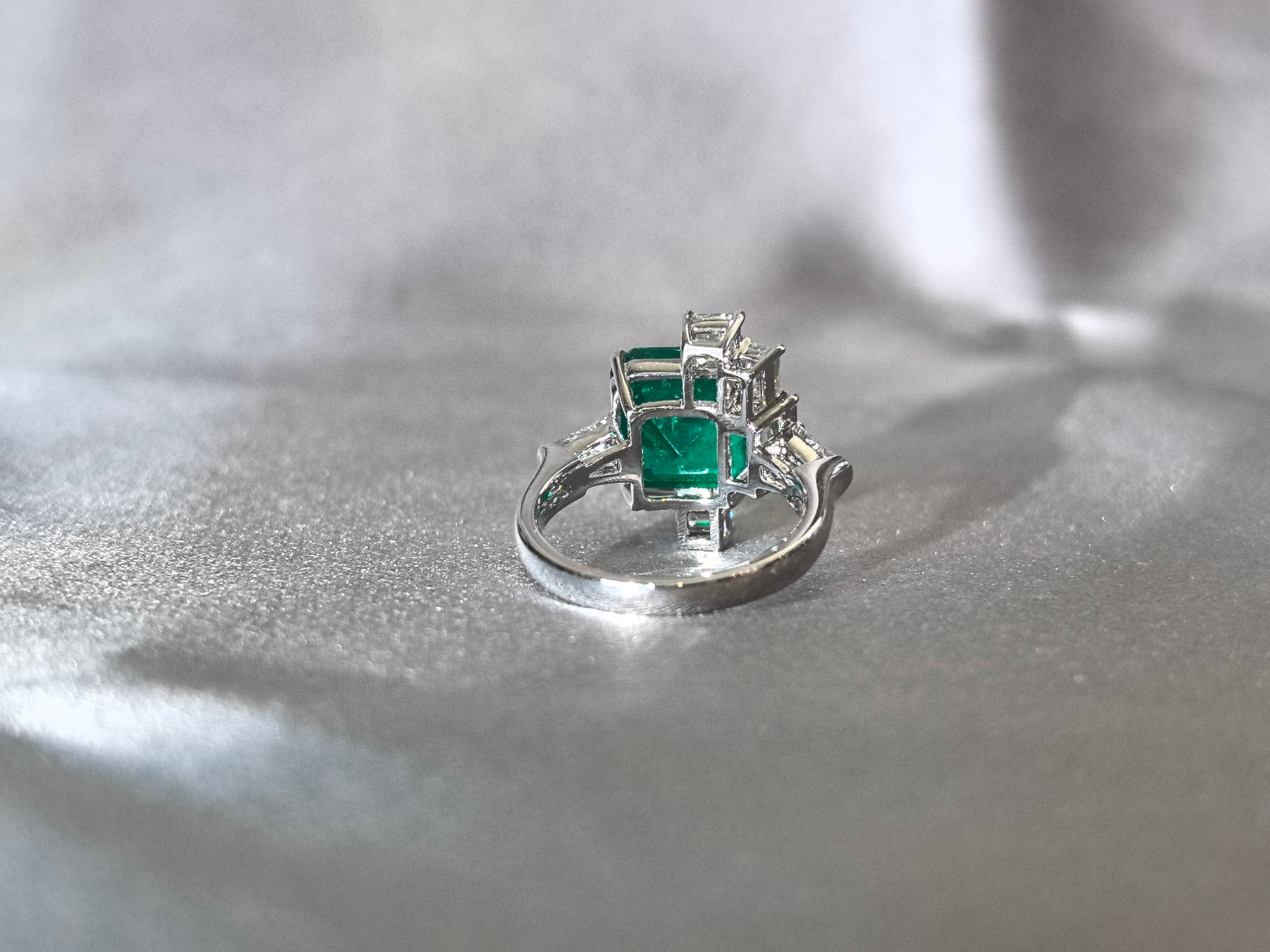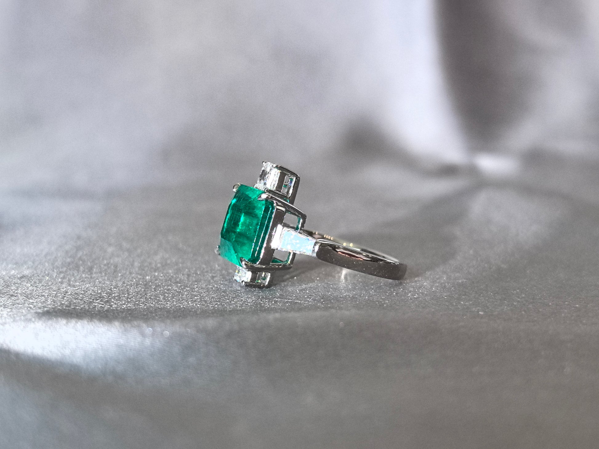 Step into the glamour of the Art Deco era with this sophisticated three-stone ring featuring a precise Asscher-cut emerald green lab gemstone at its center. Flanked by structured baguette and square-cut lab-grown diamonds, this design celebrates geometric perfection and timeless elegance. The clean lines and balanced symmetry create a striking piece that honors both vintage inspiration and modern ethical luxury, making it a true statement of refined taste.