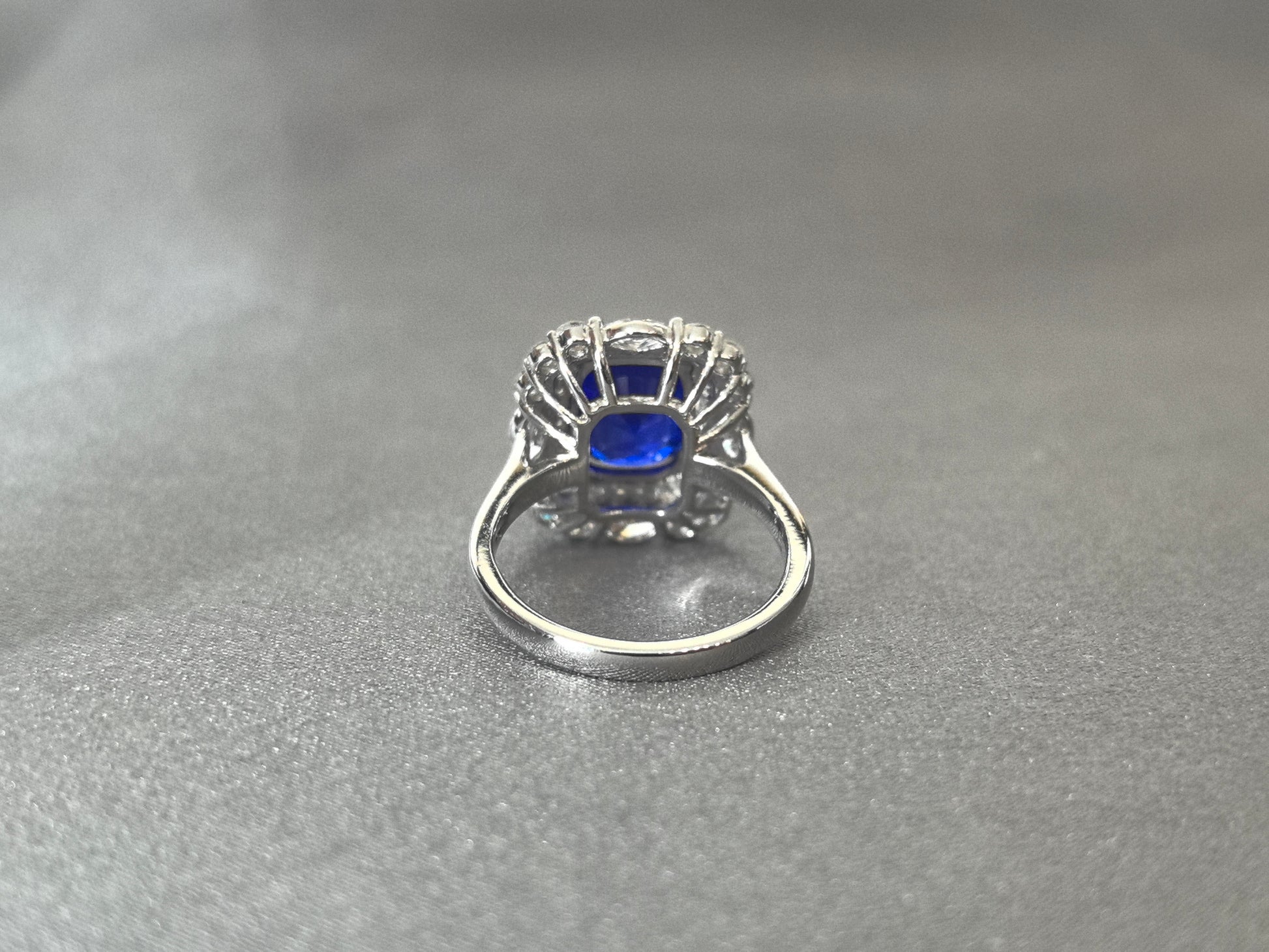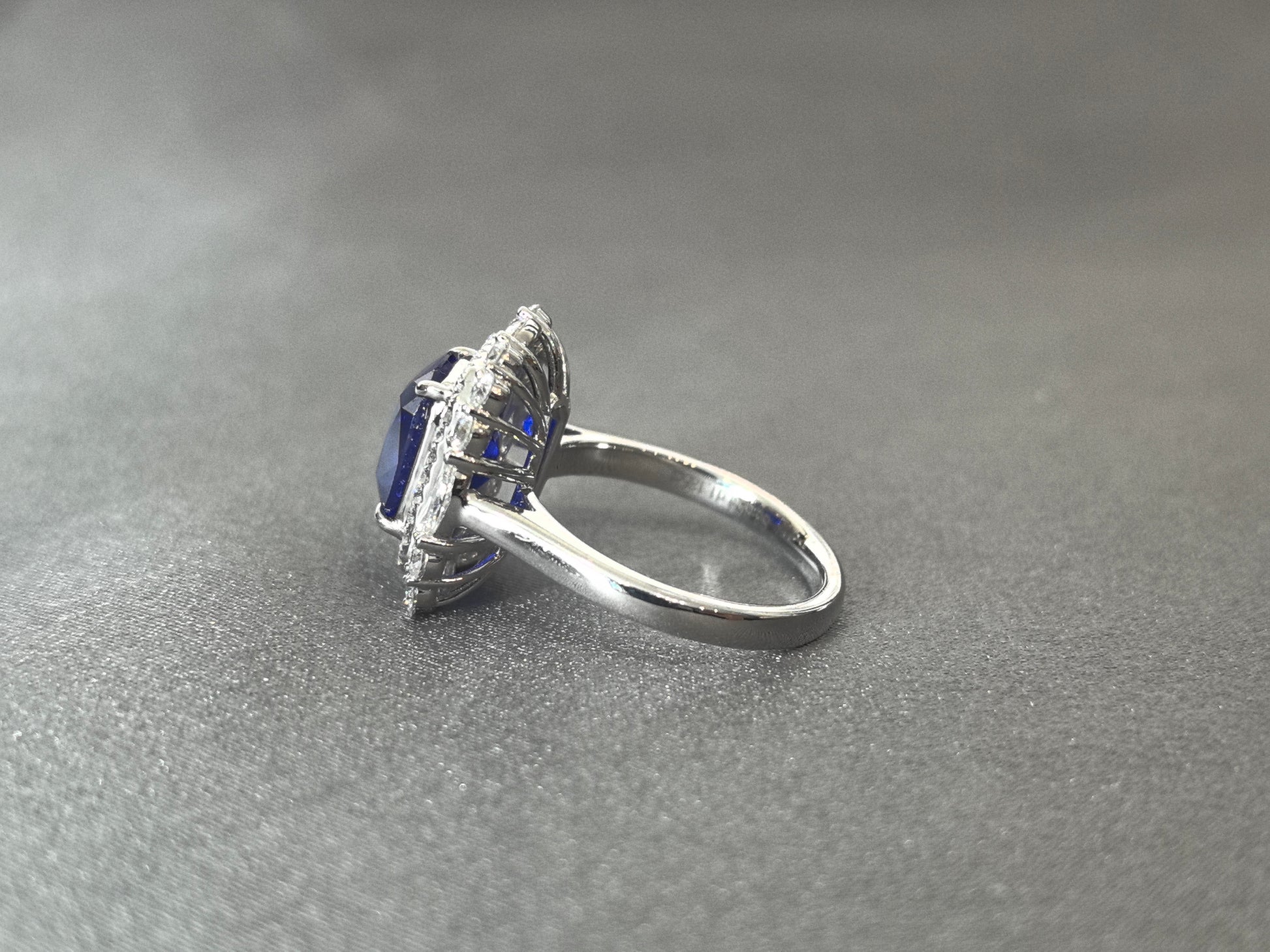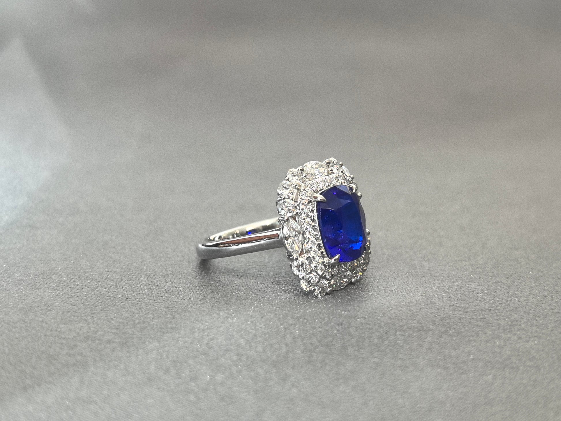 Dive into the depths of celestial beauty with this breathtaking ring featuring a magnificent cushion-cut vivid blue lab-grown sapphire as its centerpiece. The gemstone's intense cobalt-blue hue is embraced by two concentric halos of brilliant-cut lab-grown diamonds, creating a mesmerizing ripple effect that enhances both the sapphire's saturation and the overall sparkle.