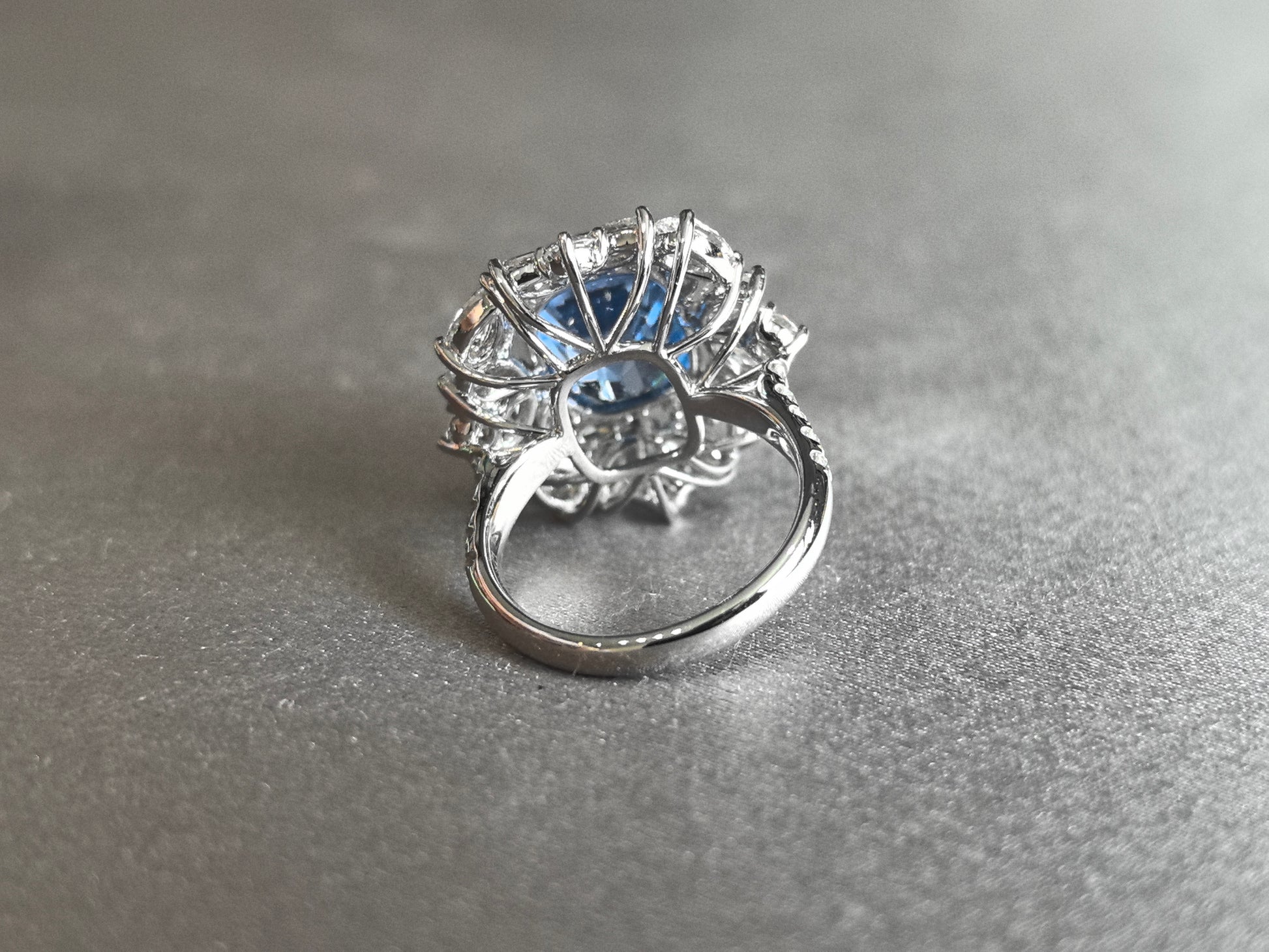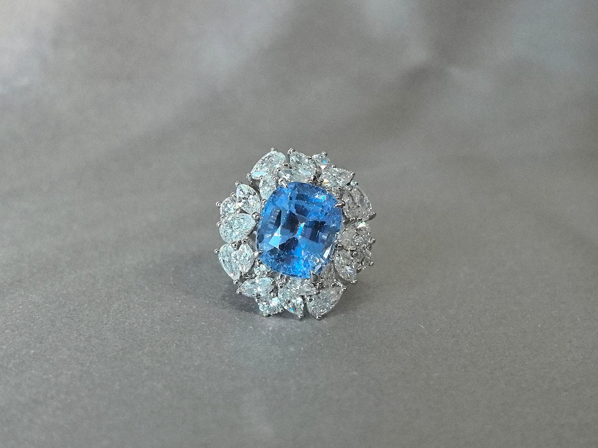This enchanting ring features a serene cushion-cut aquamarine center stone, embraced by a halo of pear and marquise lab-grown diamonds. The delicate blue hue of the aquamarine evokes tranquil waters, while the precisely set diamonds mimic crashing waves—a harmonious blend of nature’s calm and sparkling dynamism.