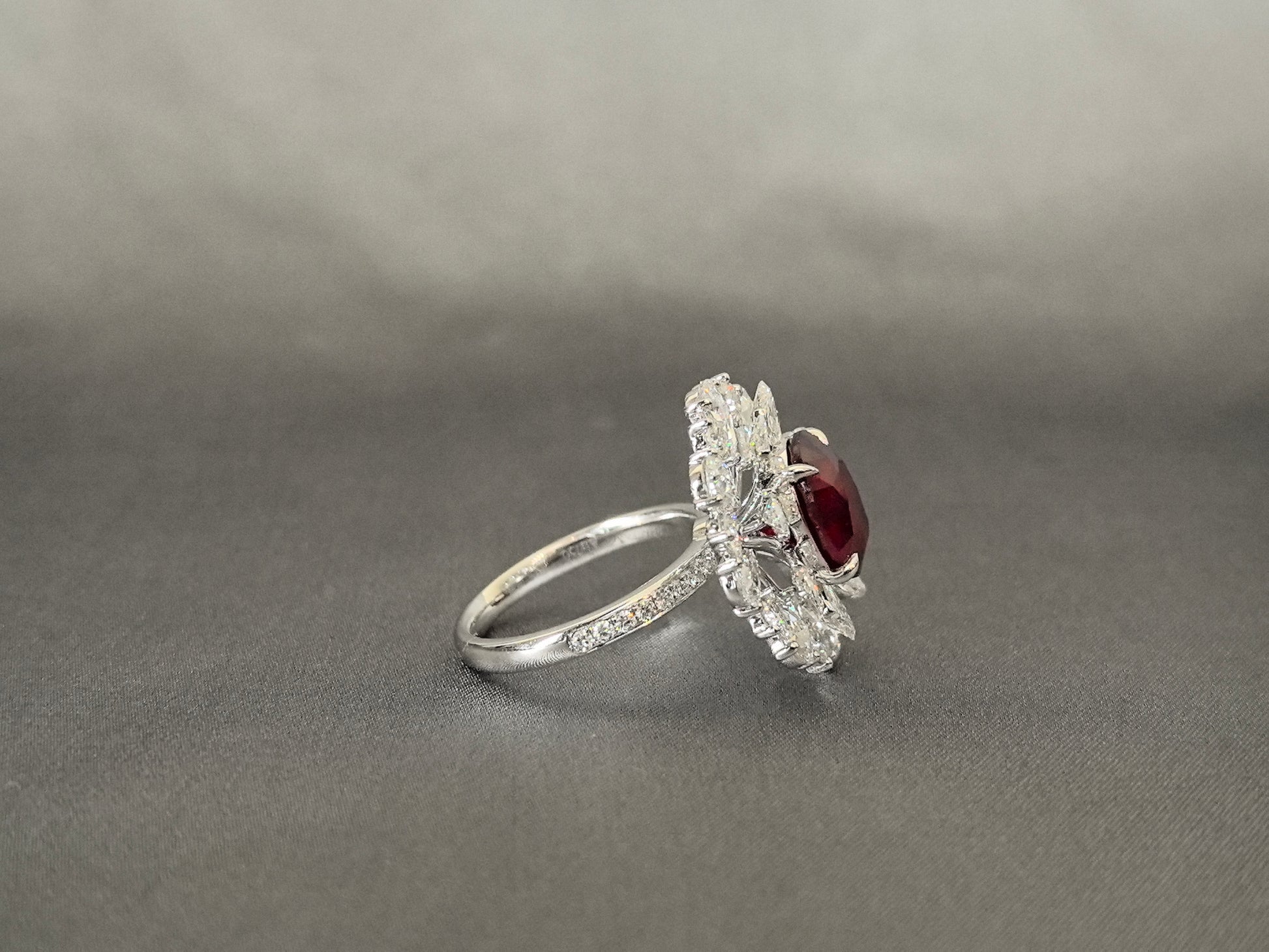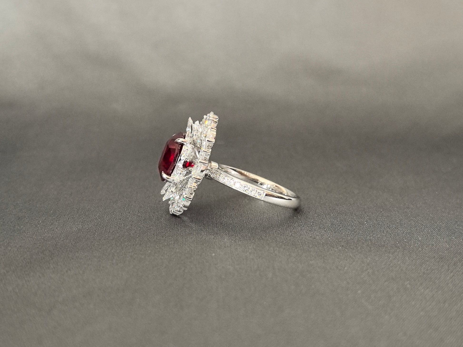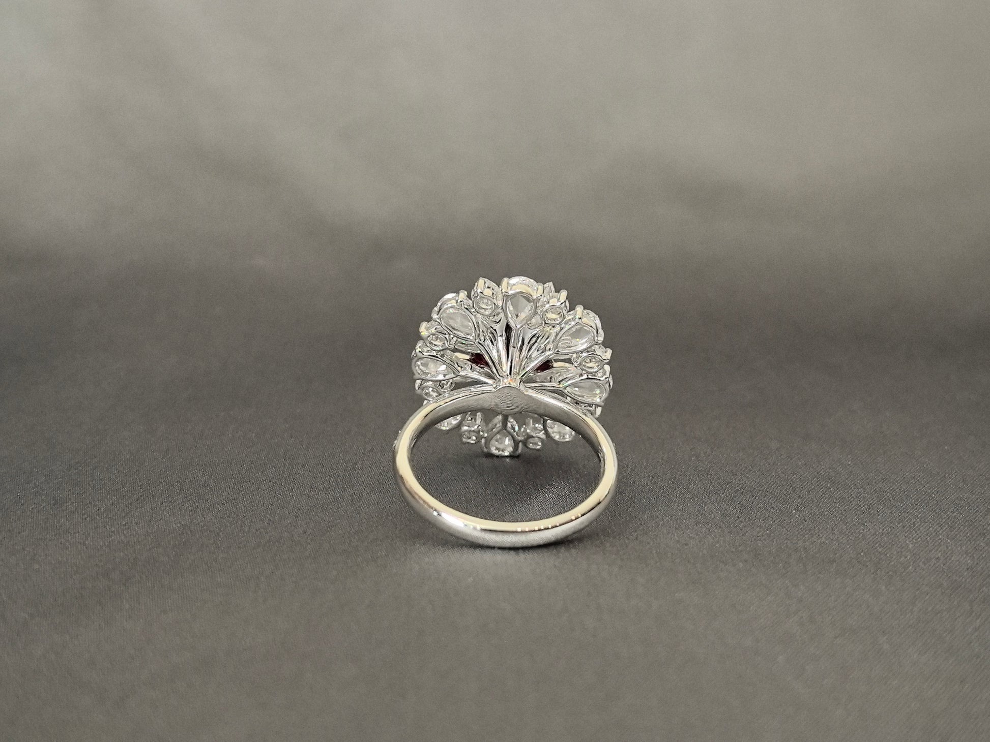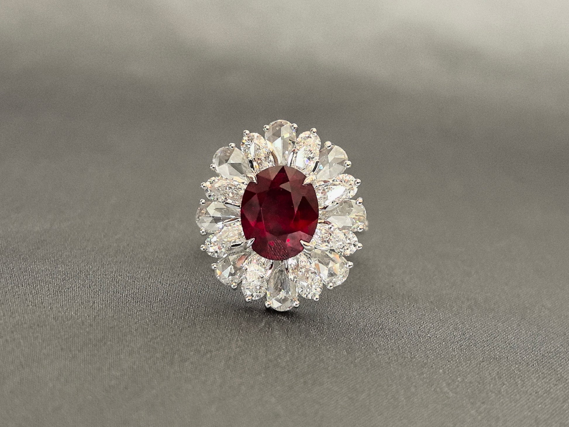 Bloom in timeless elegance with this exquisite lab gemstone ruby ring, featuring a radiant oval-cut lab ruby as its vibrant heart. Encircling the ruby are two layers of lab-grown diamonds, meticulously arranged to mimic the soft, overlapping petals of a blooming flower. The inner halo of round brilliant diamonds enhances the ruby’s fiery glow, while the outer halo of pear or marquise-cut diamonds extends the floral silhouette with graceful movement and brilliance. Set in luxurious 14K gold, this ring is a poetic fusion of color, light, and nature-inspired artistry—crafted for those who cherish both luxury and meaning.