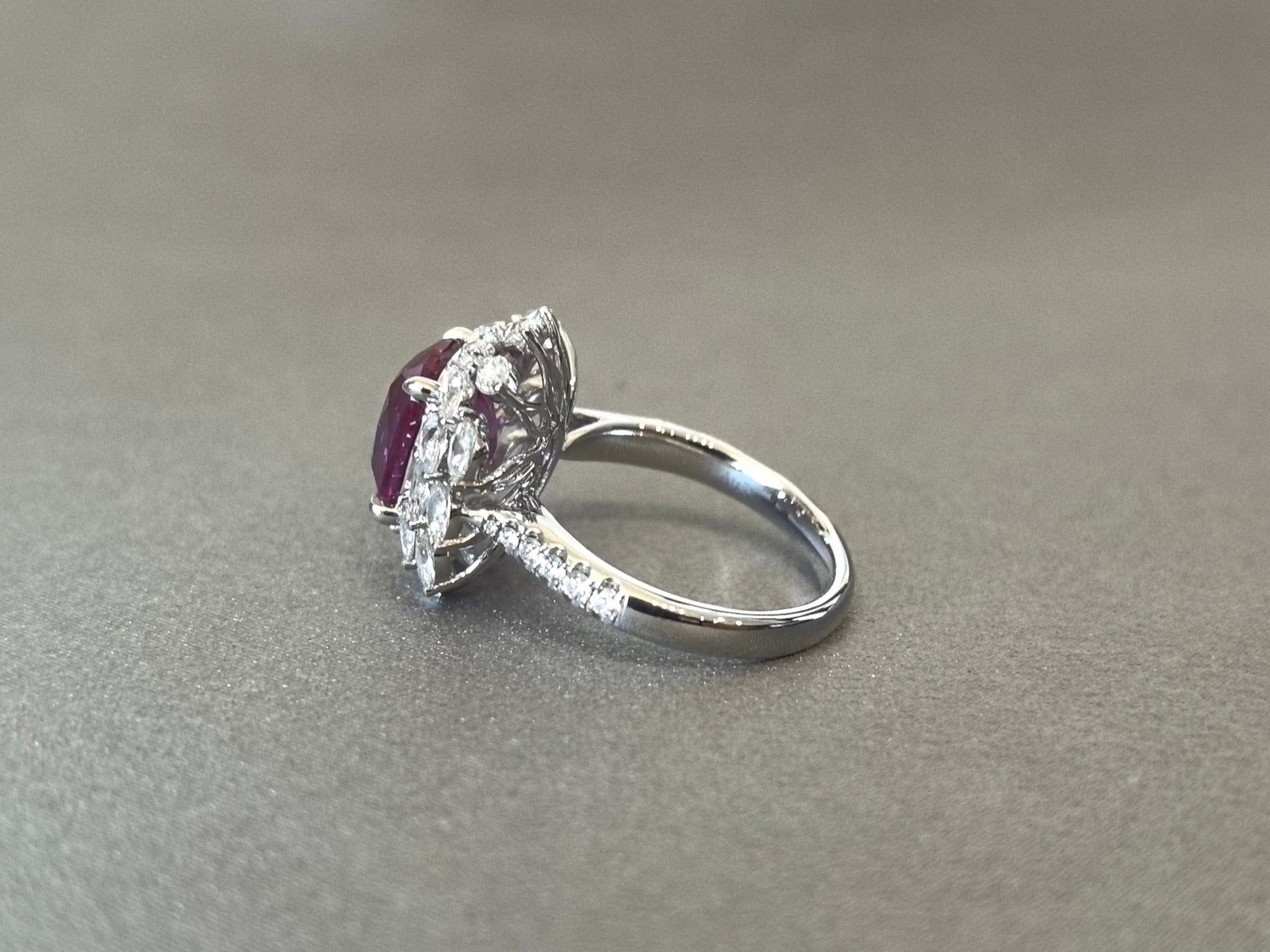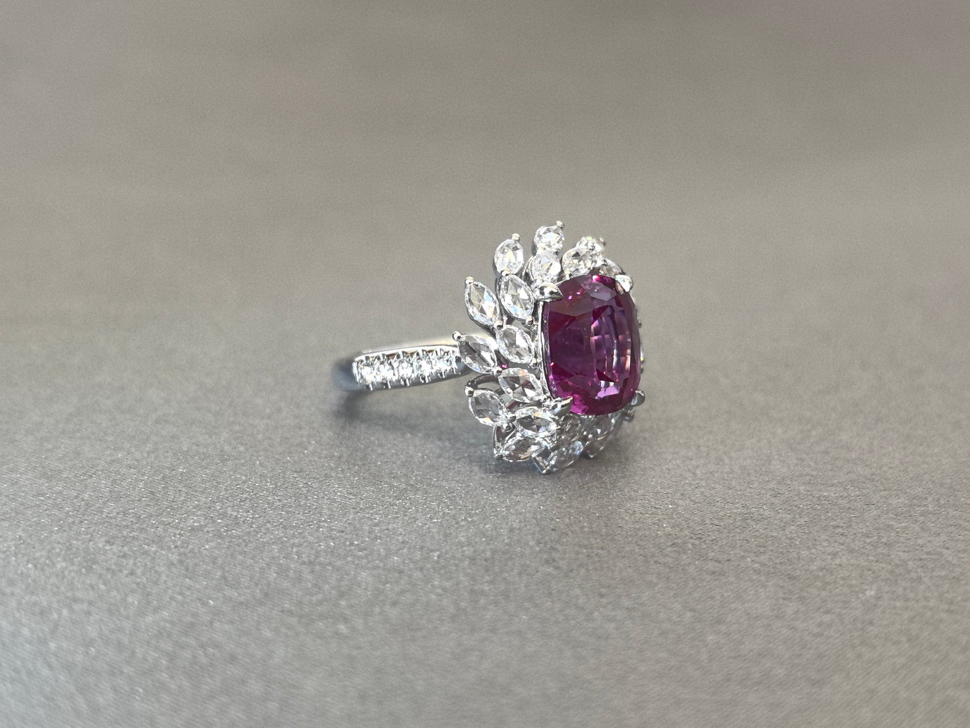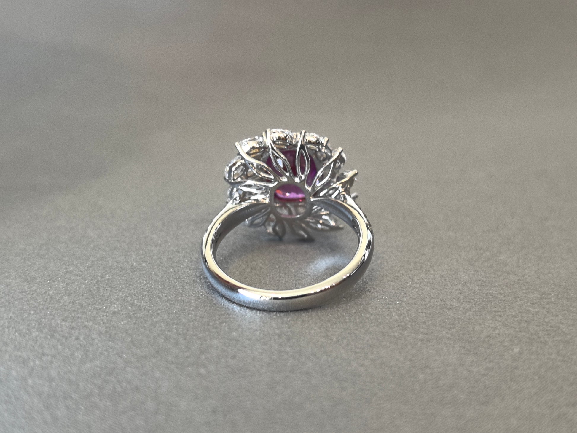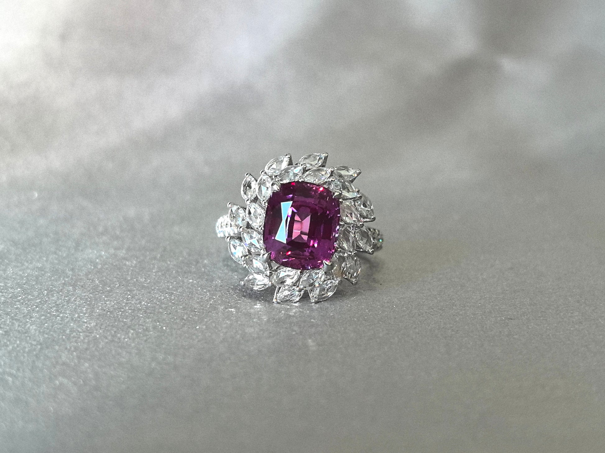 Embrace the dreamy elegance of a twilight garden with this enchanting ring featuring a captivating cushion-cut pinkish purple sapphire lab gemstone. The center stone's magical color blend is wrapped in two gracefully curved halos of pear-shaped lab-grown diamonds, creating a blooming flower effect that appears to gently embrace the gemstone. Set in warm 14K rose gold, this design captures the delicate beauty of nature through sophisticated artistry.