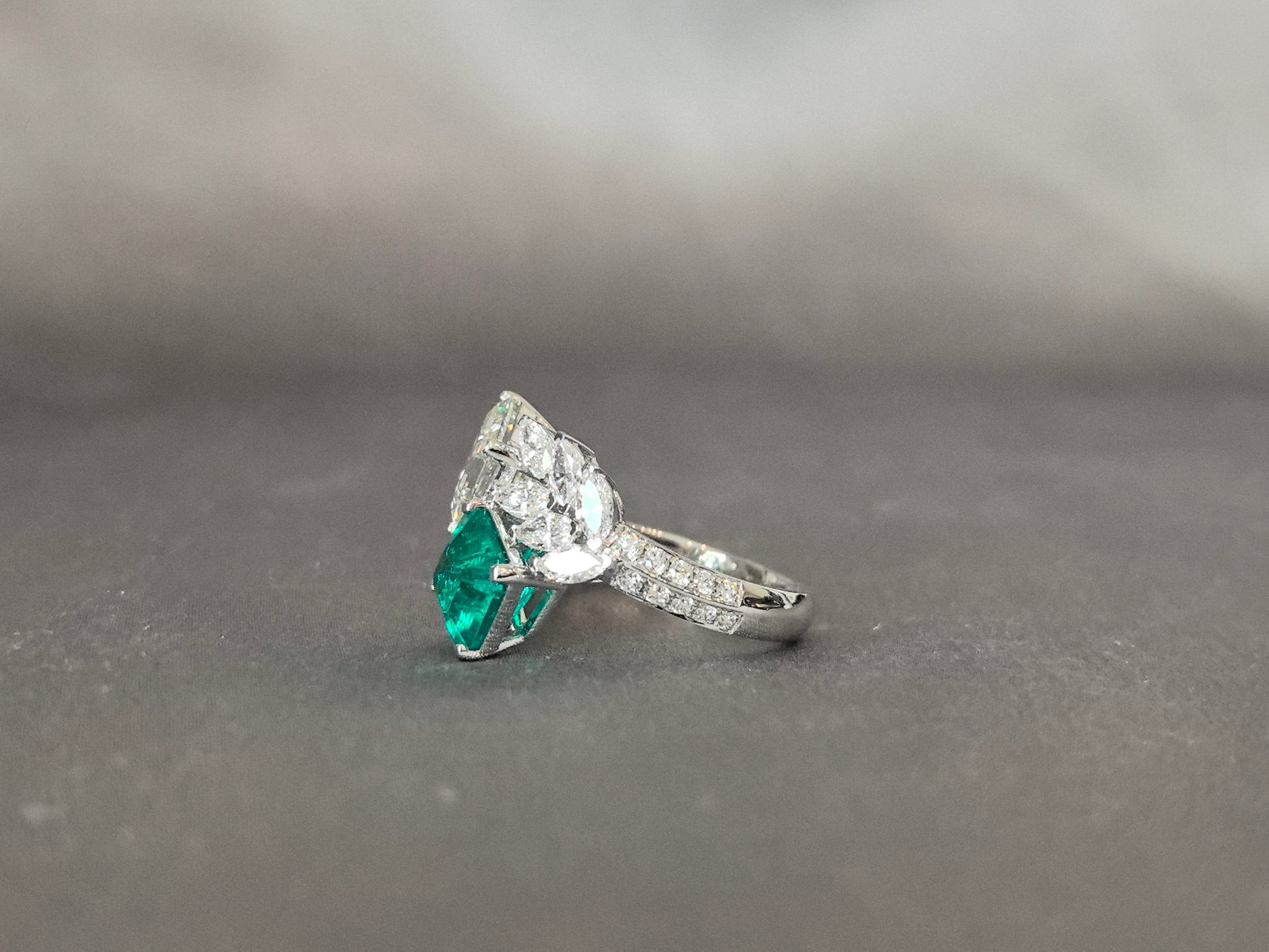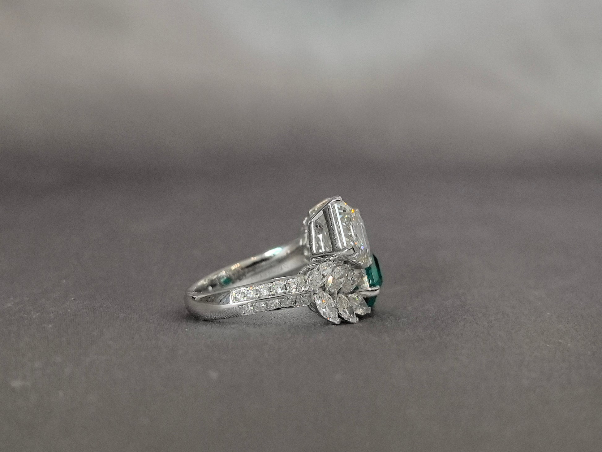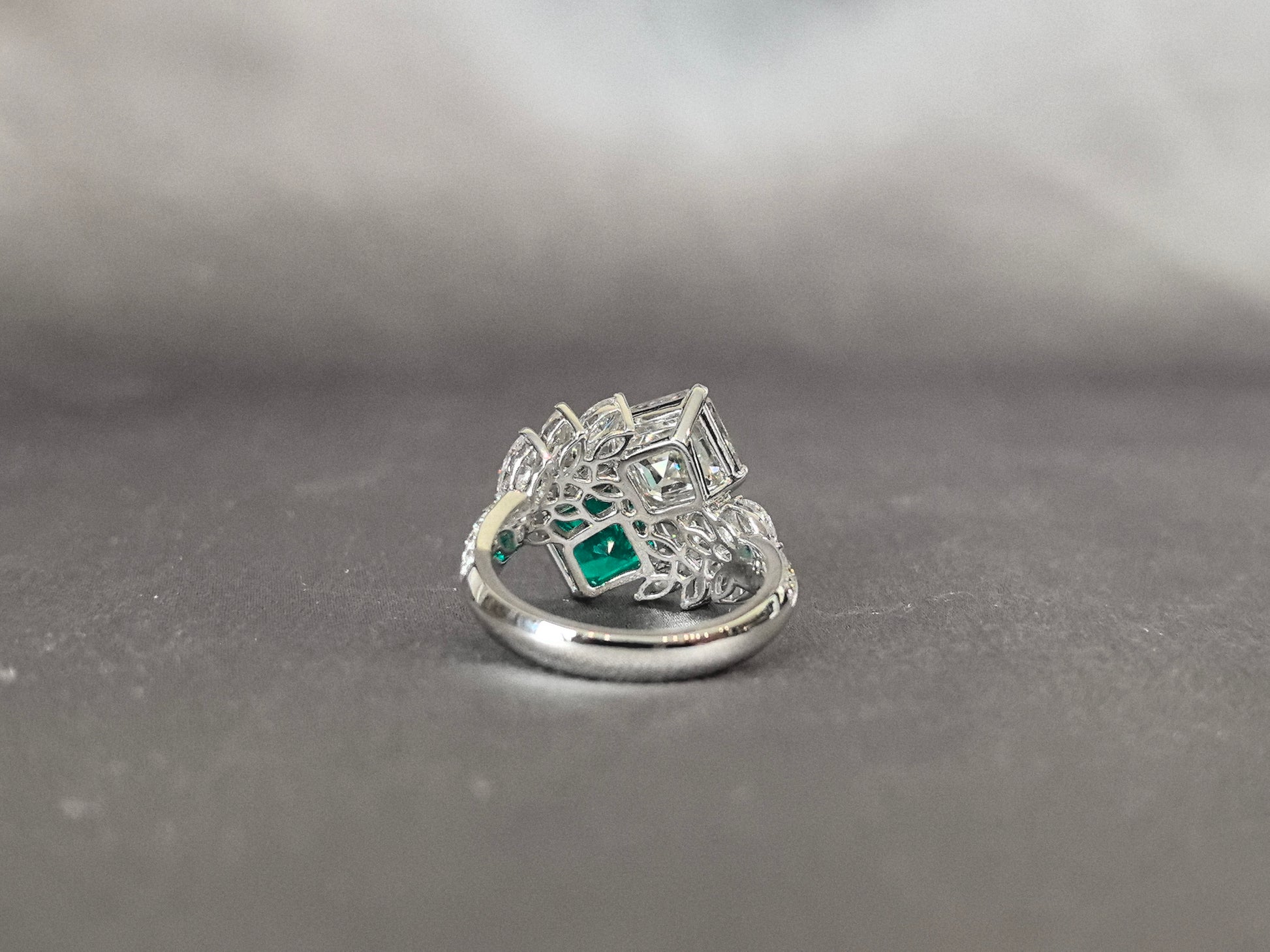 This Jacqueline-inspired engagement ring features a 3-carat Asscher-cut diamond opposite a 2-carat lab-grown Colombian Muzo emerald, framed by 12×20-point marquise diamonds (6 per side) in leaf-like settings.