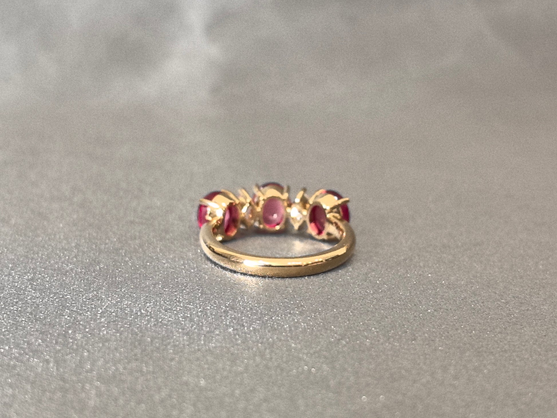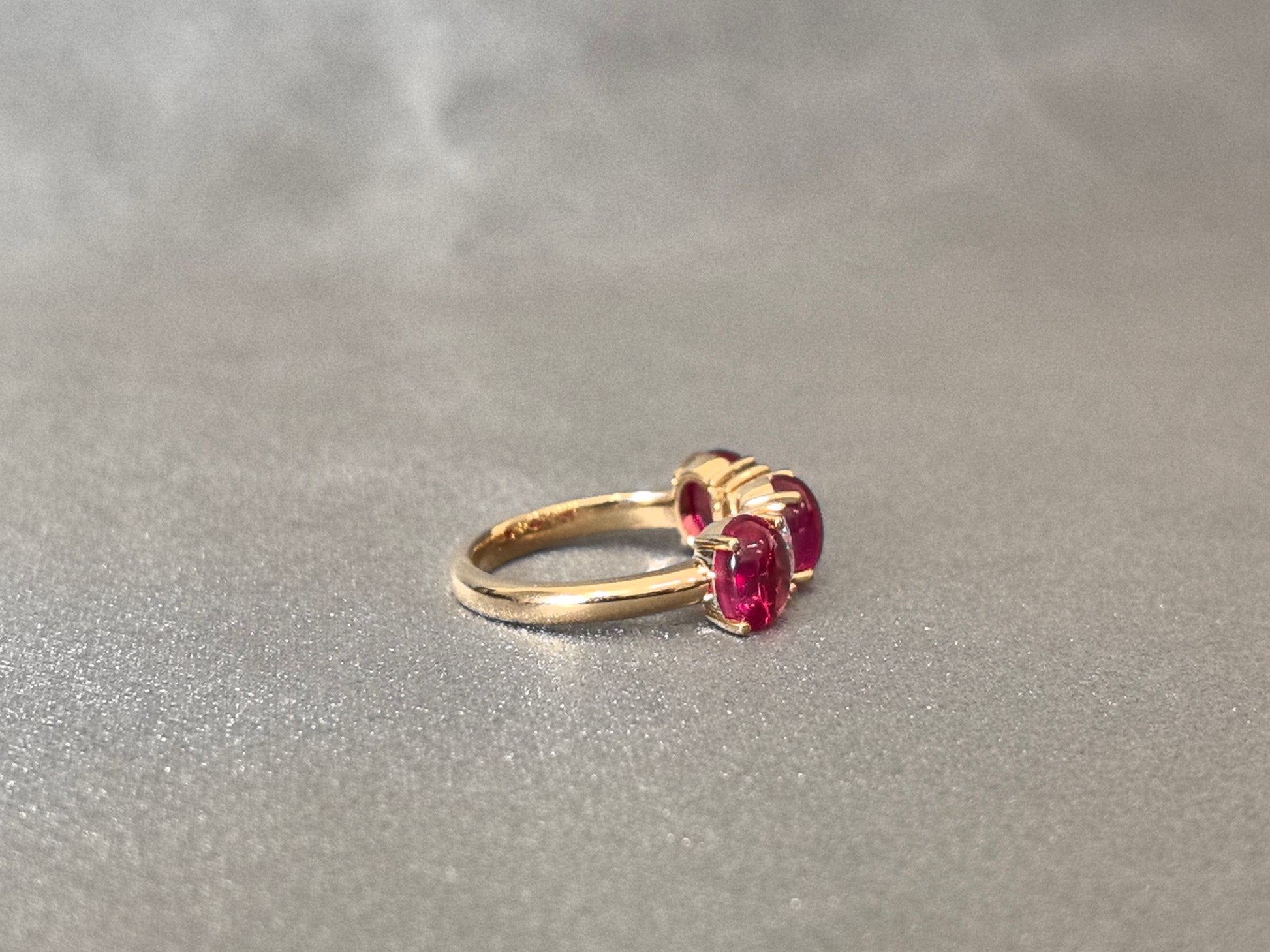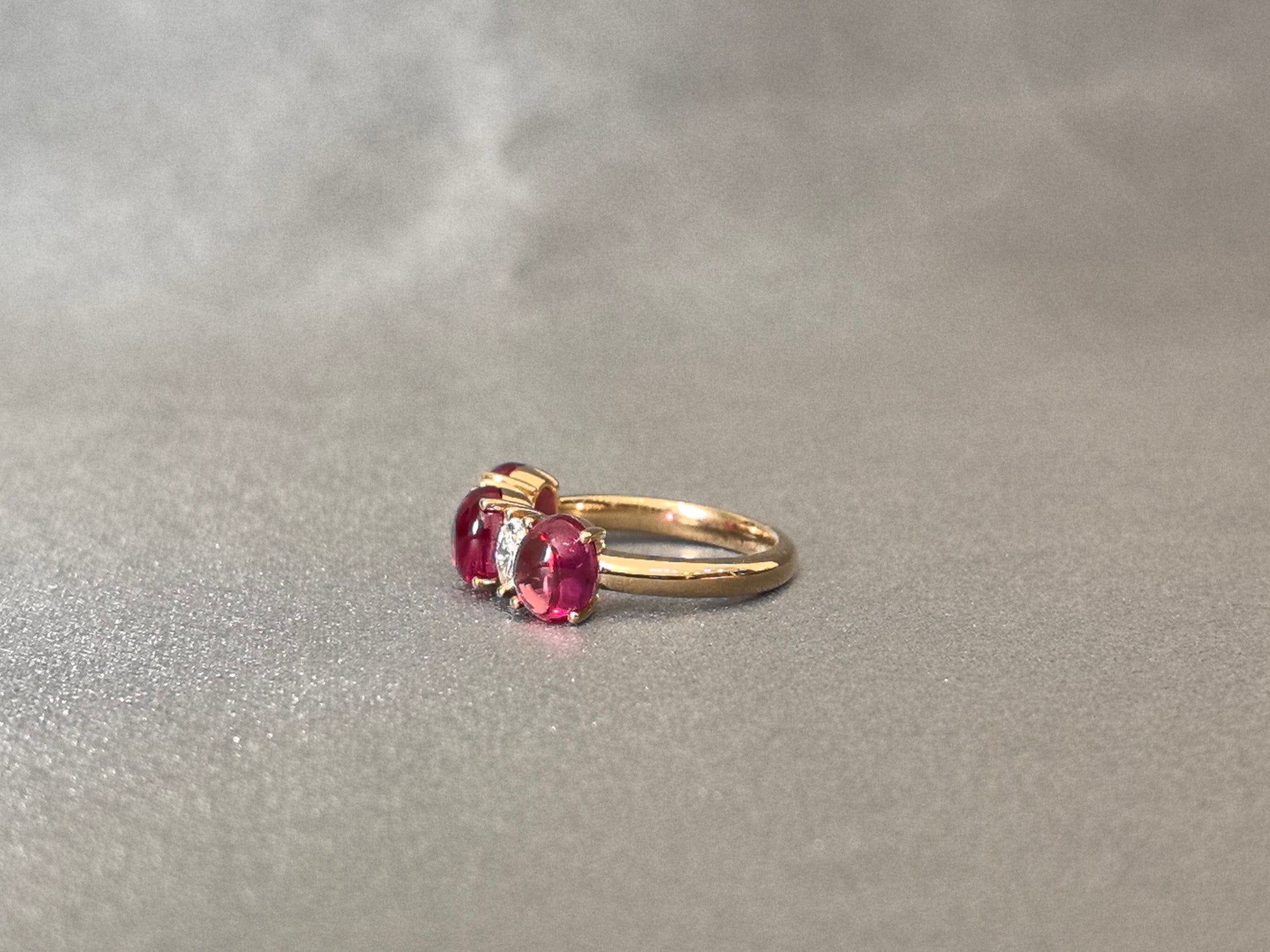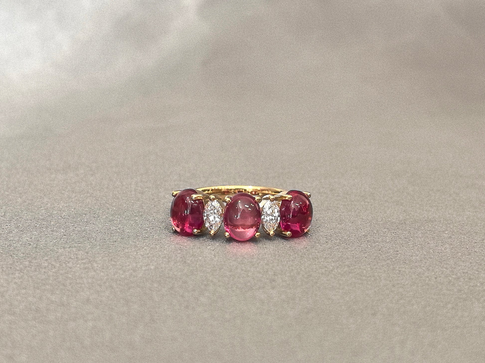Unveil a masterpiece of contrast and character with this extraordinary ring featuring three smooth cabochon lab-grown rubies and two dazzling marquise-cut lab diamonds. The rich, velvety glow of the cabochon rubies—symbolizing passion and vitality—is artfully juxtaposed with the sharp, elongated brilliance of the marquise diamonds, representing clarity and elegance. Set in lustrous 14K gold, this design harmonizes organic softness with geometric precision, creating a truly unique piece for the bold and discerning.