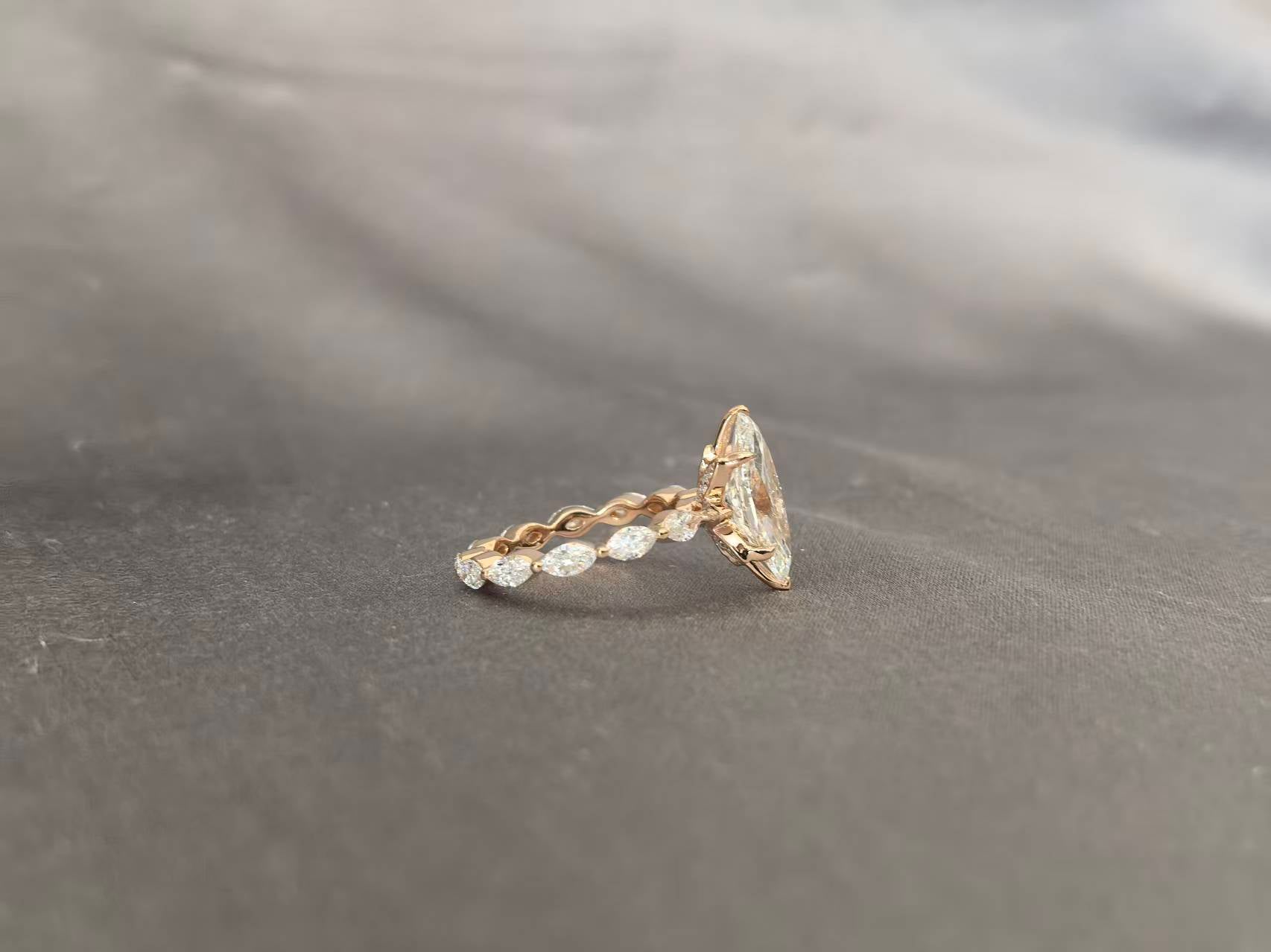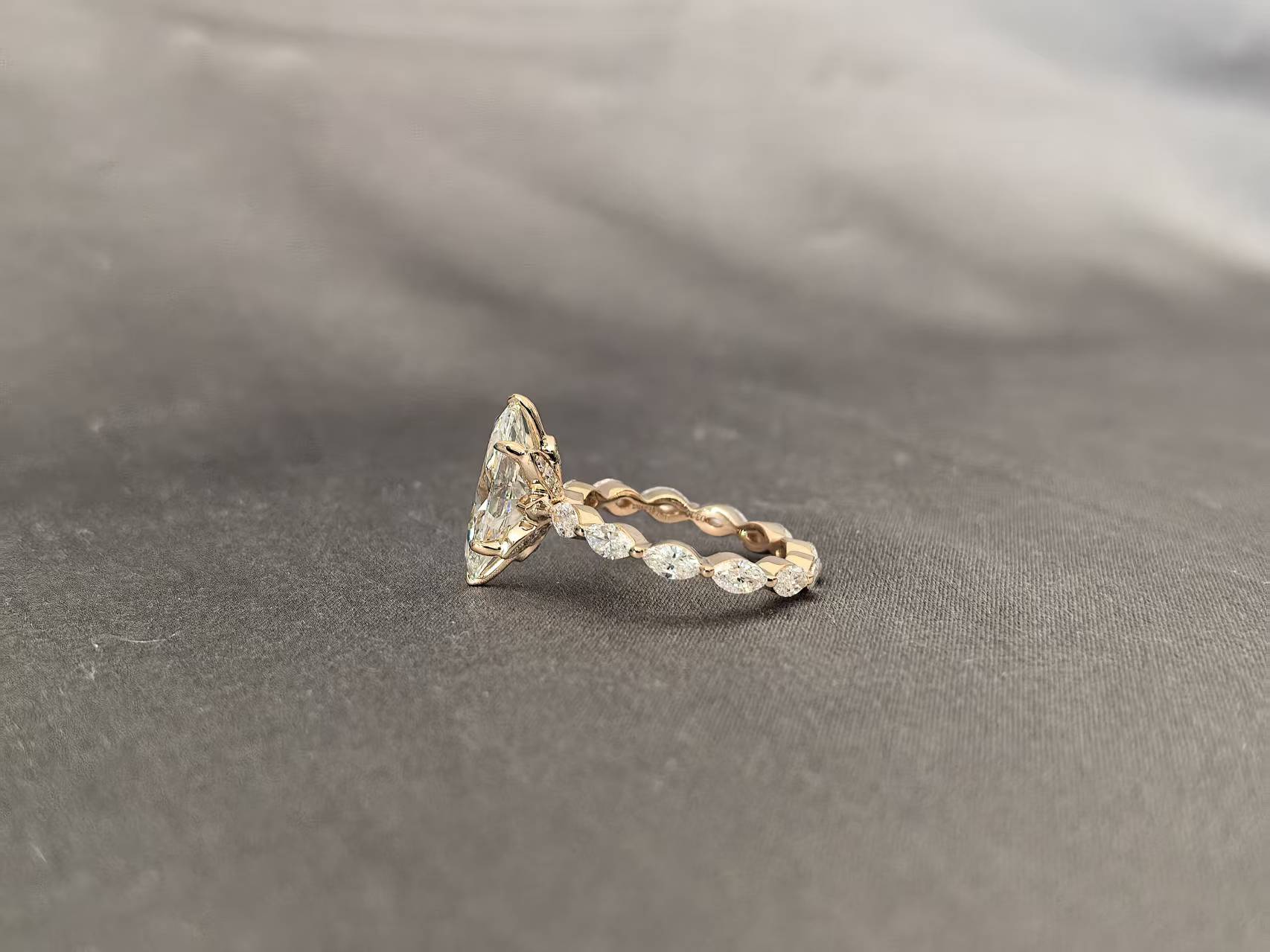 Embrace the art of geometry and light with this stunning marquise cut lab diamond full eternity ring. Composed entirely of marquise-cut lab-grown diamonds set in a continuous, flowing band, this ring captures the eye with its elongated curves and brilliant sparkle. Each diamond is carefully aligned to create a seamless, sculptural effect—reminiscent of celestial light trails or unfolding petals. Expertly crafted in 14K gold, this piece is a wearable work of art for those who value bold design and ethical elegance.