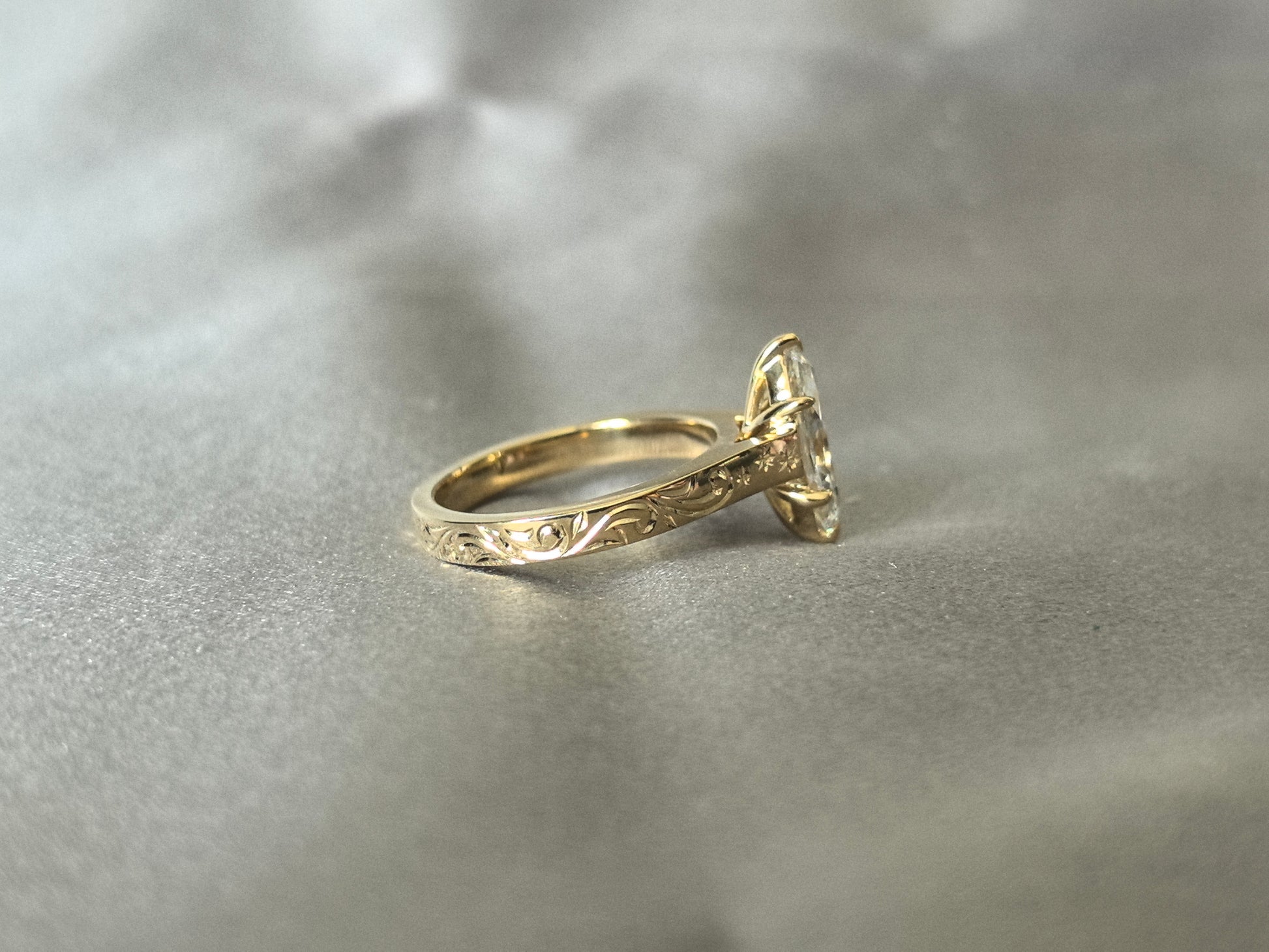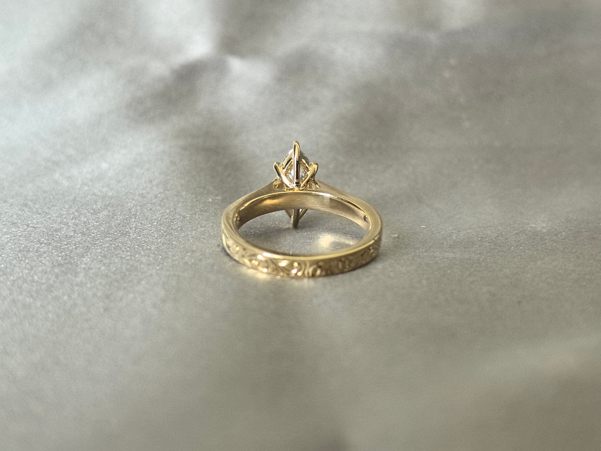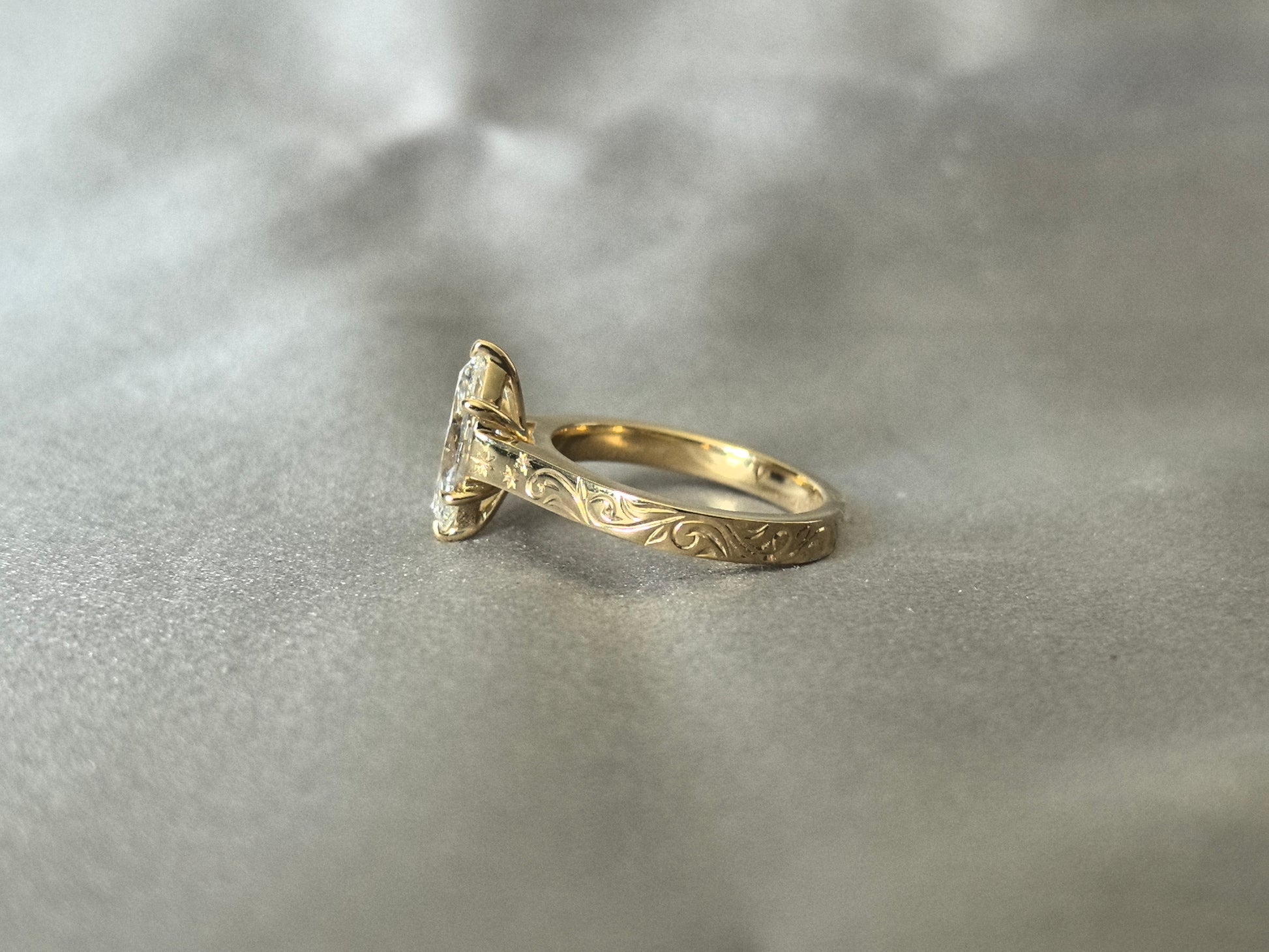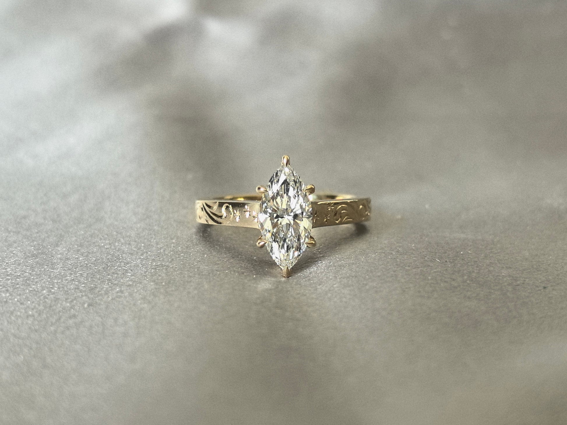 Step into a realm of timeless elegance with this marquise lab-grown diamond ring, where the elongated brilliance of the marquise cut meets the artistry of vintage-inspired engraving. The flat band is adorned with intricate vintage design, evoking the charm of heirloom jewelry, while the marquise diamond takes center stage with its captivating sparkle. Crafted in luxurious 14K gold, this piece harmoniously blends historical artistry with modern ethical luxury, making it a perfect symbol of refined taste and enduring beauty.