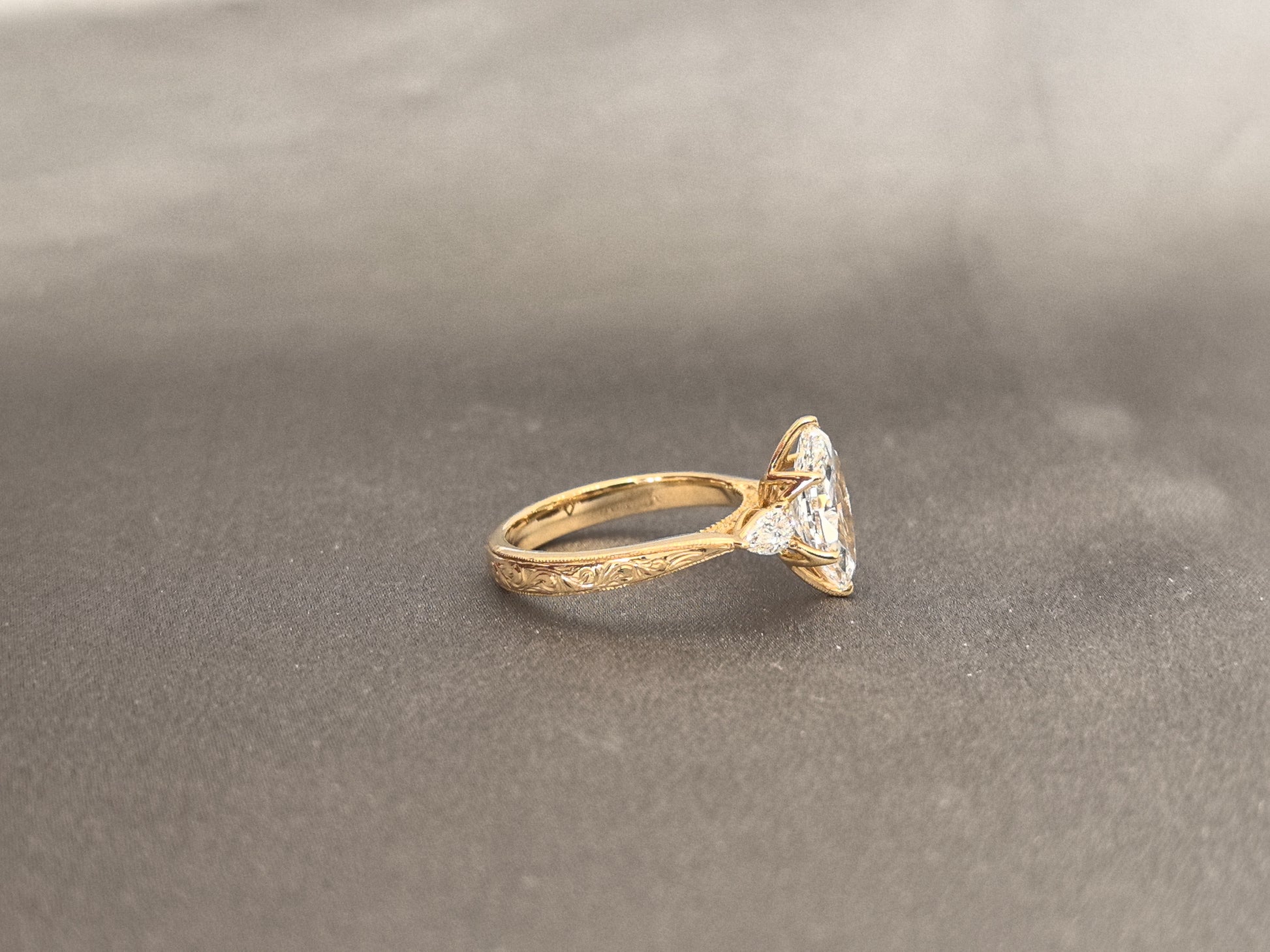 Embrace the artistry of vintage-inspired design with this exquisite marquise lab diamond ring, where intricate metalwork meets celestial brilliance. At its heart, a marquise-cut lab diamond takes center stage, cradled by a delicately sculpted floral prong setting that evokes the beauty of a blooming flower. The band is adorned with complex engraved花纹, adding a touch of old-world charm, while two pear-cut lab diamonds grace the shoulders, symbolizing tears of joy and new beginnings. Crafted in 14K gold, this ring is a timeless tribute to romance, craftsmanship, and ethical luxury.