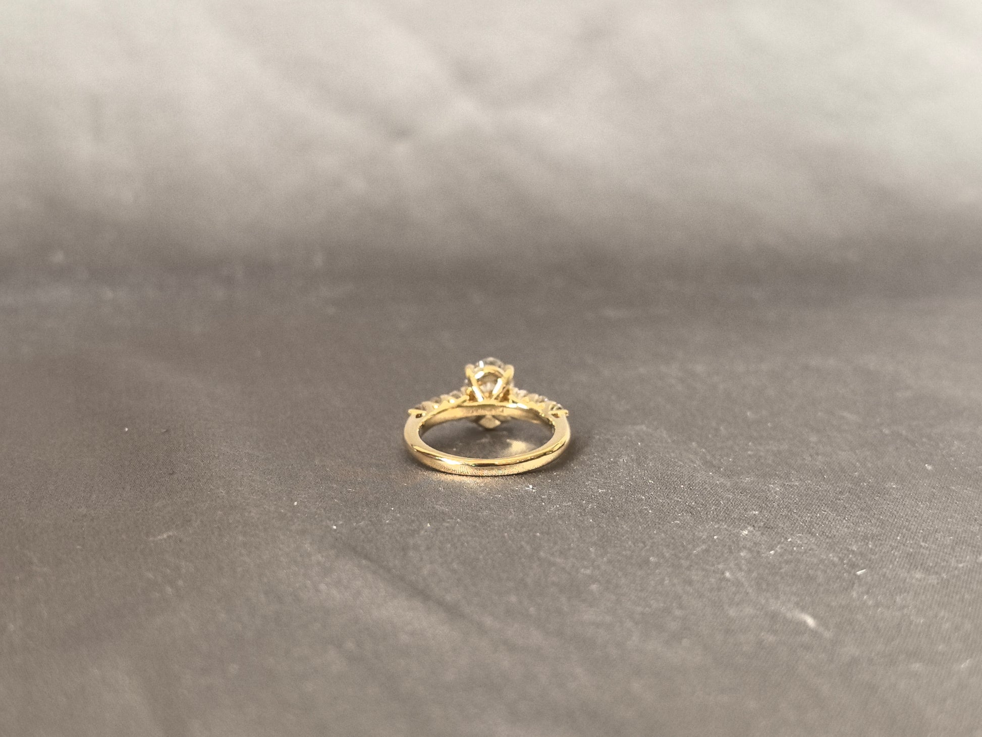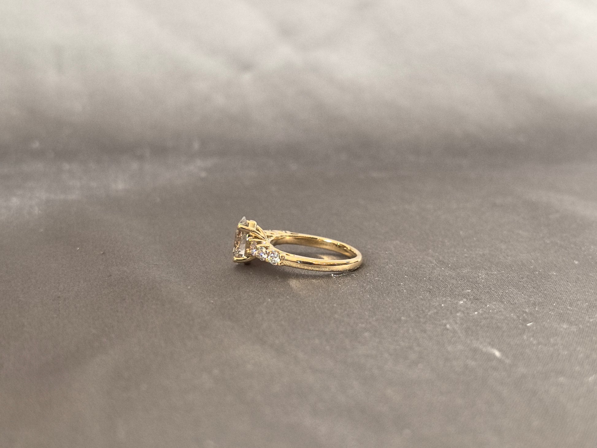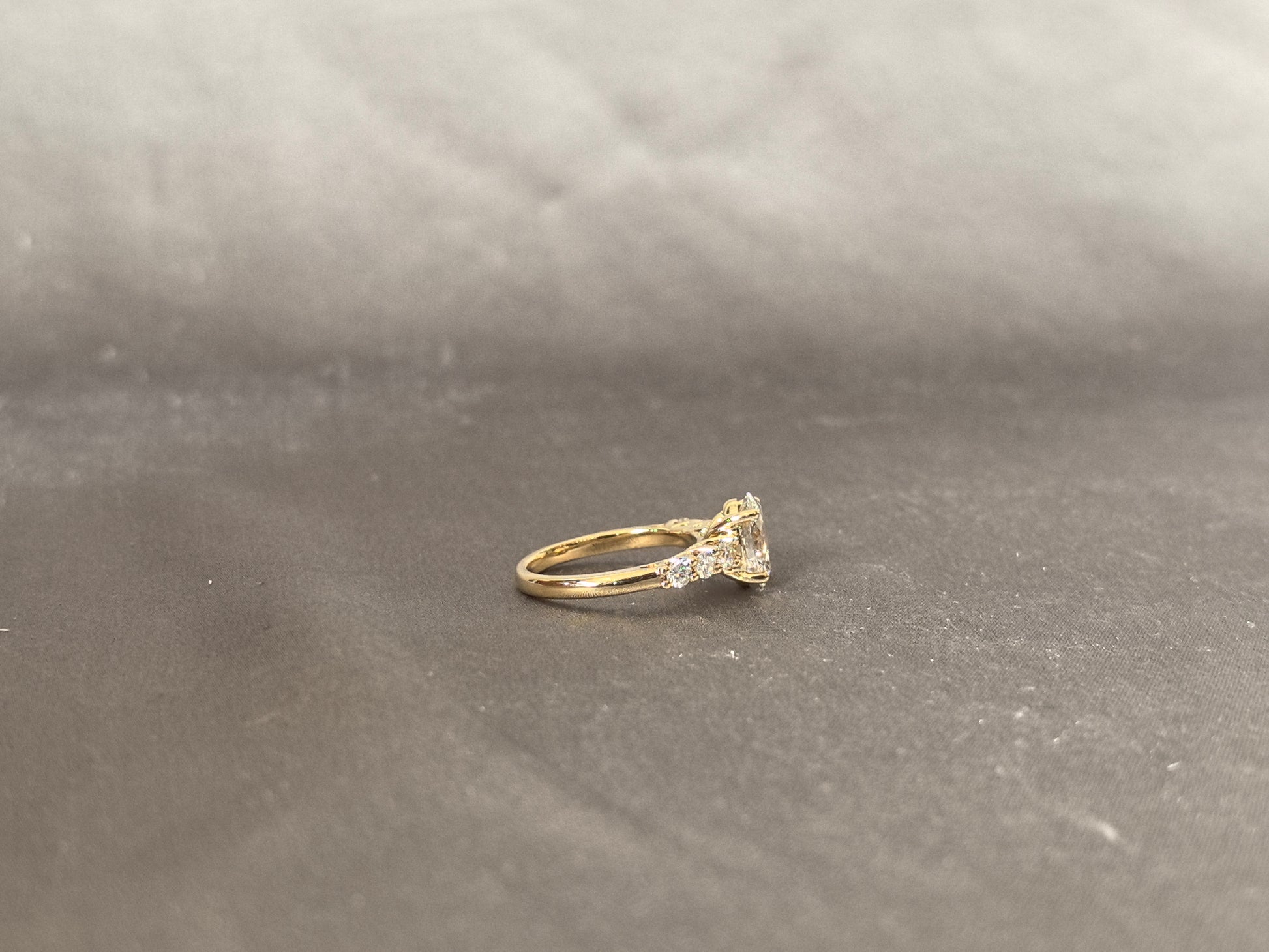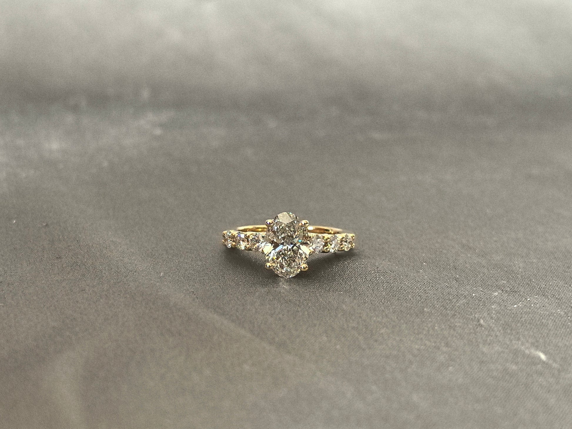 This elegant engagement ring captures the enduring beauty of a classic solitaire with thoughtfully curated details. At its heart rests a stunning 1.08 carat oval cut lab grown diamond, a shape prized for its soft, elongated silhouette and exceptional brilliance that flatters the finger with every glance.