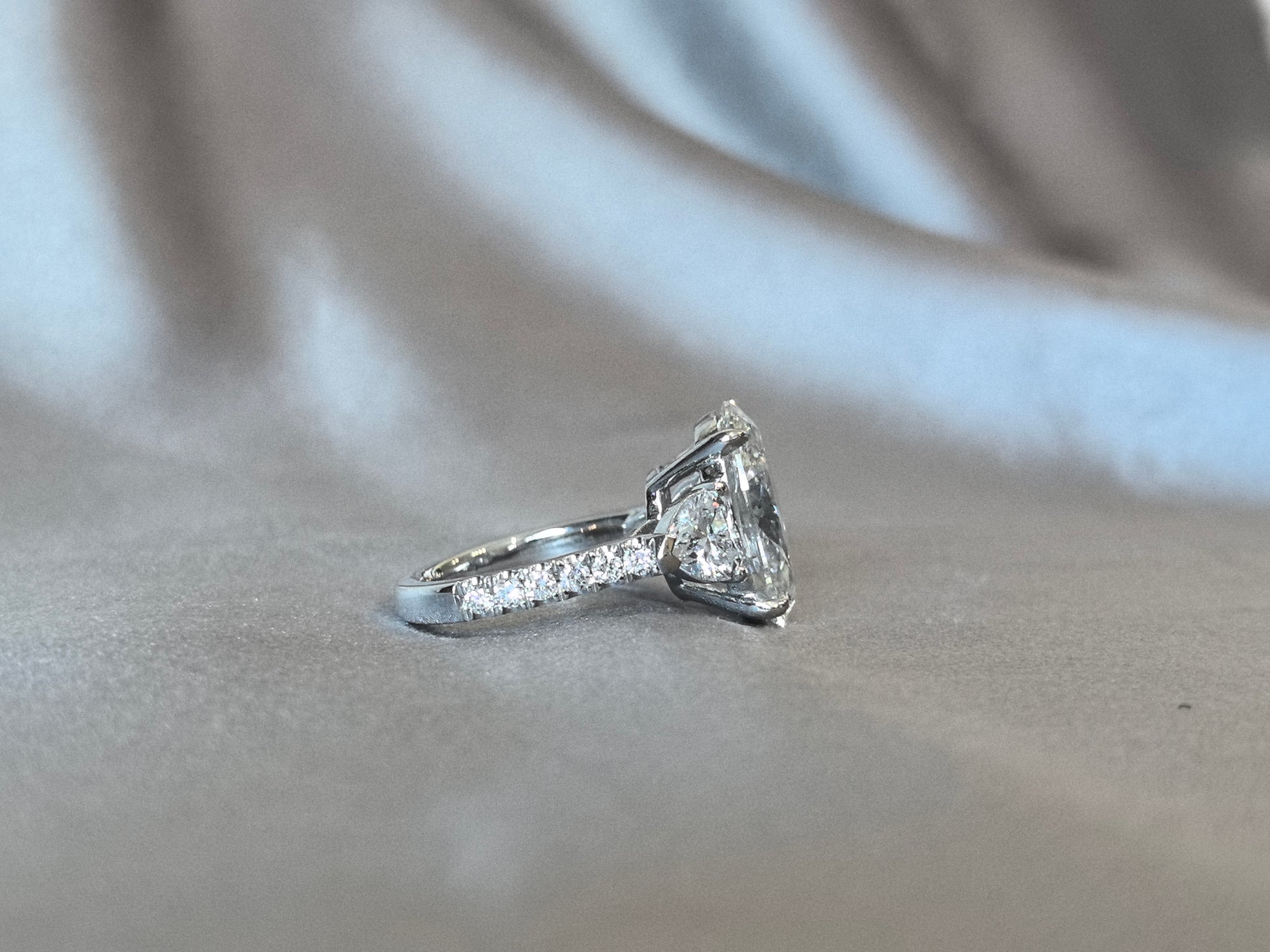 A deeply personal symbol of love, crafted for a lifetime. This luxurious three-stone ring tells a unique story, featuring a central oval-cut lab-grown diamond flanked by two heart-cut lab-grown diamonds. The elegant oval represents enduring commitment, while the heartfelt side stones celebrate a love that is both cherished and reciprocated, creating a composition of profound romantic symbolism and luxury.