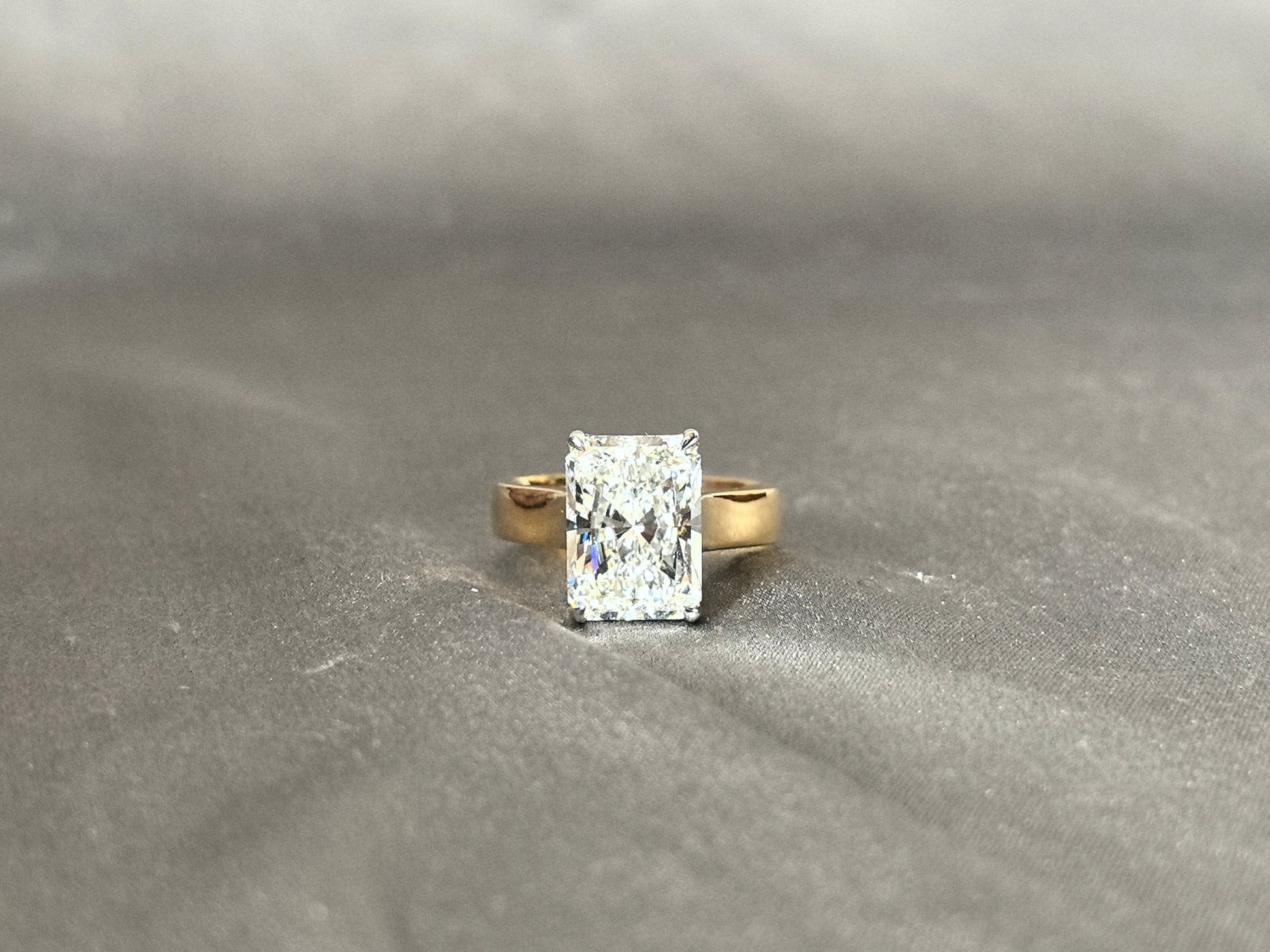 This extraordinary ring commands attention with its breathtaking scale and architectural precision. At its heart rests a magnificent 5.05 carat radiant cut lab grown diamond, a stone that masterfully combines the clean lines of an emerald cut with the brilliant fire of a round brilliant. The result is a diamond of exceptional presence, its faceted surface catching and reflecting light with every movement.