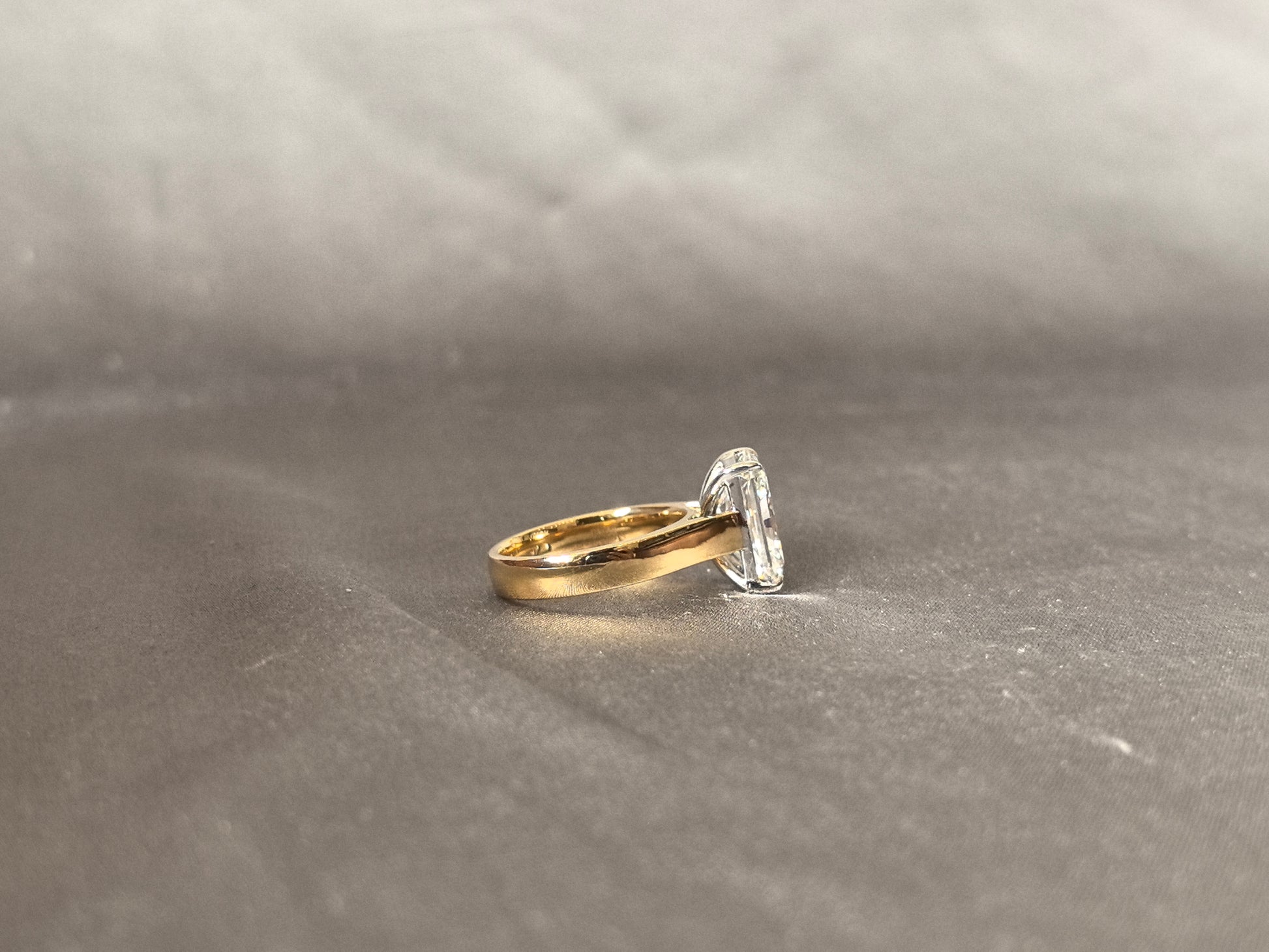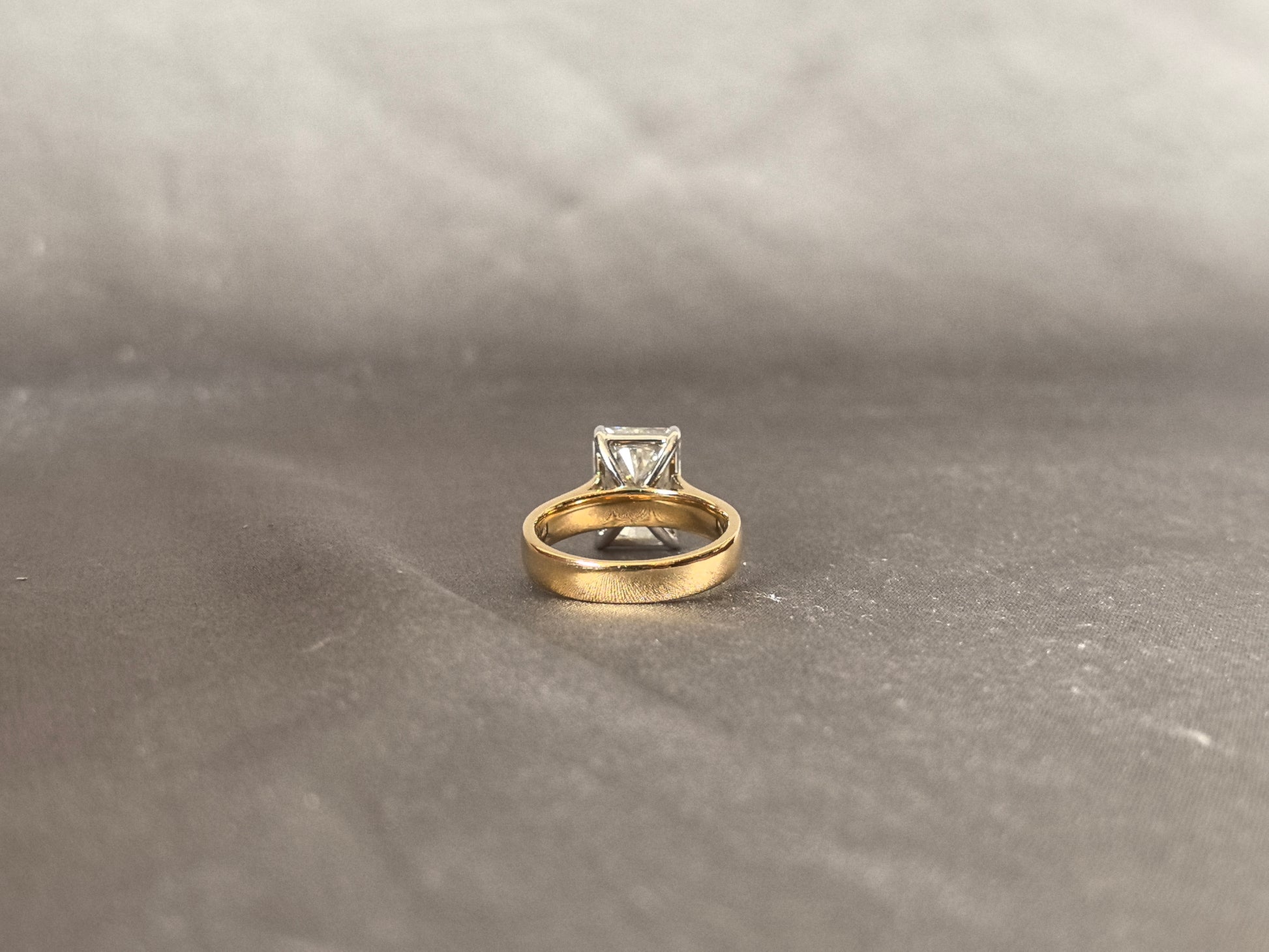 The substantial center stone is held in a four prong setting, a classic choice that allows maximum light to enter the diamond from above while providing secure, reliable hold. The prongs are deliberately substantial, designed to complement the stone's scale while maintaining an elegant, unobtrusive profile.