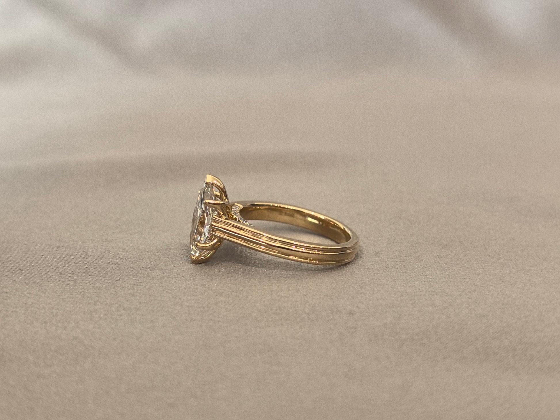 Bloom in elegance with this exquisite marquise cut lab diamond ring, where delicate floral-inspired prongs cradle the elongated stone above a sleek, linear band. The marquise diamond, symbolizing nobility and bold individuality, is highlighted by petal-shaped prongs that add a touch of organic artistry. Combined with the modern lines of the band, this design harmonizes nature’s softness with architectural precision—a perfect expression of ethical luxury and refined taste.