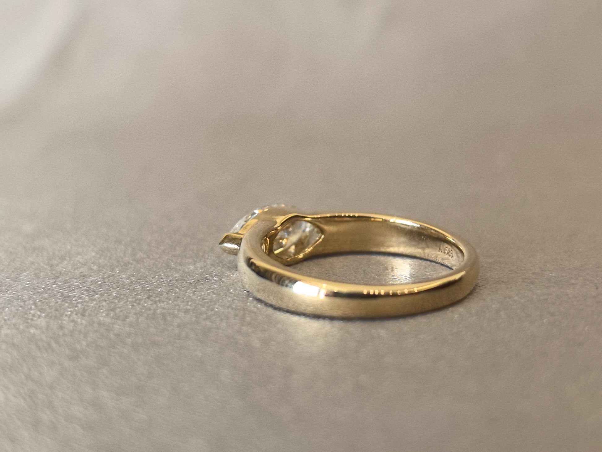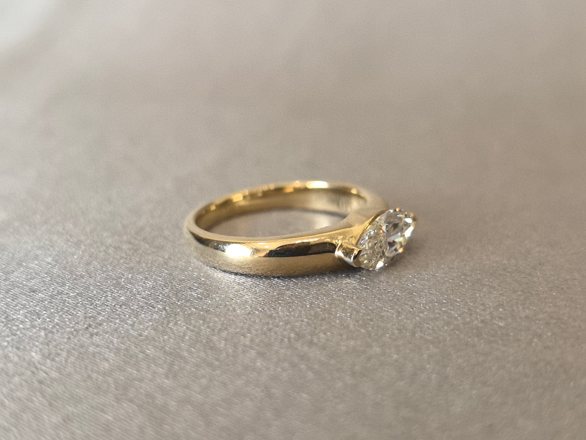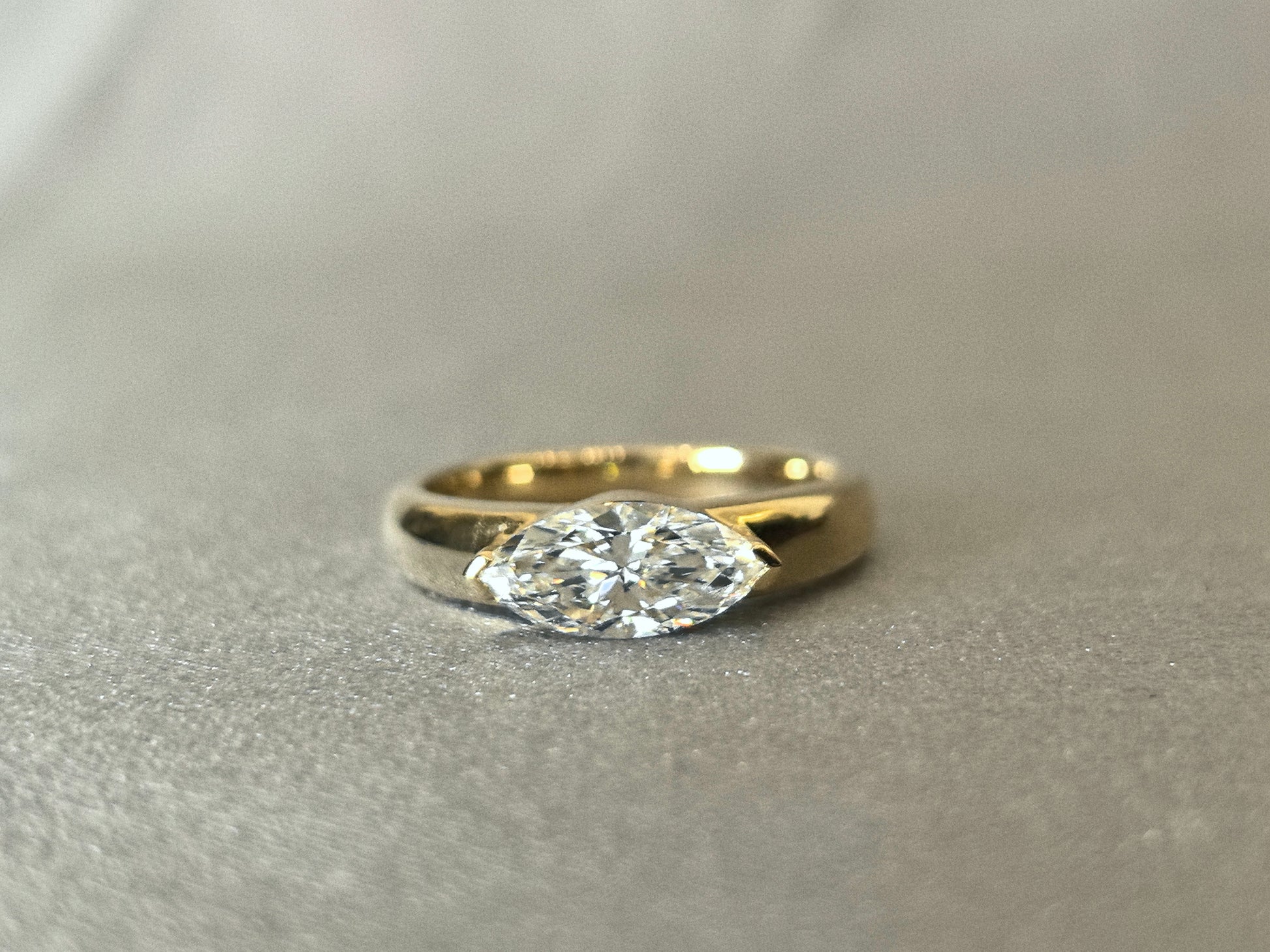 A fresh perspective on a classic. This modern solitaire ring features a 1-carat marquise-cut lab-grown diamond, set horizontally on a simple 14K gold band. This unique orientation highlights the diamond's elongated, eye-catching shape, offering a contemporary and fashion-forward twist on traditional solitaire design. Its minimalist profile makes a bold and sophisticated statement.