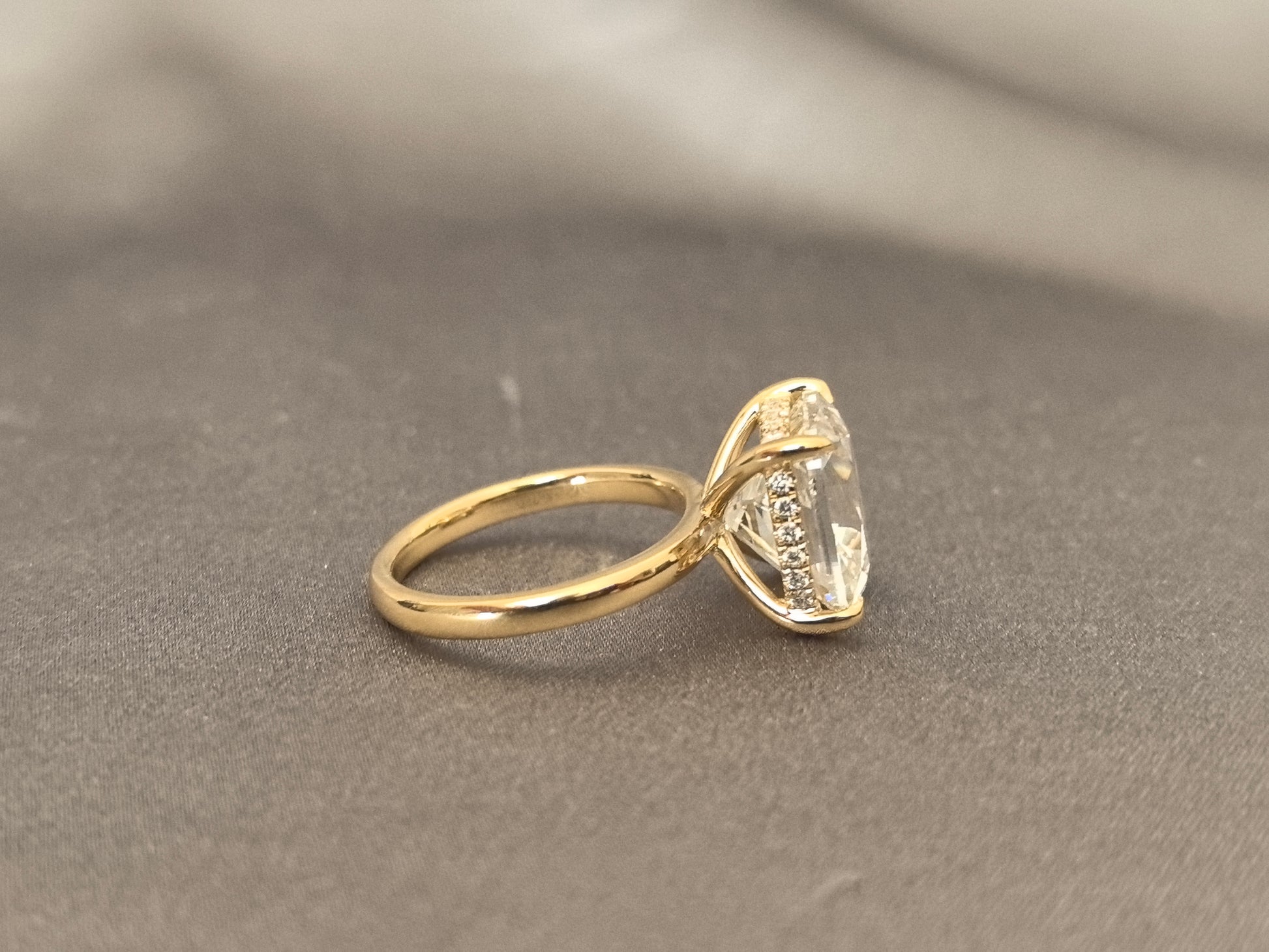 - Set in 14K white gold, it features a hidden halo of diamonds around the center stone, with tiny diamonds on the prongs.