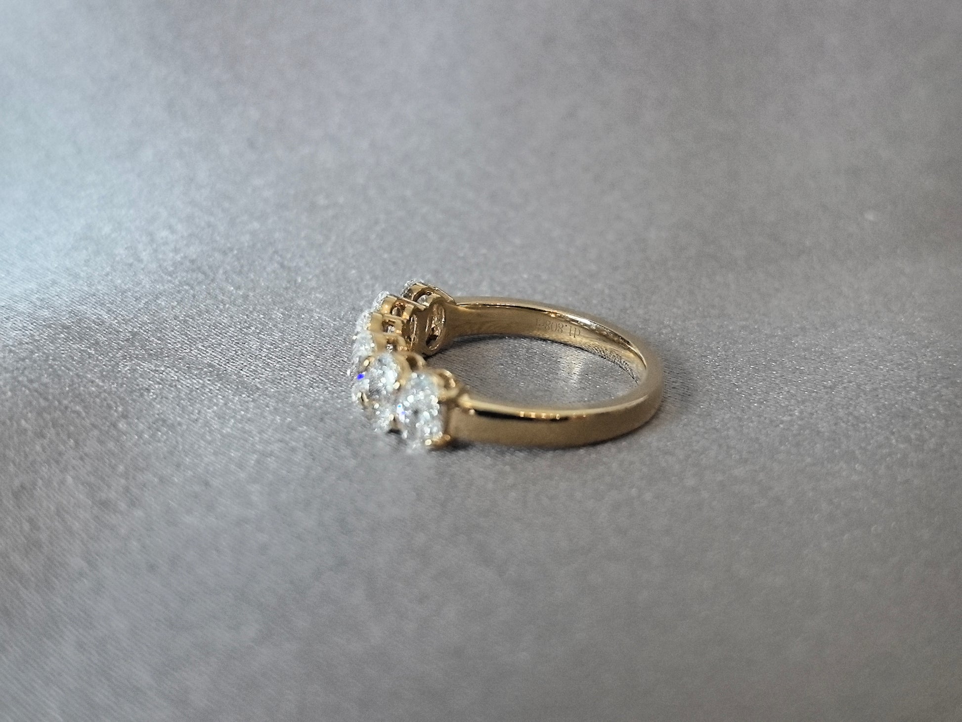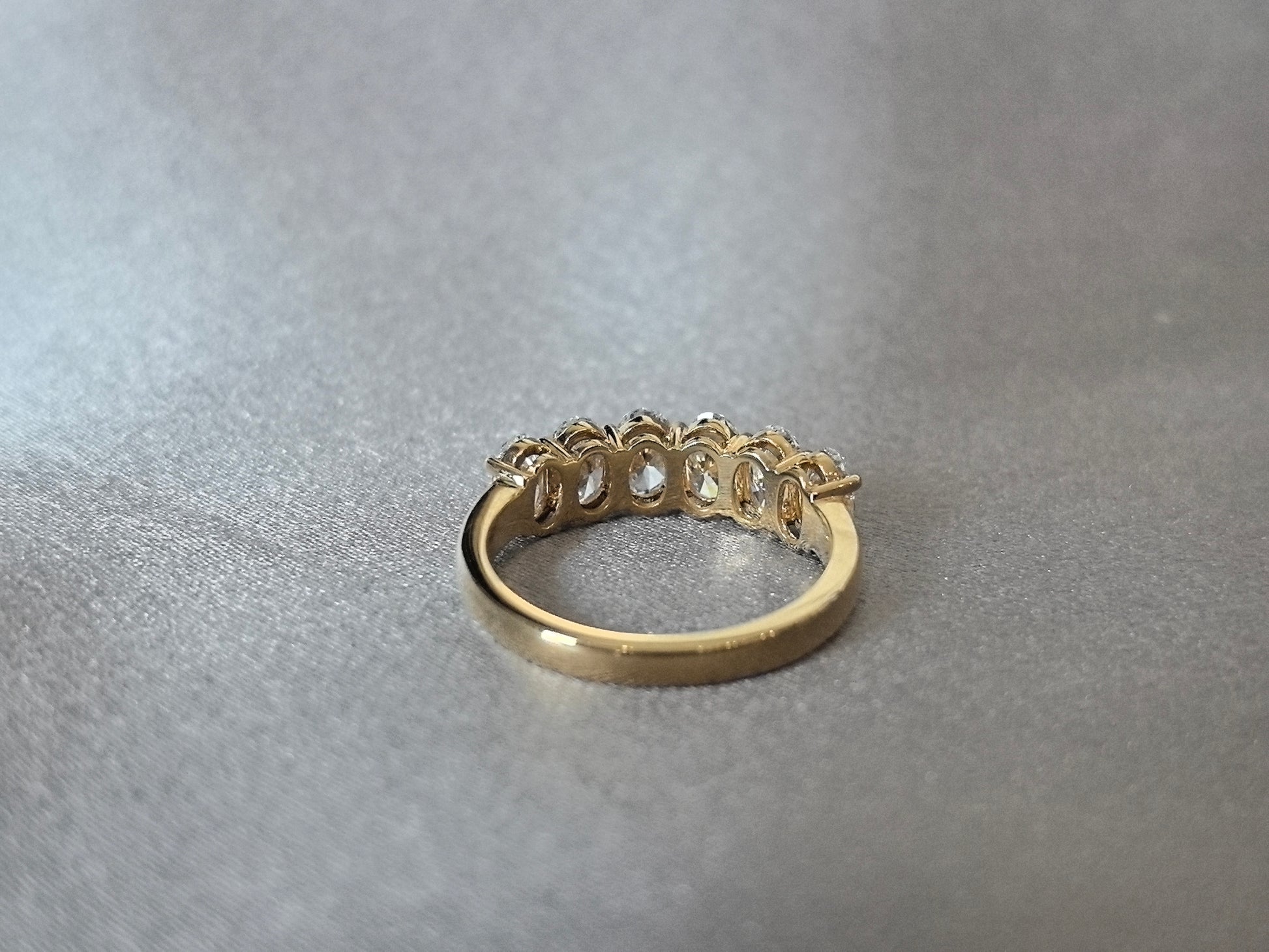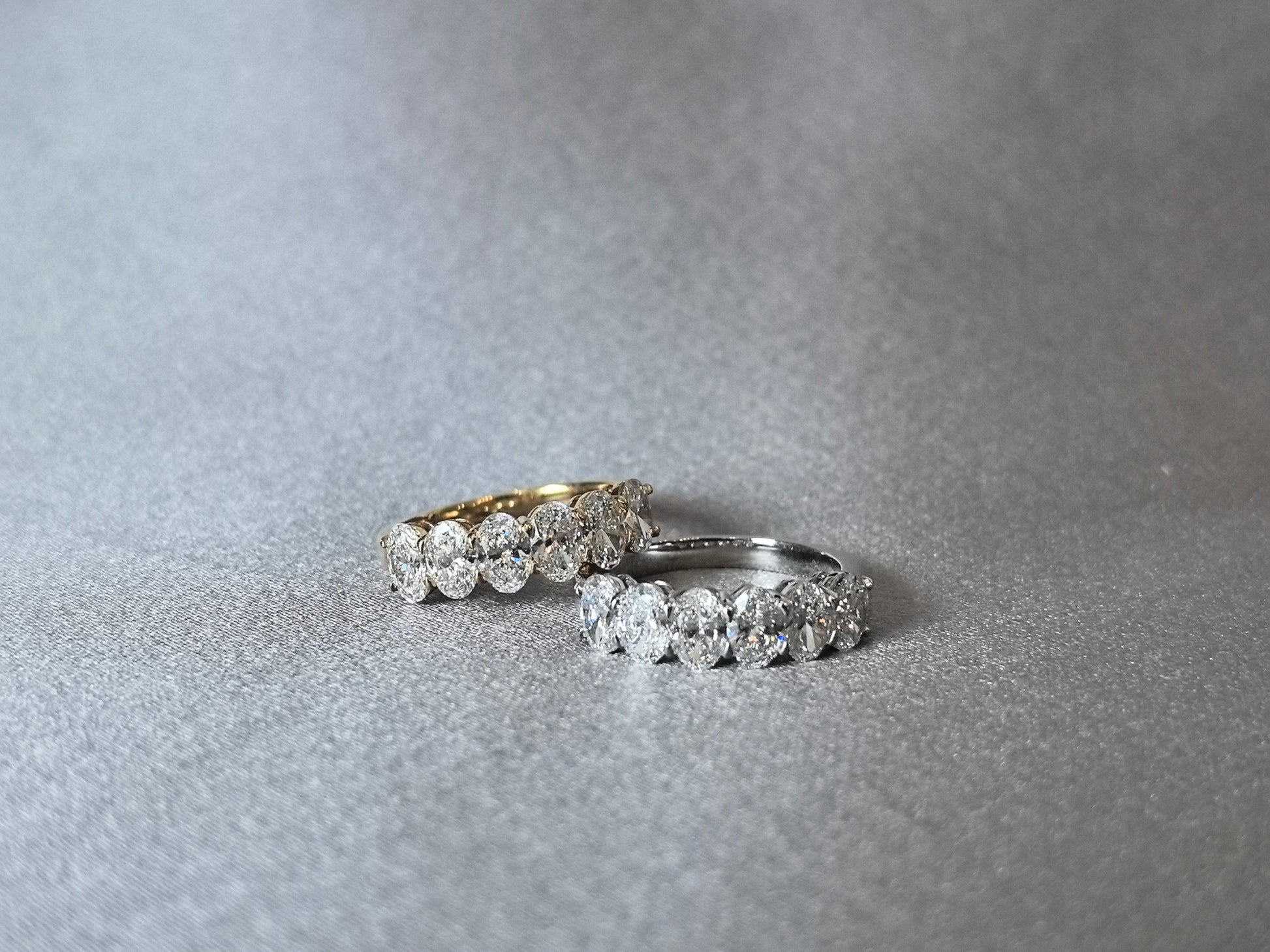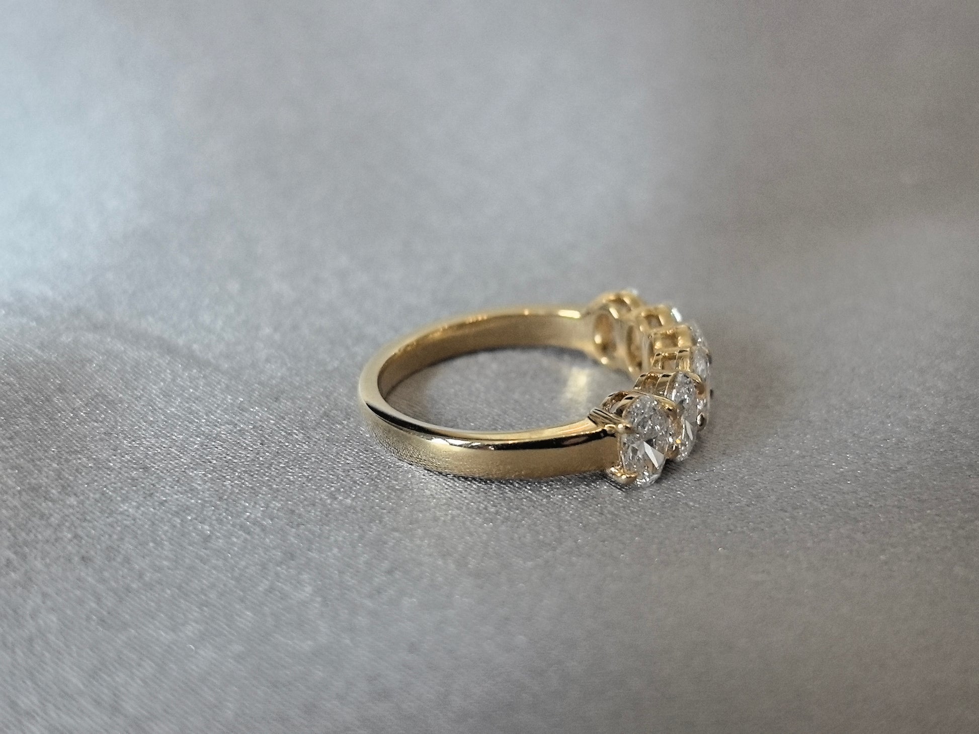 The Oval Five Diamond Half Eternity Band features a striking arrangement of five oval lab-grown diamonds that grace half the band, each weighing 30 points and boasting a luminous cut that enhances their elongated brilliance.