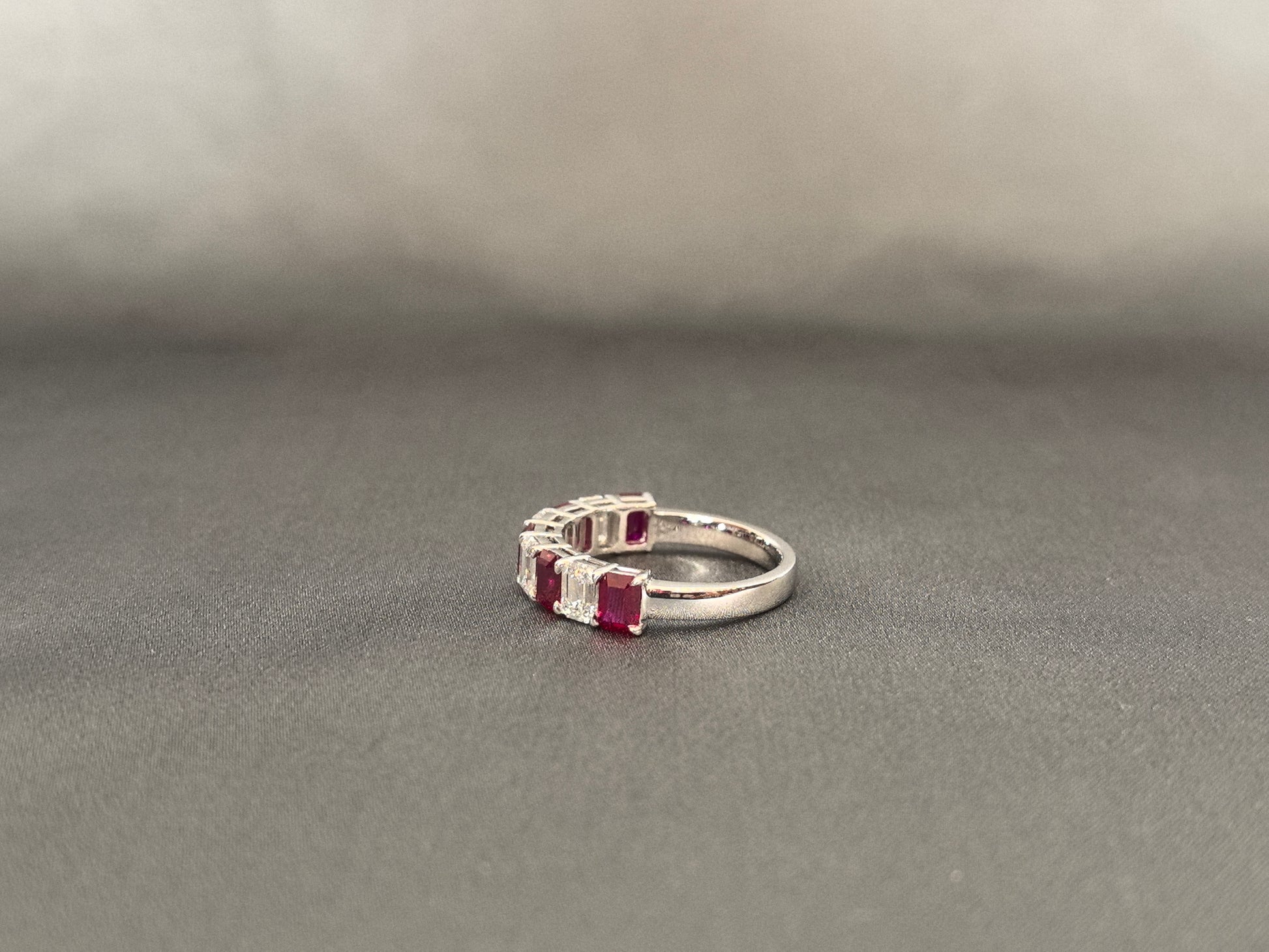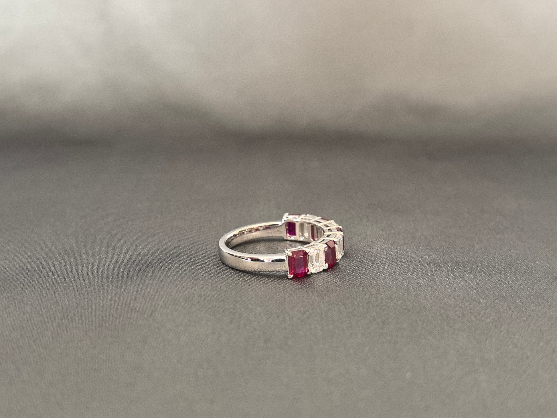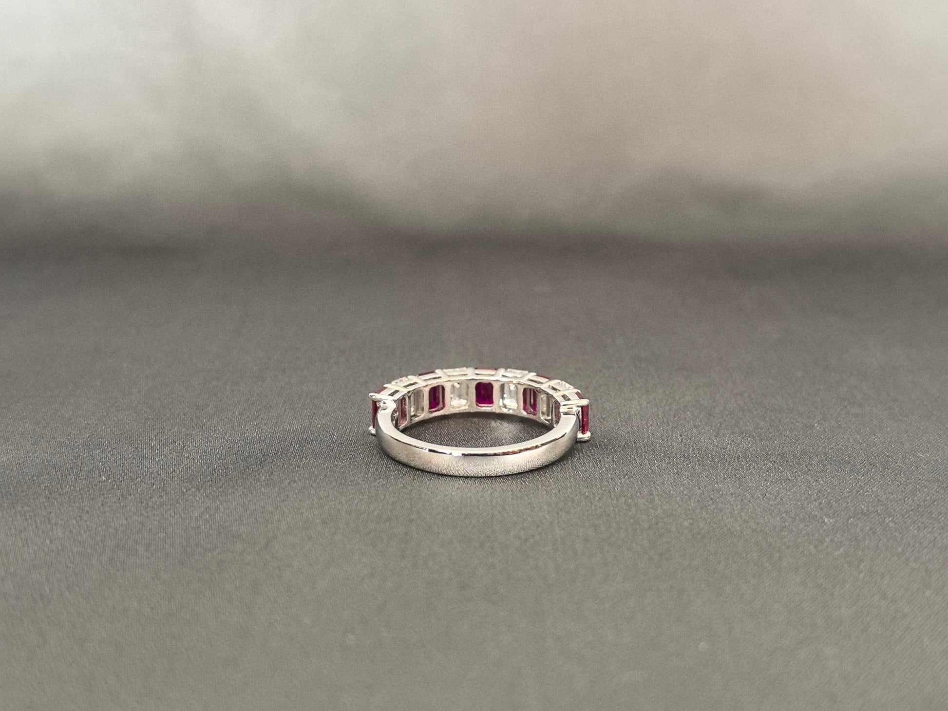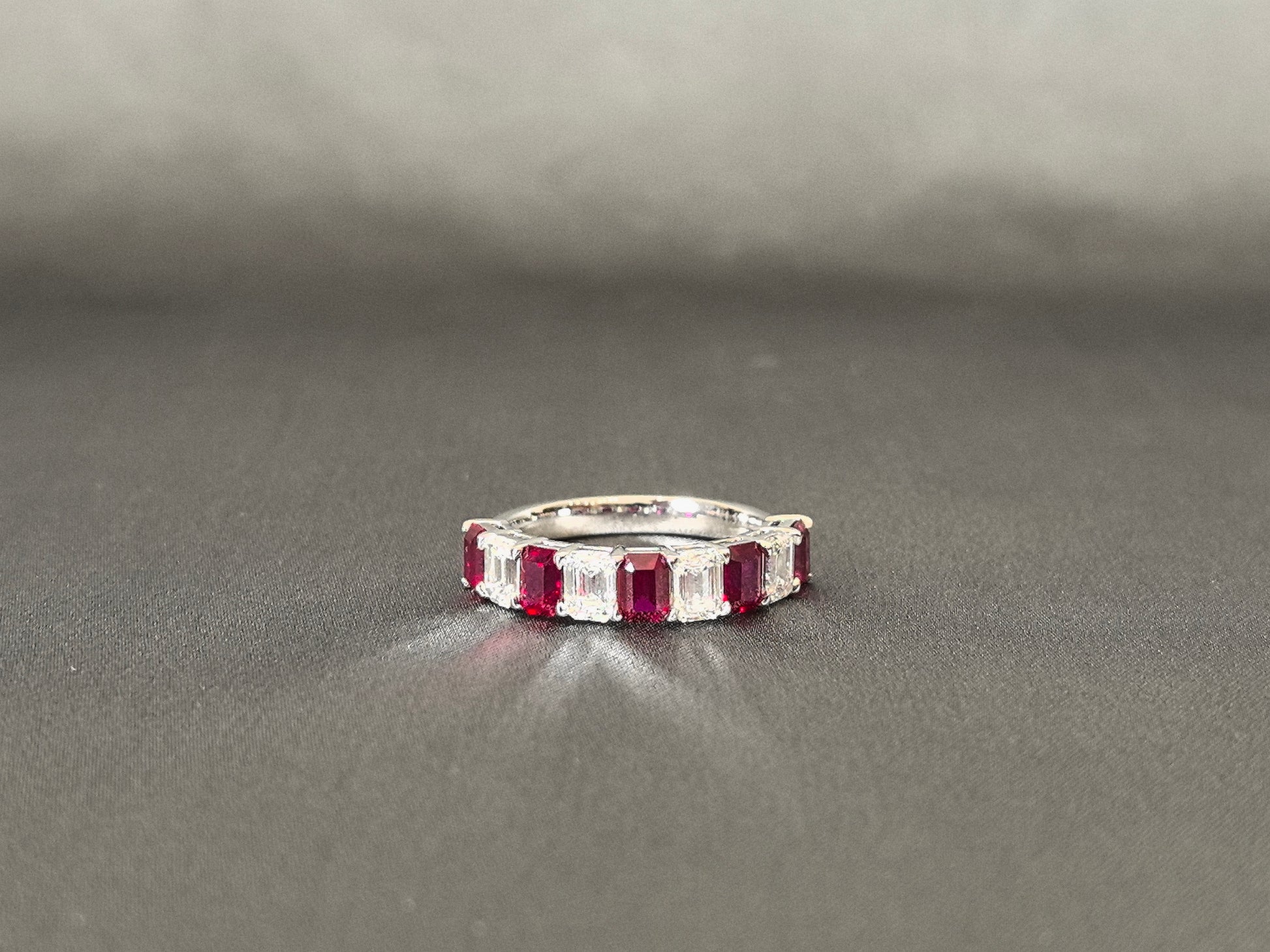 Celebrate the union of vibrant color and timeless sparkle with this exquisite lab gemstone and lab diamond eternity band. Alternating emerald cut lab-grown rubies and diamonds create a striking pattern of rich red and brilliant white, symbolizing passion and purity intertwined. Set in luxurious 14K gold, this band offers a modern yet classic aesthetic, perfect for making a statement on its own or stacking with your favorite rings.