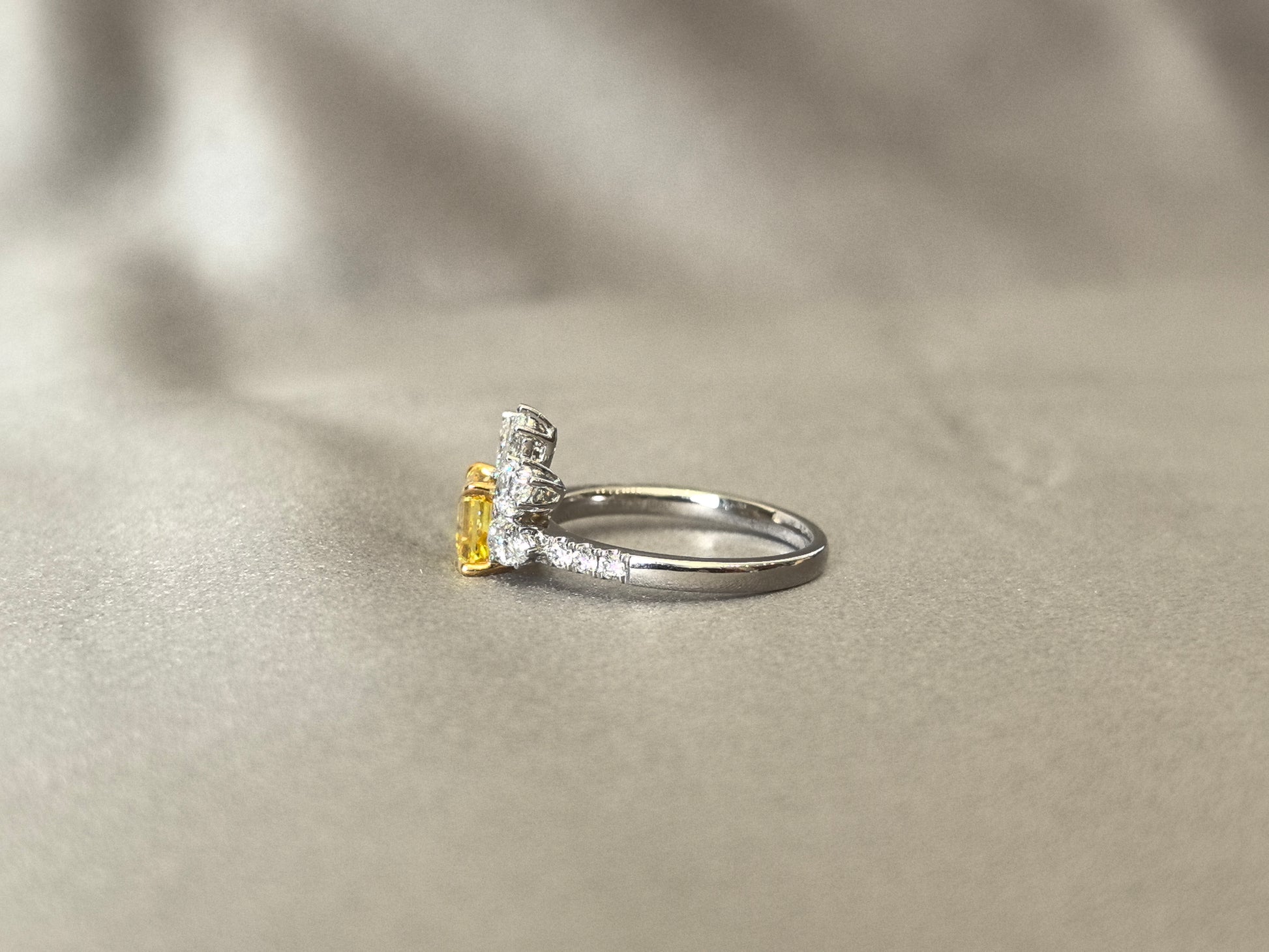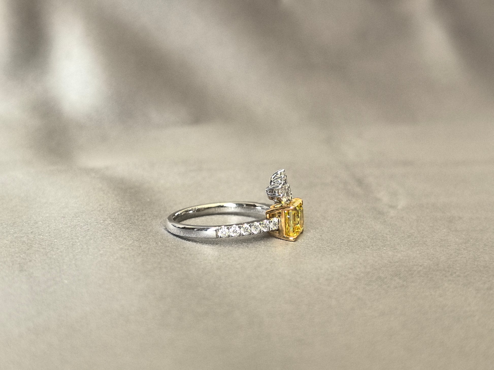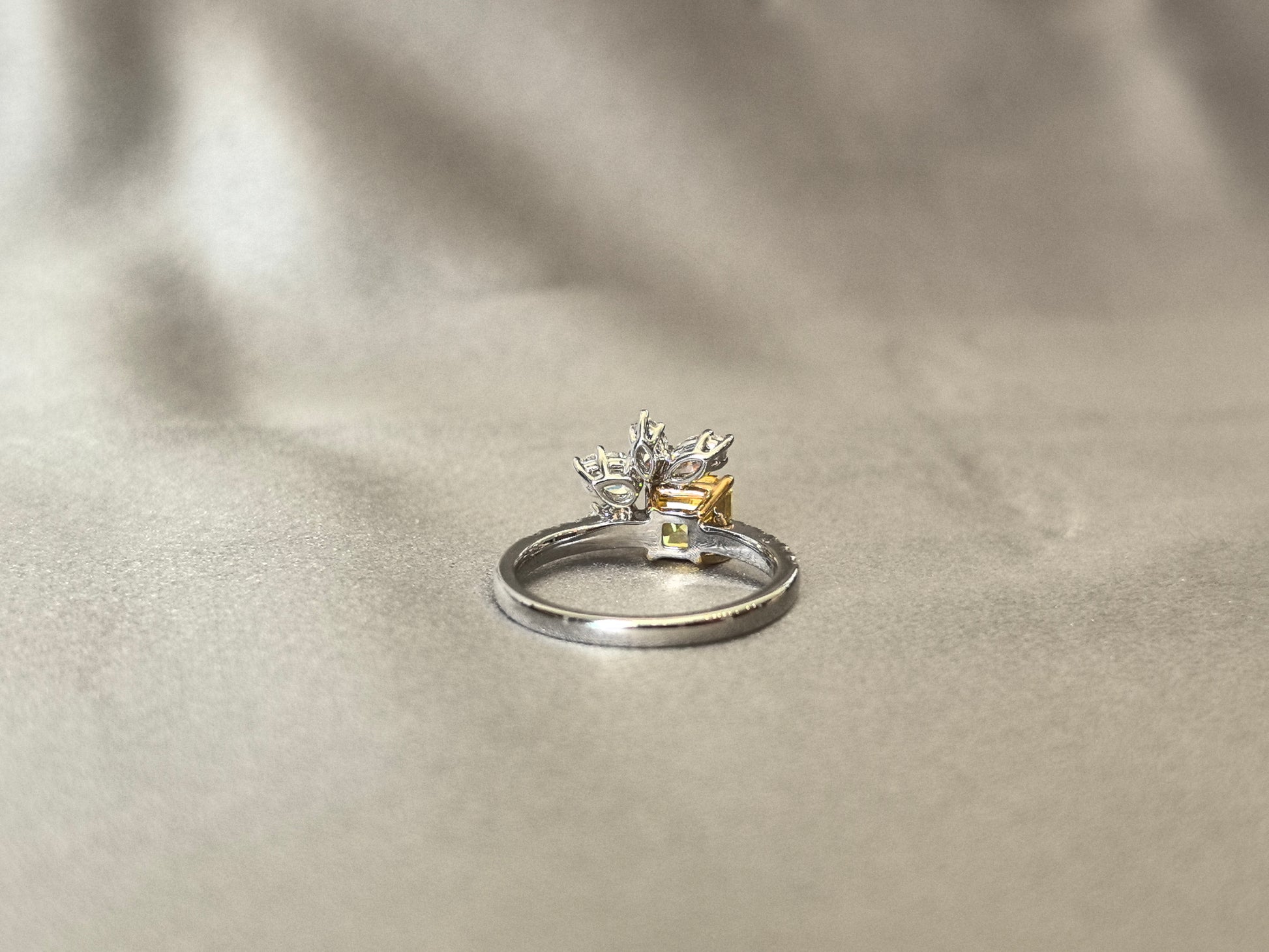 This artistic ring features a vivid yellow Asscher-cut lab-grown diamond as its centerpiece, nestled atop a delicate arrangement of marquise and pear-cut white diamonds that curve like leaves supporting a blossom. Set on a half pavé band, the design merges nature’s organic elegance with geometric precision—where the diamond’s fiery warmth meets frosty brilliance.