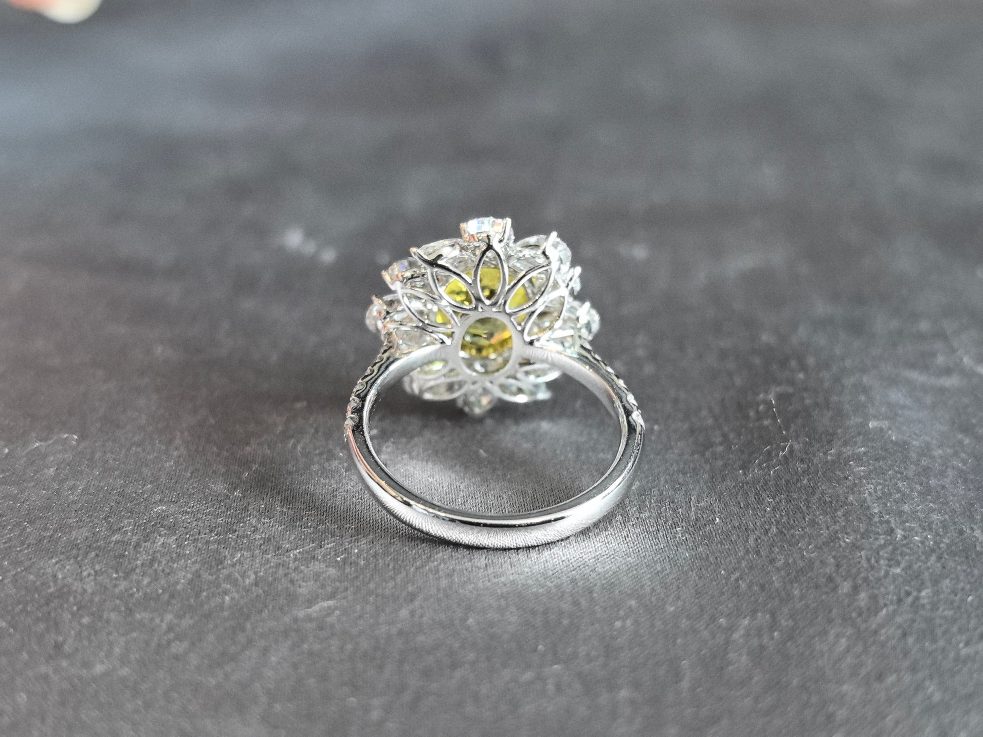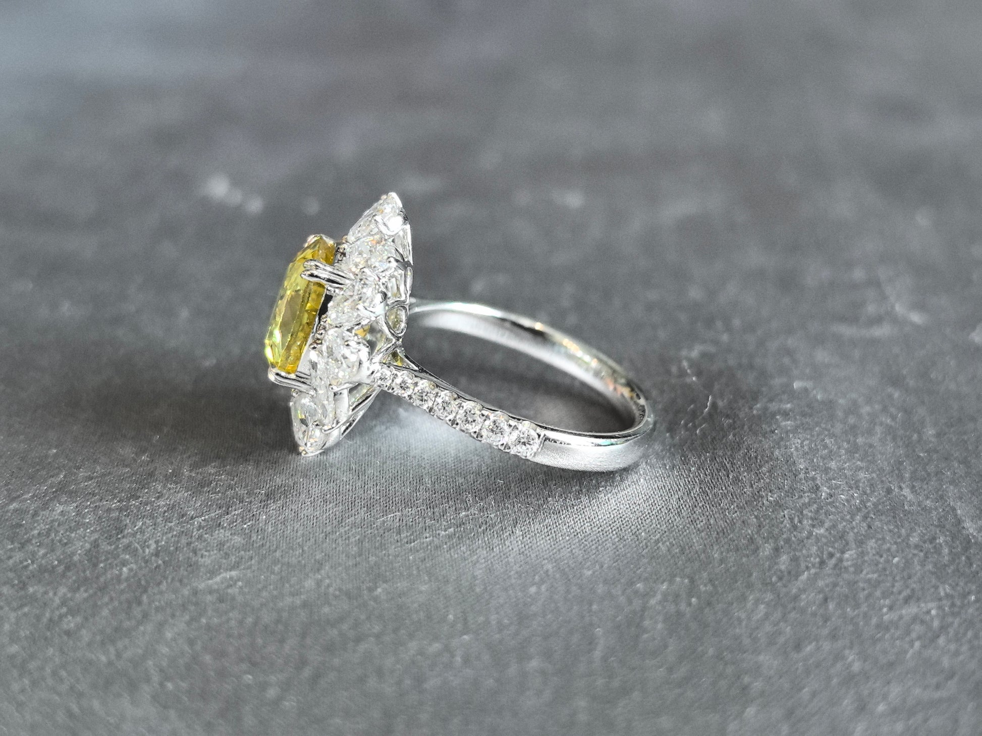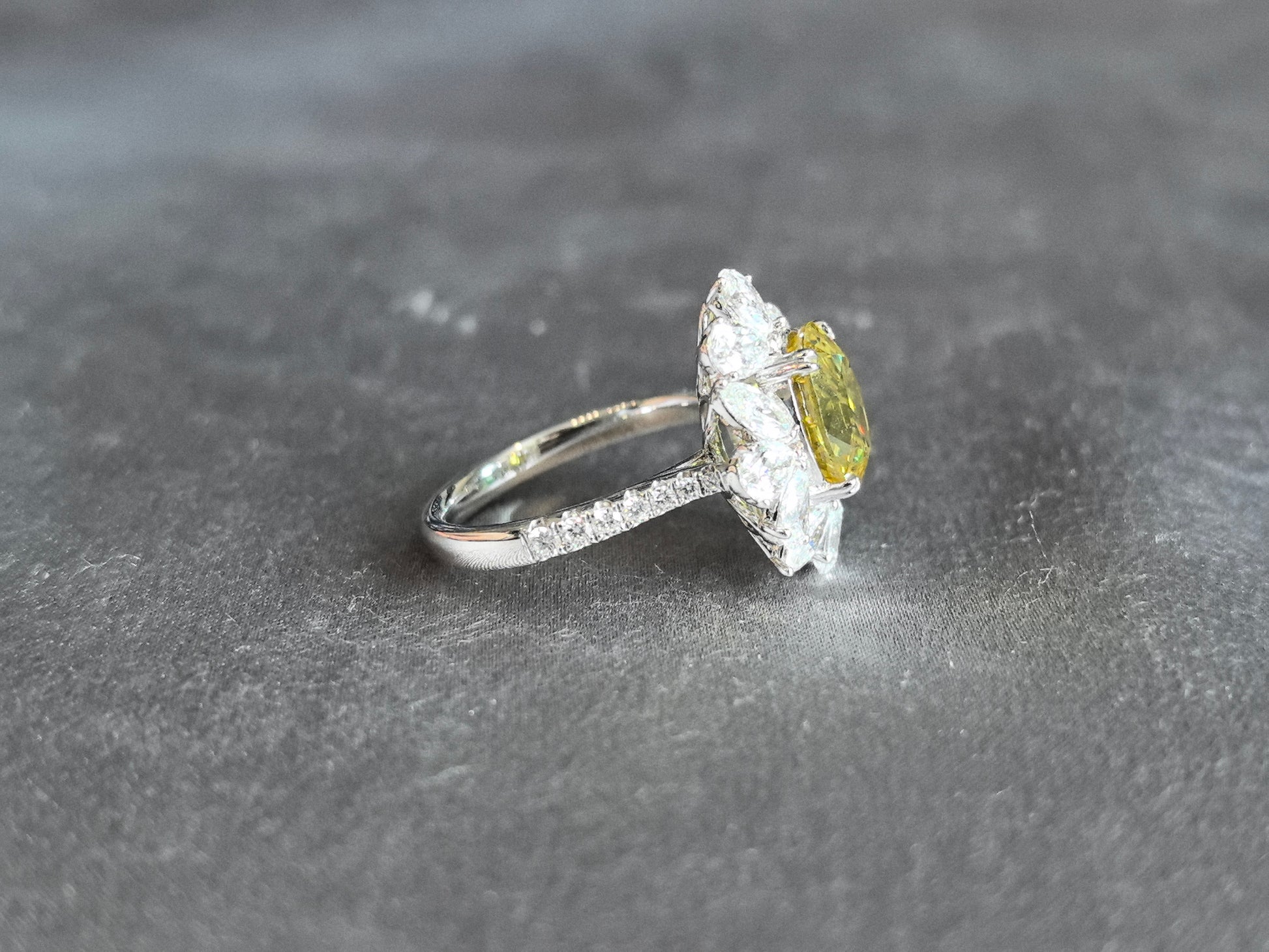 This dazzling ring features a vibrant oval-cut yellow lab-grown diamond at its center, encircled by a dynamic halo of marquise and pear-cut white lab-grown diamonds arranged in an alternating pattern. Set upon a half pavé band, the design evokes the warmth of sunlight breaking through a glistening frost—a perfect harmony of energy and elegance.