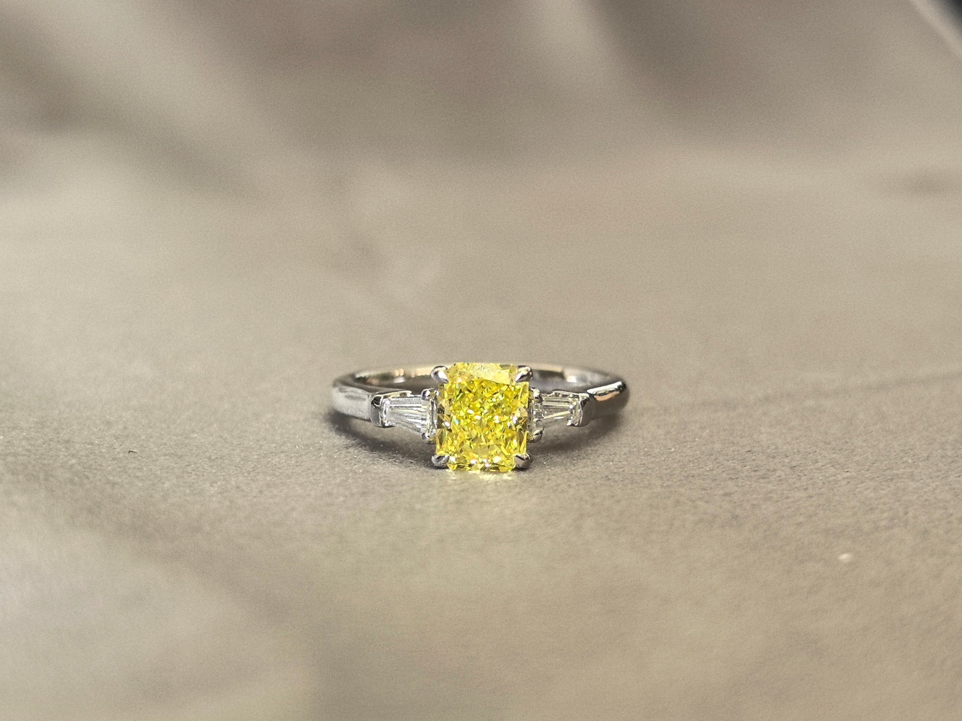 This striking three-stone ring features a vivid cushion-cut yellow lab-grown diamond at its center, flanked by two crisp triangle-cut white lab-grown diamonds. The design juxtaposes the yellow diamond’s sunny warmth with the geometric precision of the white side stones, all set on a minimalist plain band—a modern symbol of clarity, energy, and unwavering commitment.