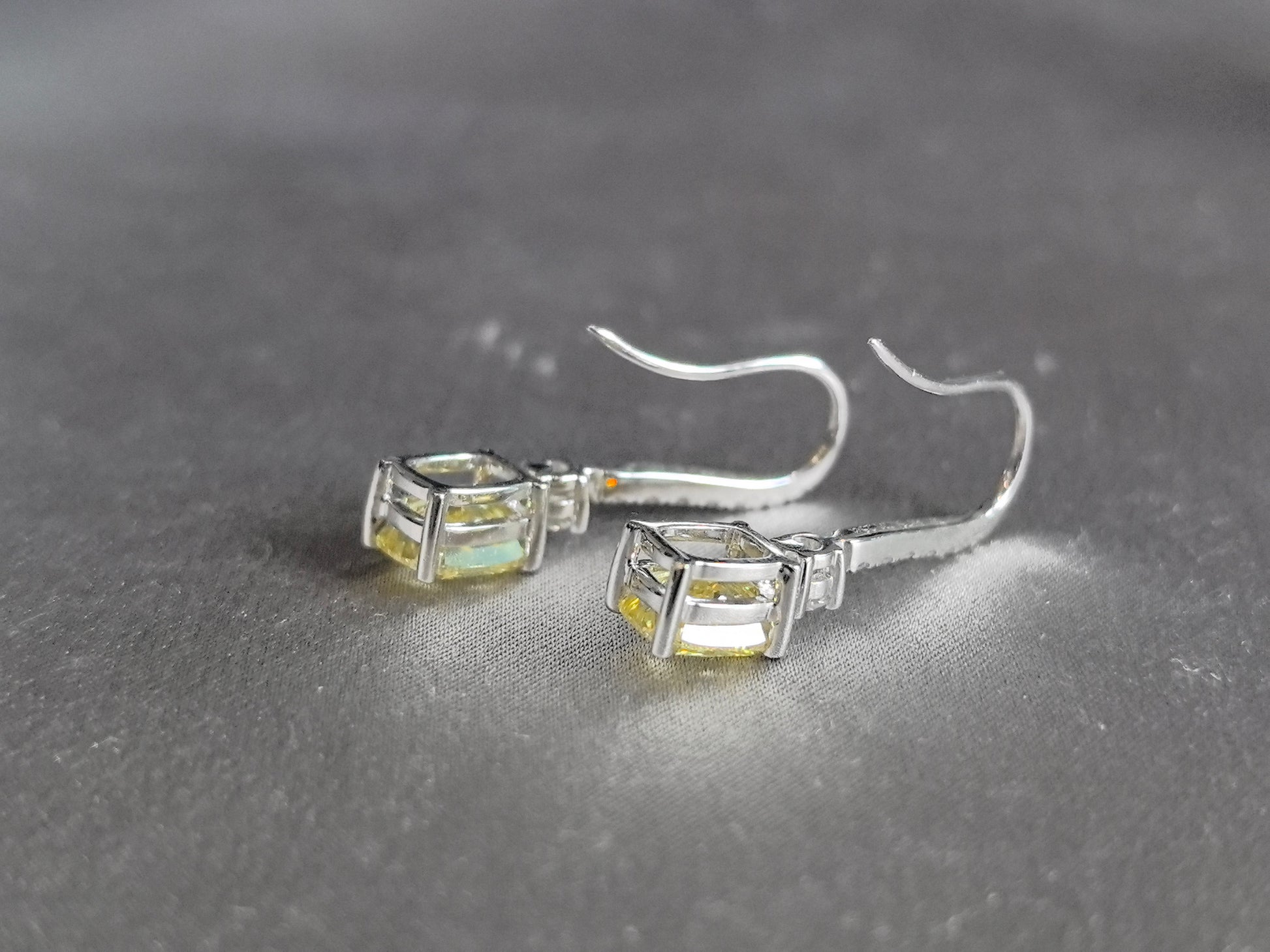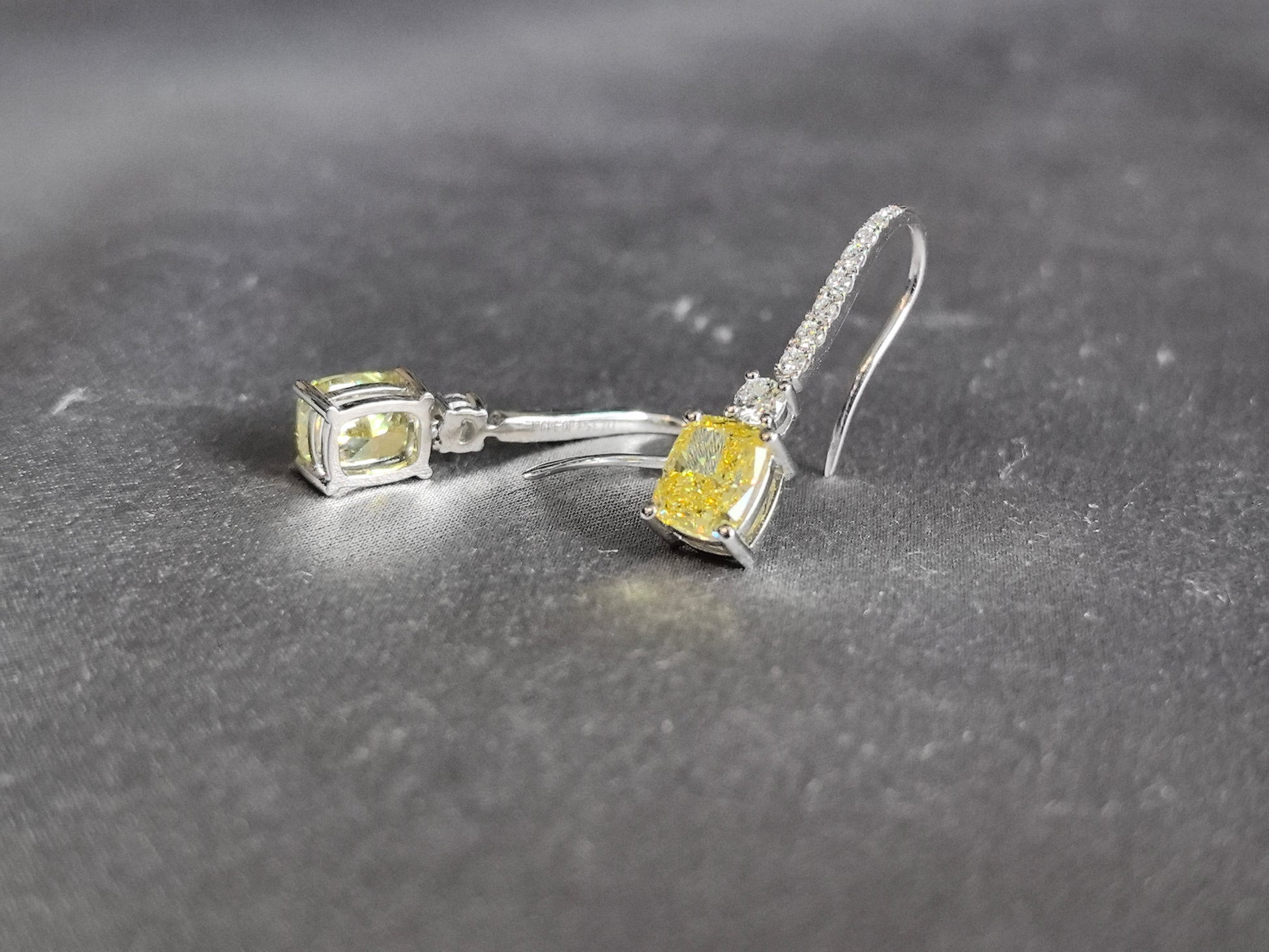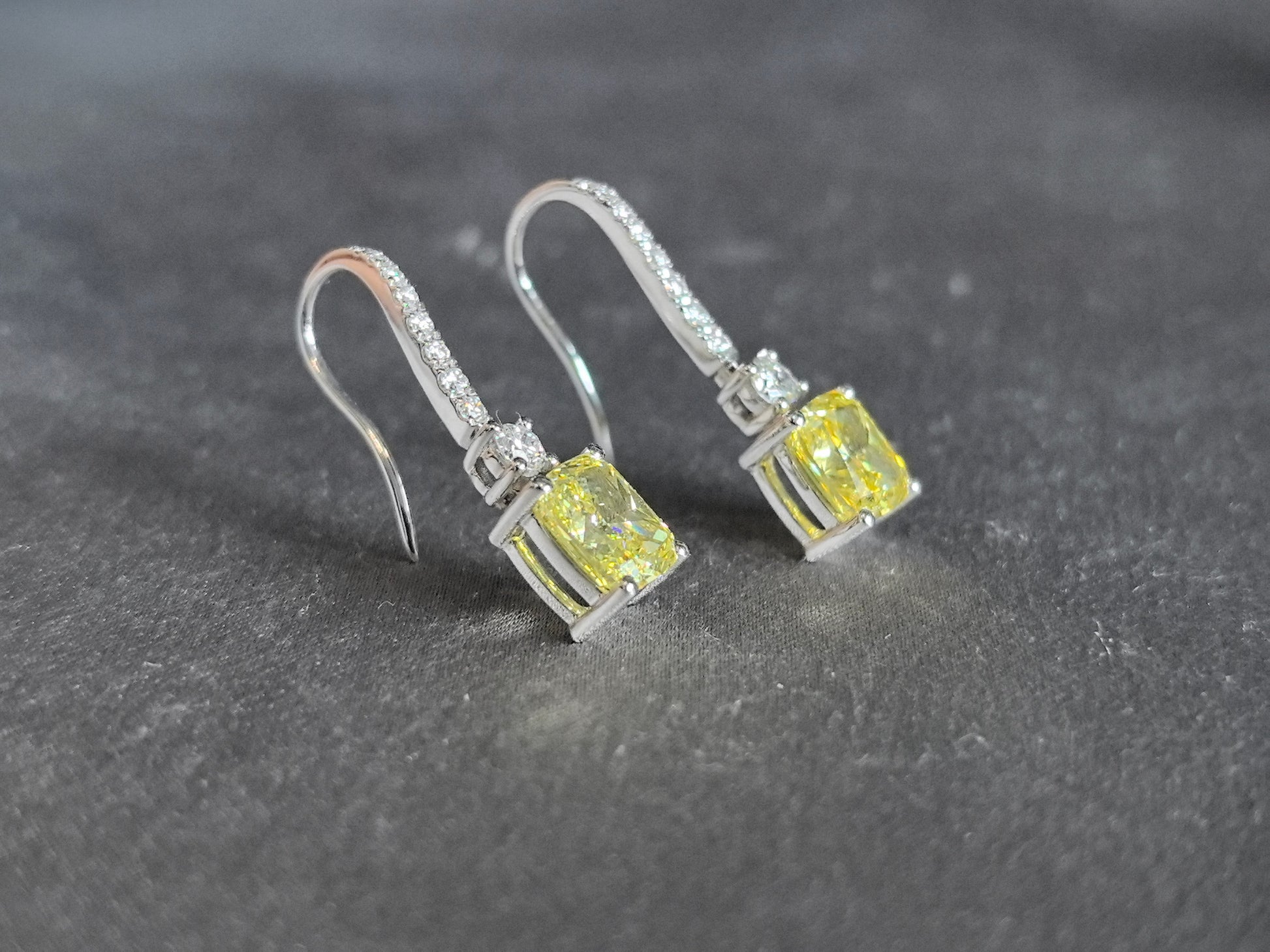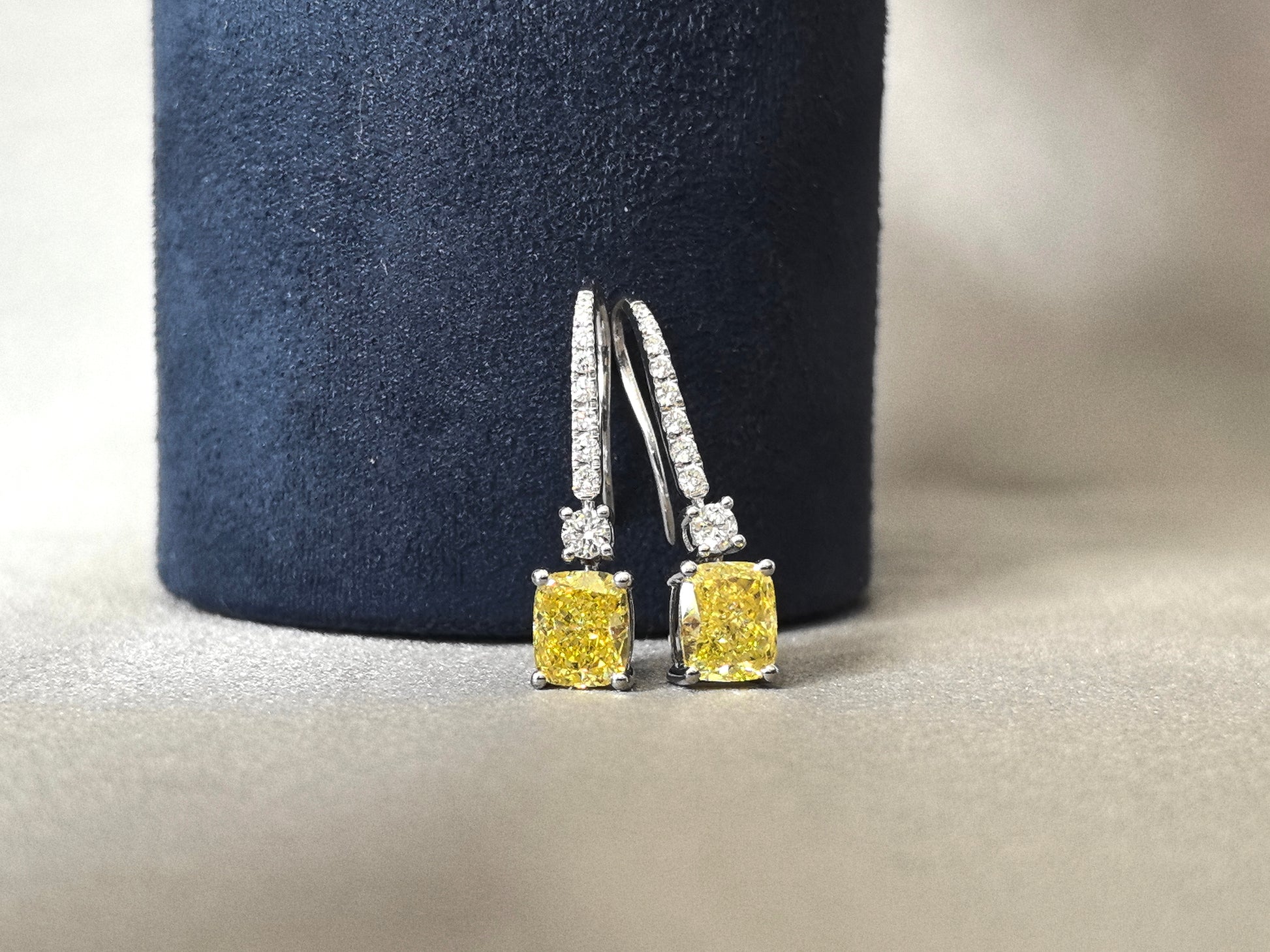 These captivating dangle earrings feature a vibrant cushion-cut vivid yellow lab-grown diamond suspended from each ear hook, accented with delicate white diamond pavé details. The combination of the yellow diamond’s warm glow and the white diamonds’ icy sparkle creates a dynamic, eye-catching piece that moves with effortless grace—a celebration of light and luxury.