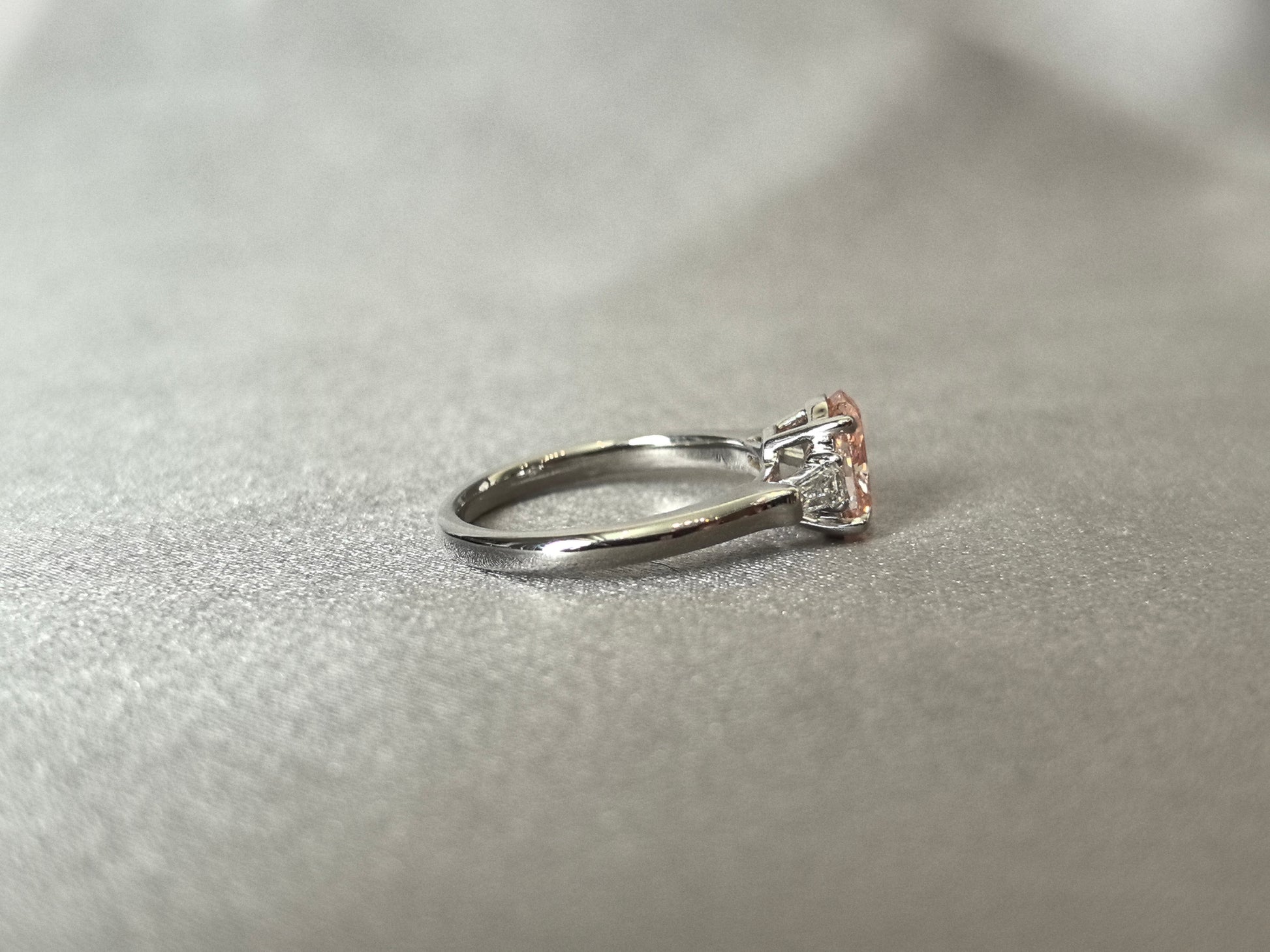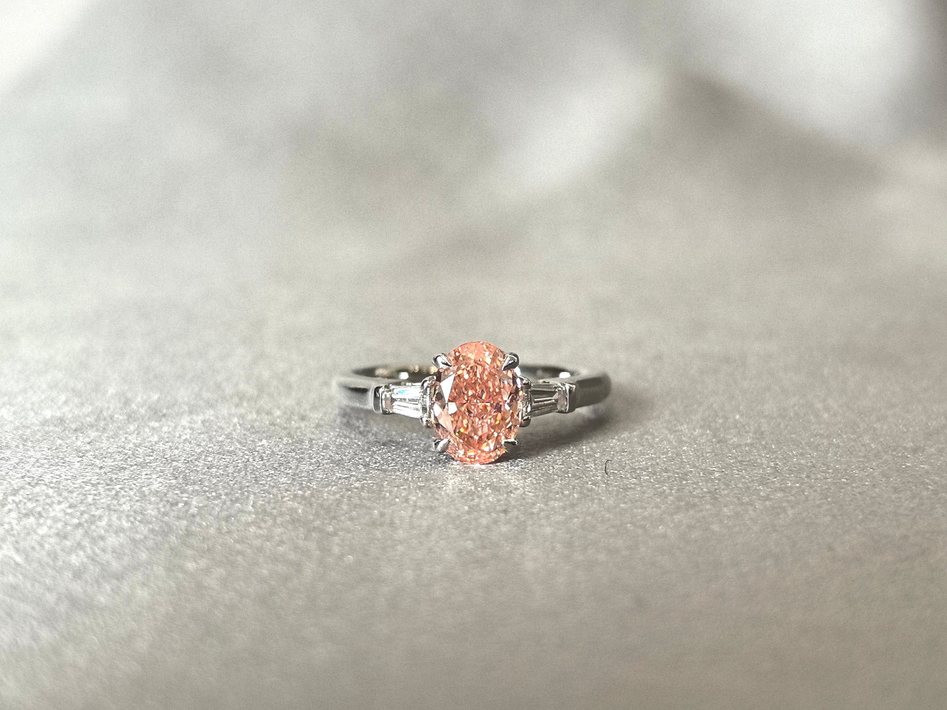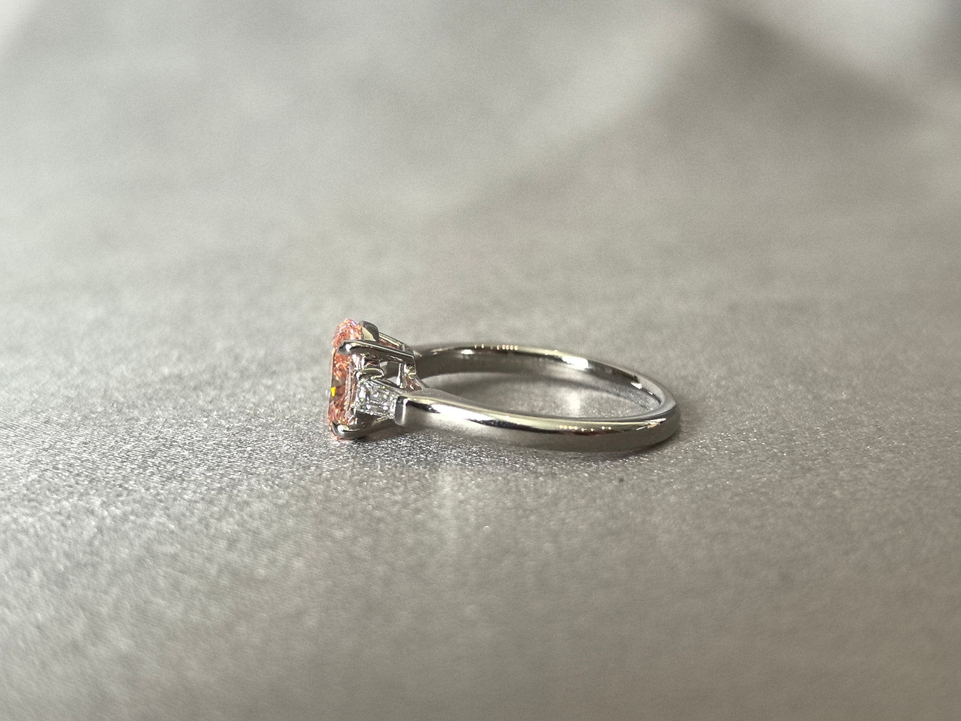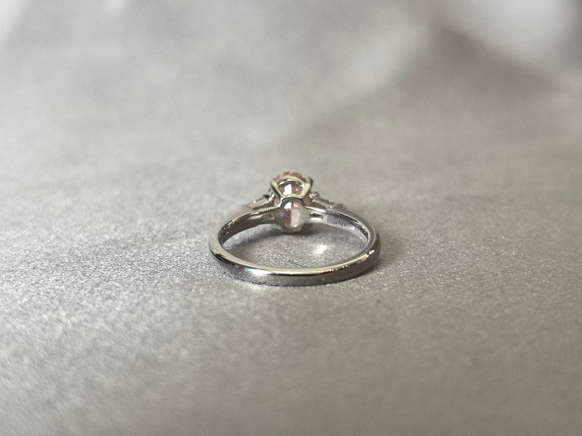 This elegantly unconventional three-stone ring features an oval-cut pink lab-grown diamond at its center, flanked by a baguette-cut lab-grown diamond on one side and a triangle-cut lab-grown diamond on the other. The design marries the oval’s gentle curves with the geometric precision of the side stones, symbolizing harmony between warmth and strength, all set on a minimalist plain band for timeless appeal.