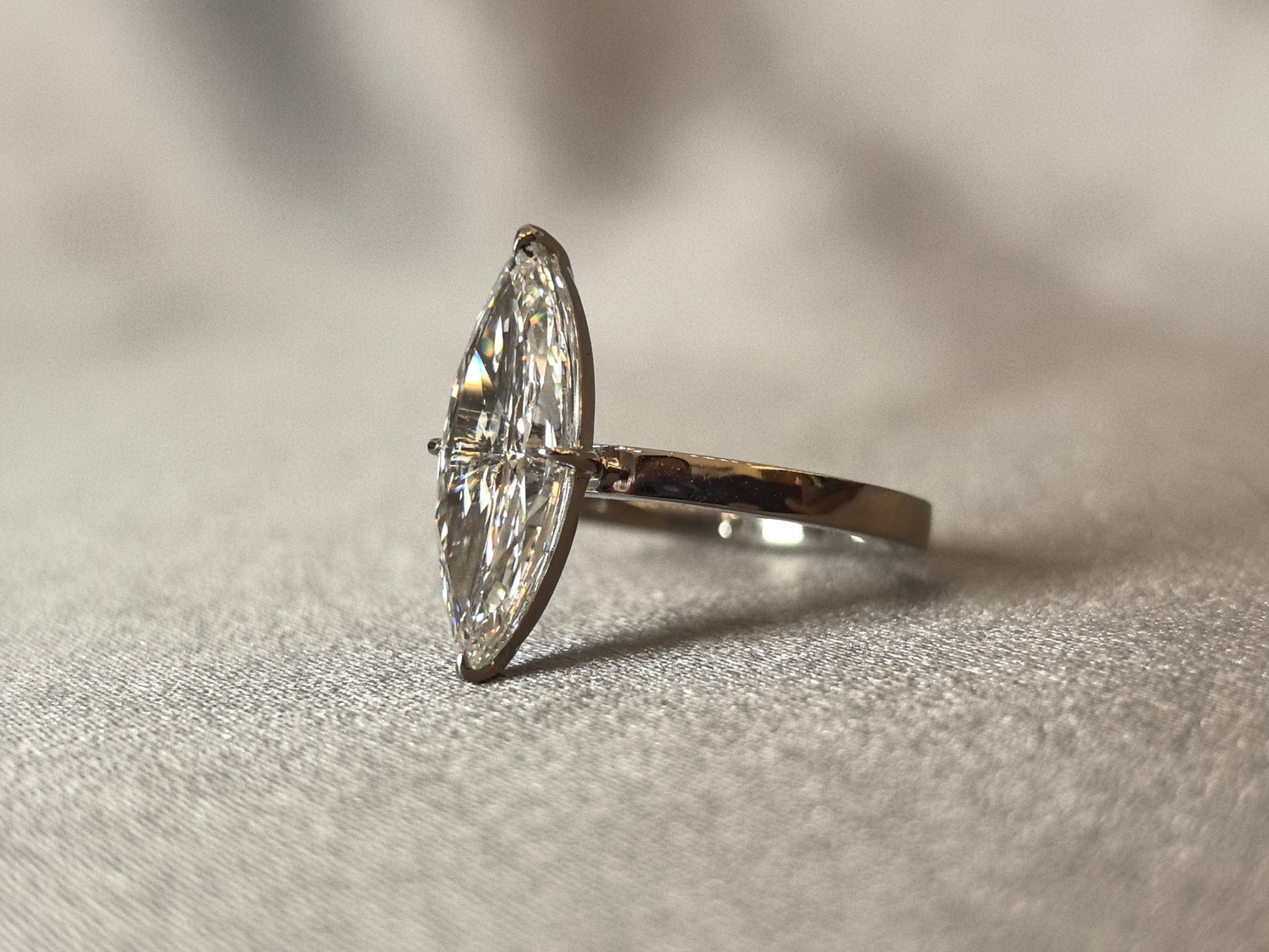 Upon this seamless track rests a single, decisive element: a low-set marquise-cut lab-grown diamond. The marquise’s elongated form is not merely set upon the band; it is embedded within its line, becoming a luminous interruption in the metal’s flow. The low profile ensures it sits flush, catching light with a sharp, contained sparkle that whispers rather than shouts.