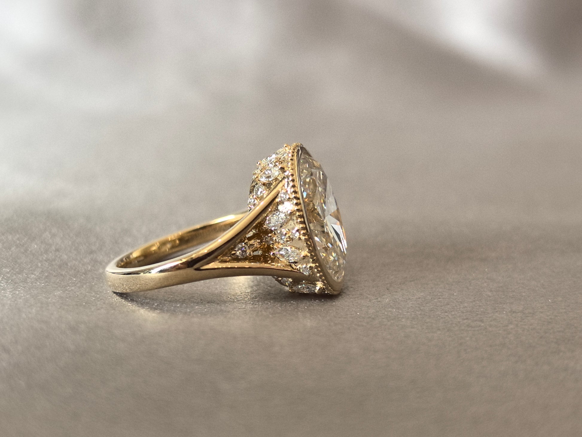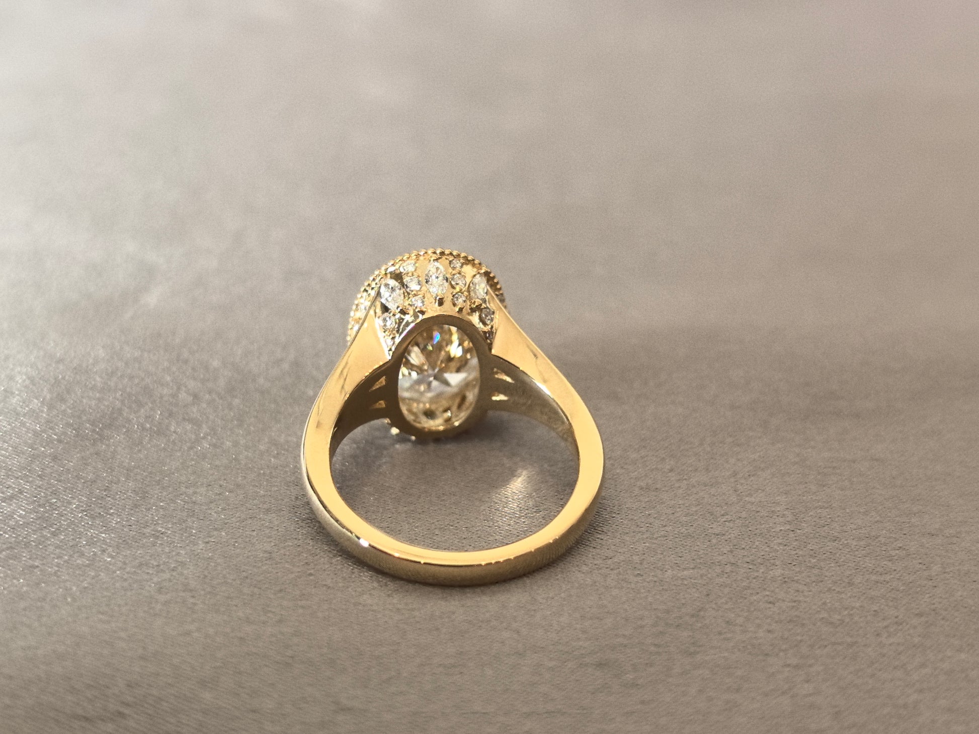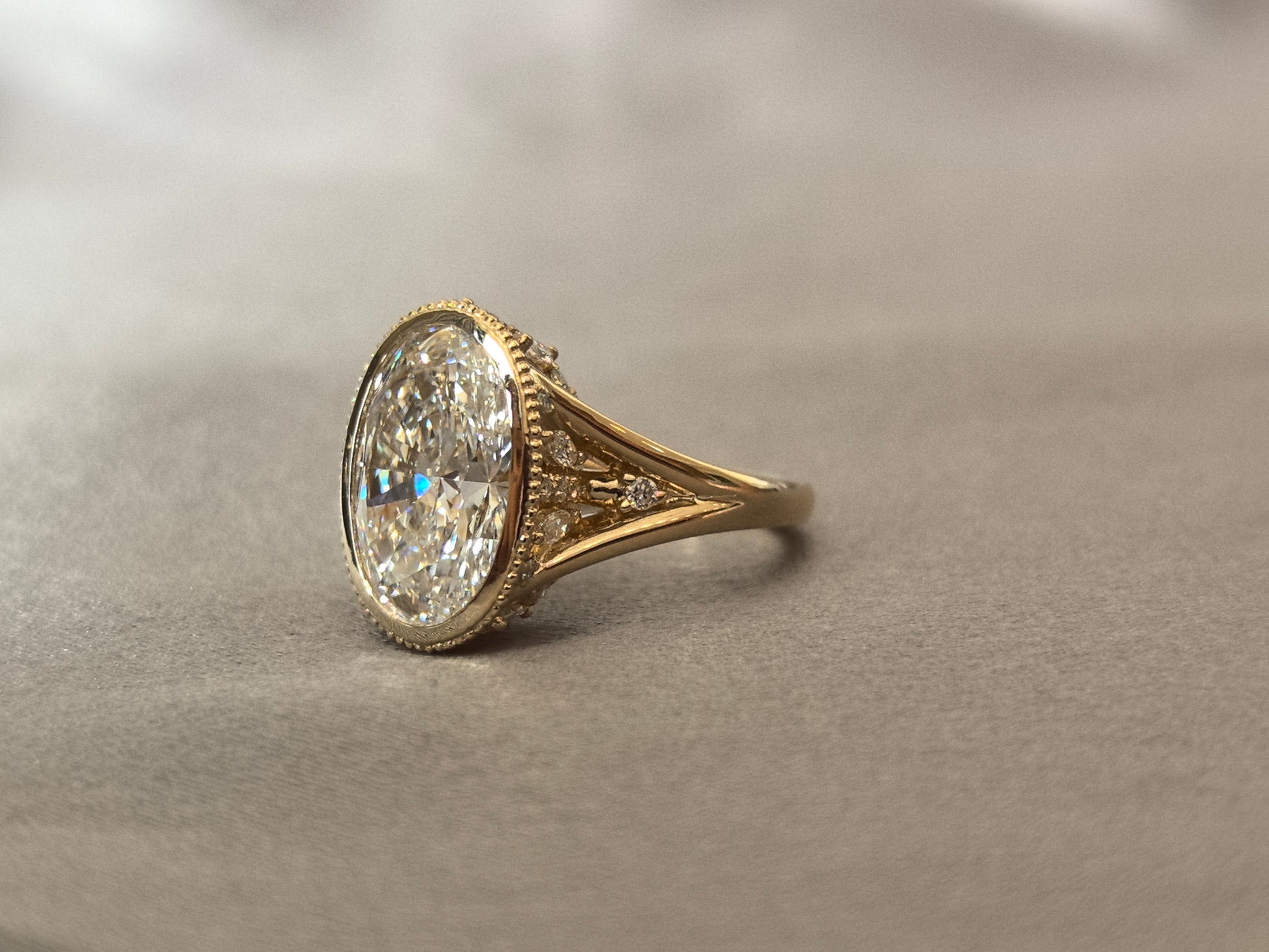 Oval-shaped ring setting | Lab-created diamond | Small diamonds of varying sizes set on the sides and bottom | Split shank | Vintage Athenian style design