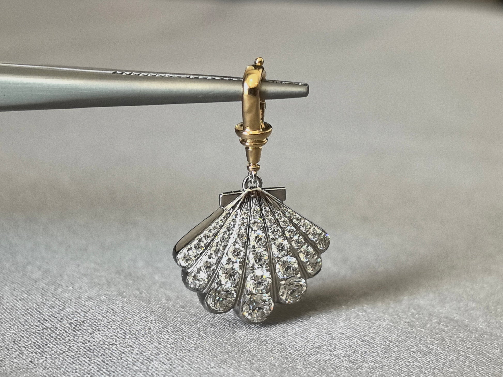Embrace the ocean’s elegance with this exquisite shell-shaped pendant, where nature’s artistry meets masterful craftsmanship. The front dazzles with a full pavé of lab-grown diamonds, capturing the shimmer of sunlight on sea foam, while the reverse features intricate shell texture, etched into 18K gold for a tactile, organic touch. Suspended from a delicate chain, this piece symbolizes harmony between luxury and the natural world, perfect for those who cherish both brilliance and meaning. contemporary minimalism.